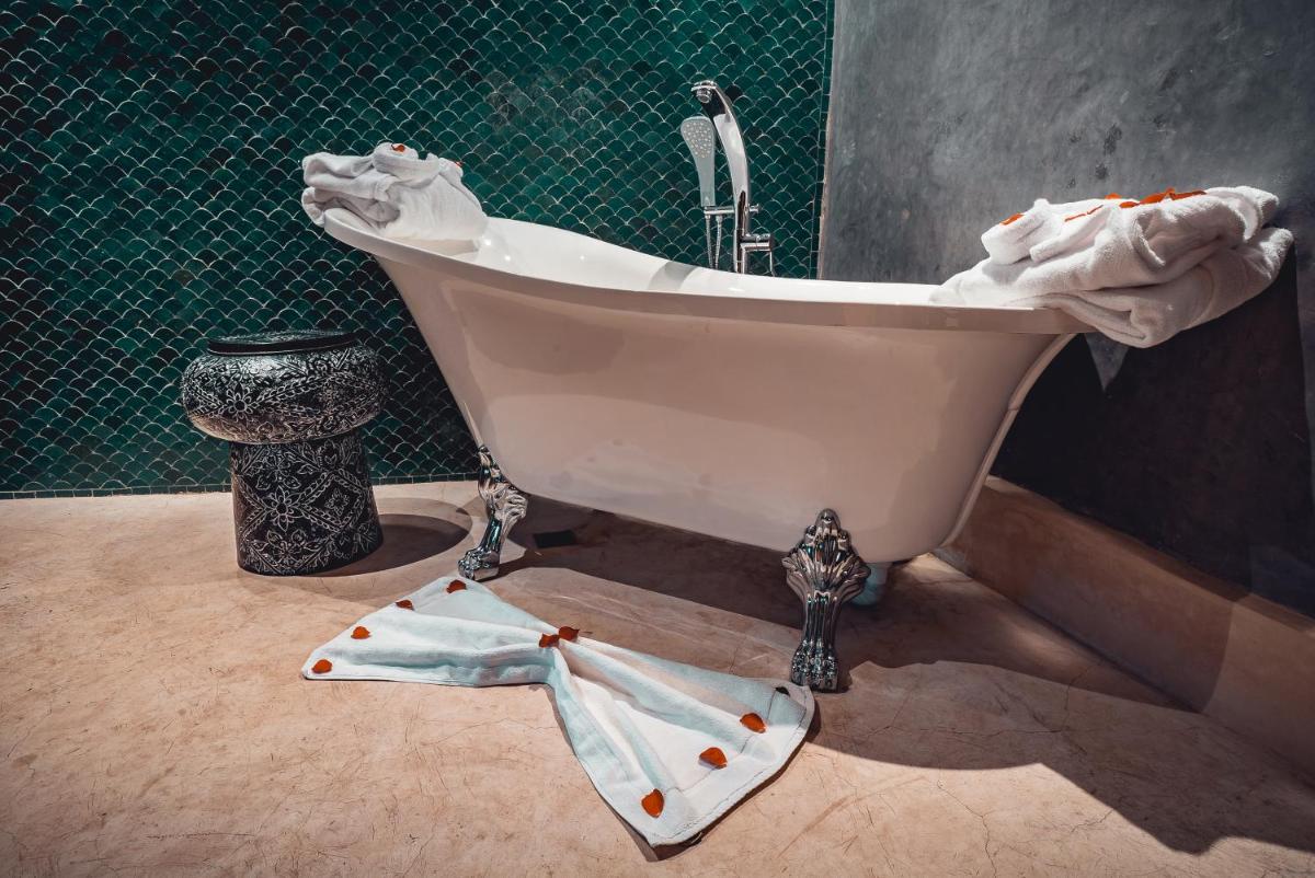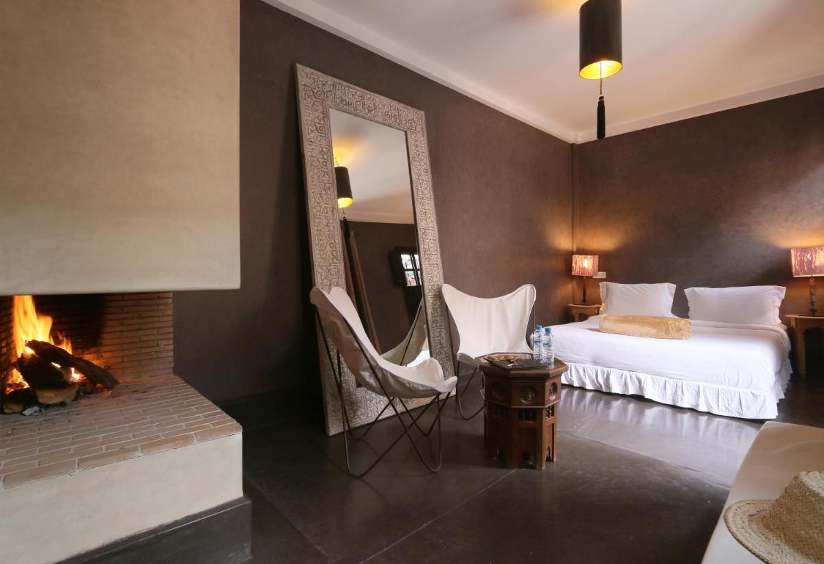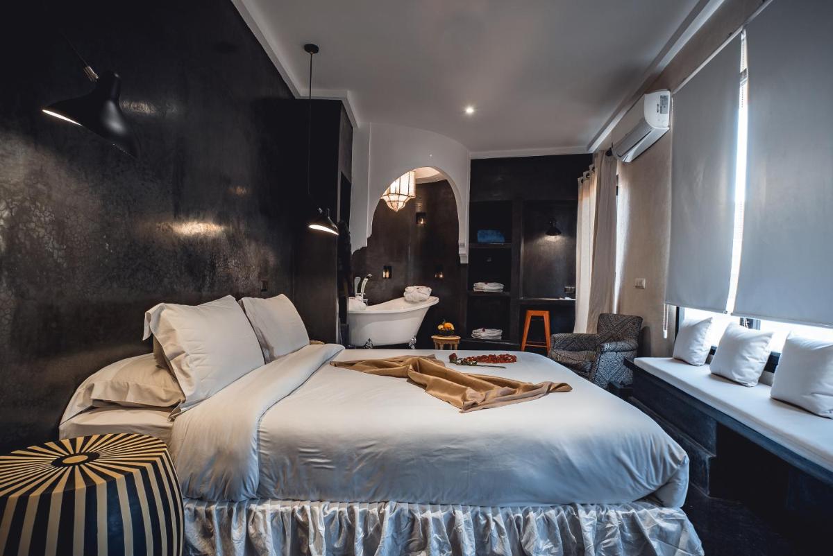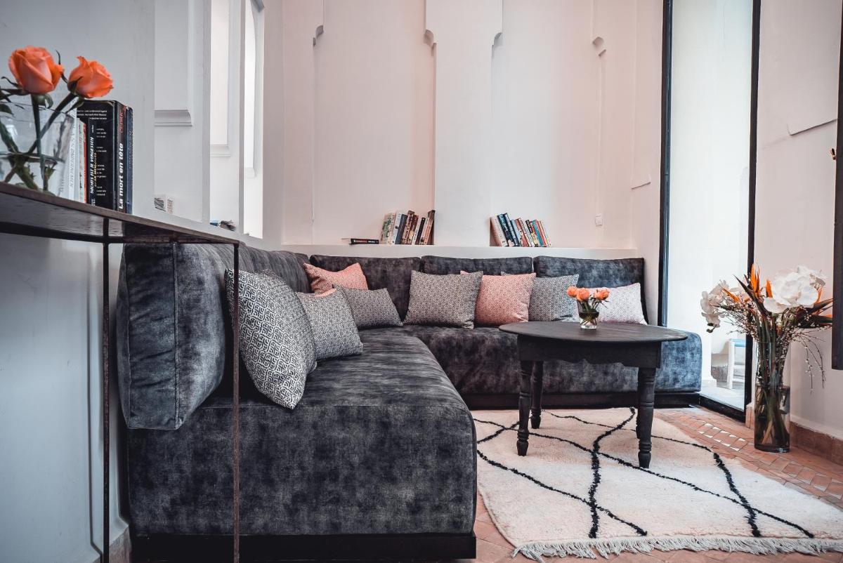 Das Riad zeichnet sich durch sein traditionelles Design aus, reich an warmen Farben, handgefertigten Zellige-Fliesen und Decken aus Zedernholz. Der Innenhof ist eine kühle Oase mit Zitrusbäumen und einem kleinen Pool. Jedes Zimmer ist einzigartig, mit antiken Möbeln und marokkanischen Stoffen eingerichtet und bietet eine Atmosphäre der Intimität und des Charmes.