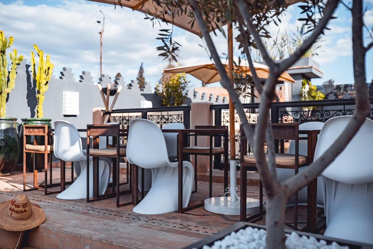 Die Dachterrasse ist ein wunderbarer Ort, um die marokkanische Sonne und den Blick über die Dächer der Medina zu genießen. Sie ist mit bequemen Liegen ausgestattet und bietet schattige Bereiche zur Entspannung. Hier wird ein reichhaltiges Frühstück serviert, und es ist ein idealer Ort, um bei Sonnenuntergang traditionellen Minztee in einer Atmosphäre der völligen Gelassenheit zu schlürfen.