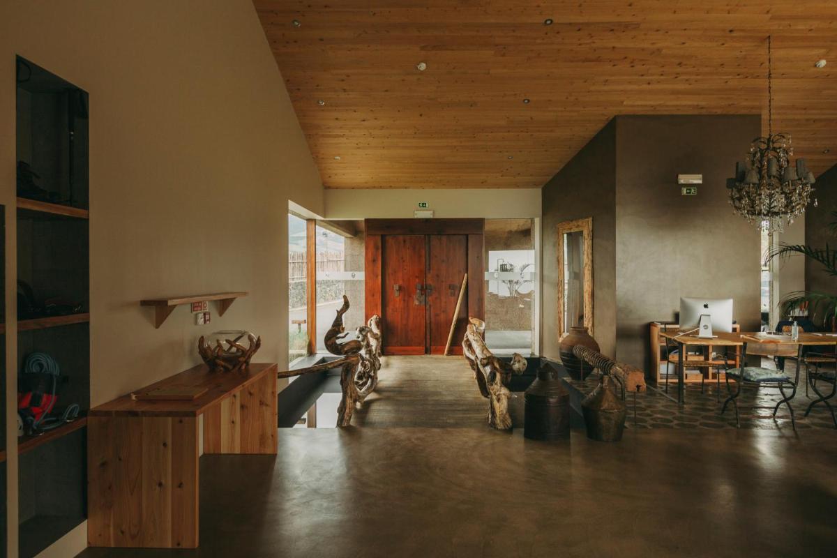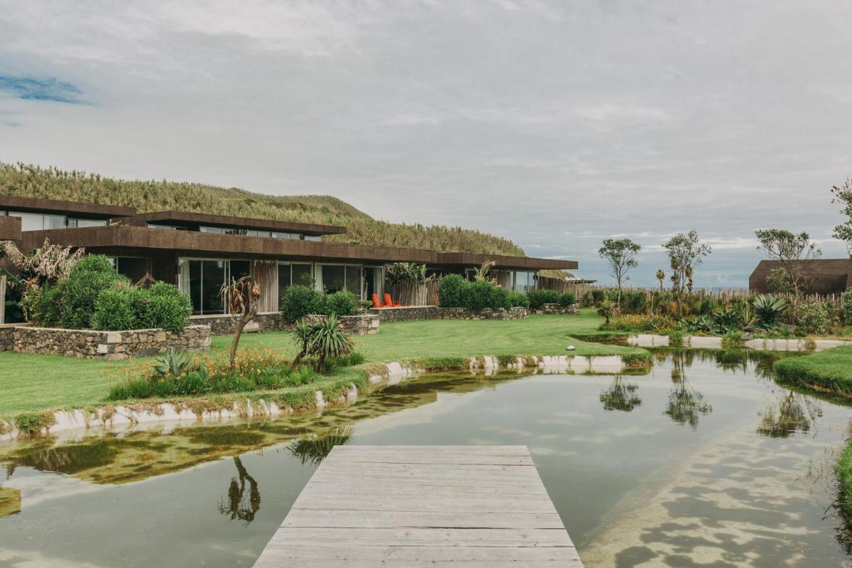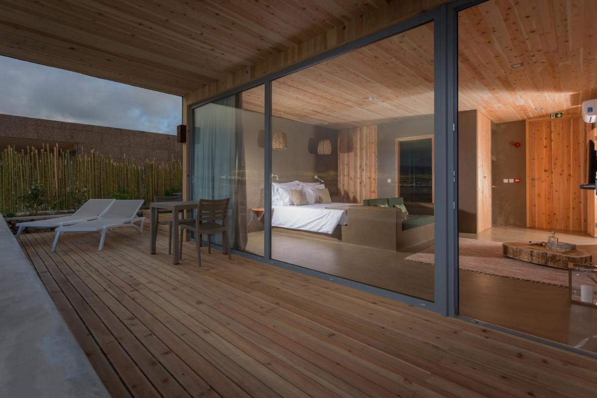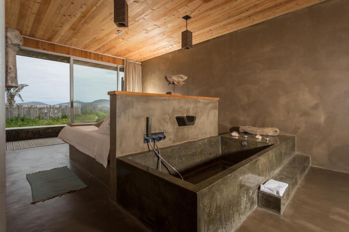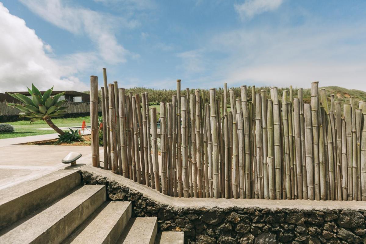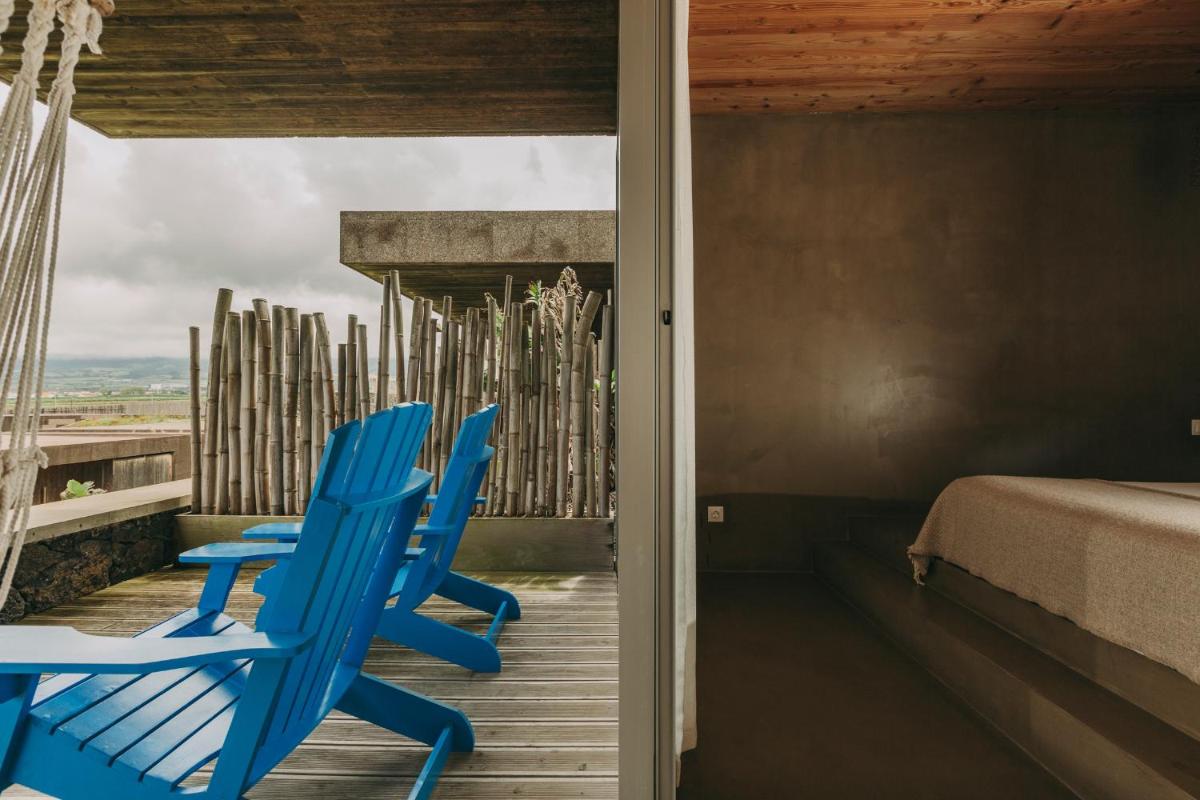 Die Villen sind aus natürlichen Materialien wie Holz und Kork gebaut und so konzipiert, dass sie perfekt mit der vulkanischen Küste verschmelzen. Jede Unterkunft ist ein Beispiel für umweltfreundlichen Luxus mit großen Glasfronten. Ein besonderes Detail ist die private Außendusche in vielen Villen, ideal für eine Erfrischung unter dem Himmel der Azoren nach dem Surfen.