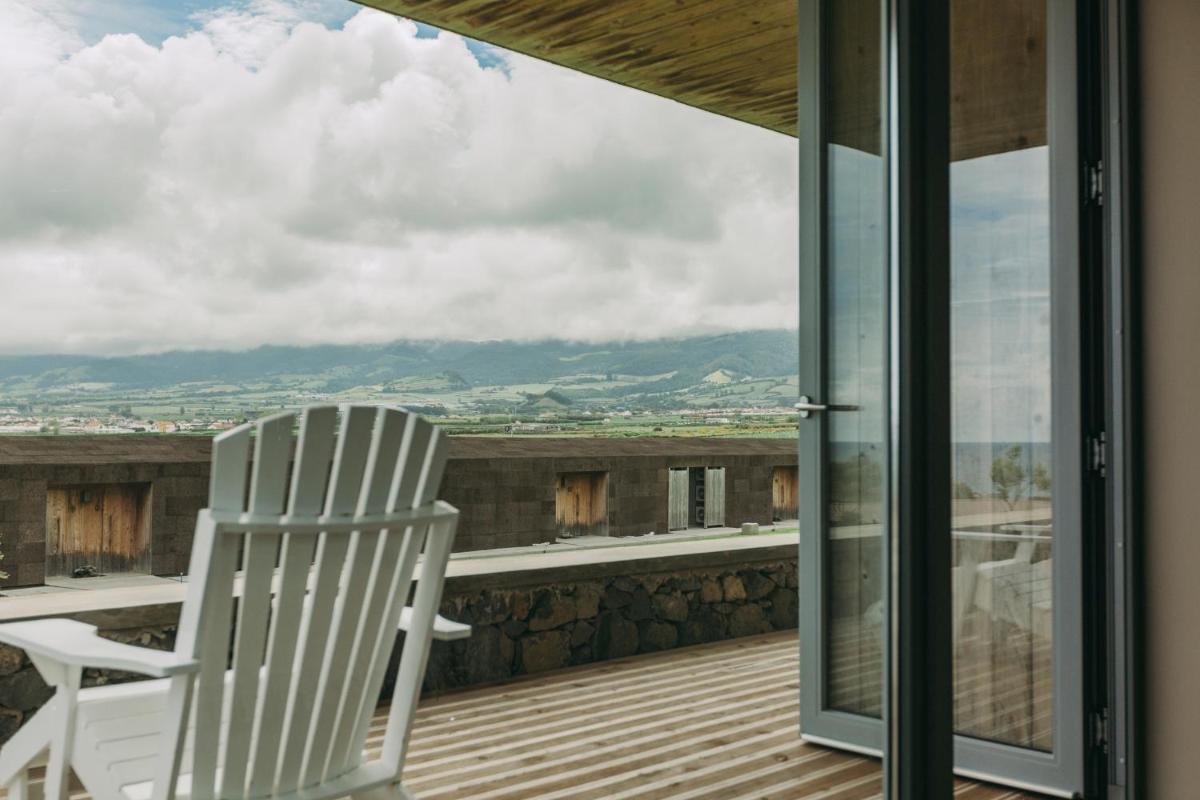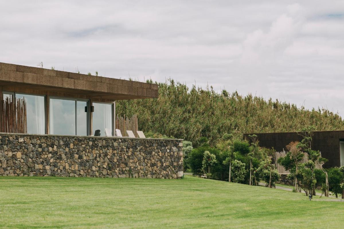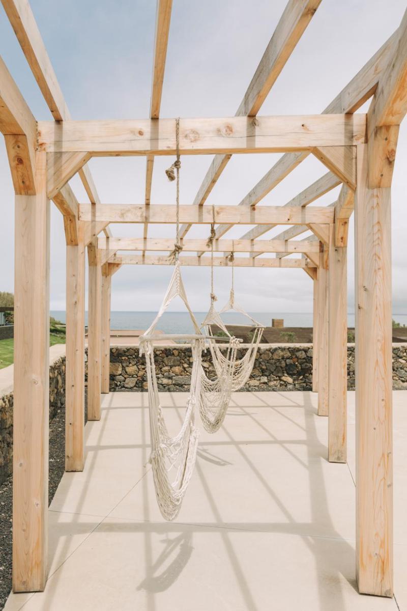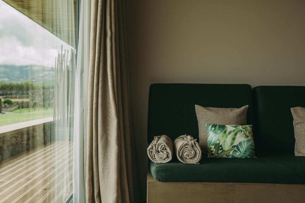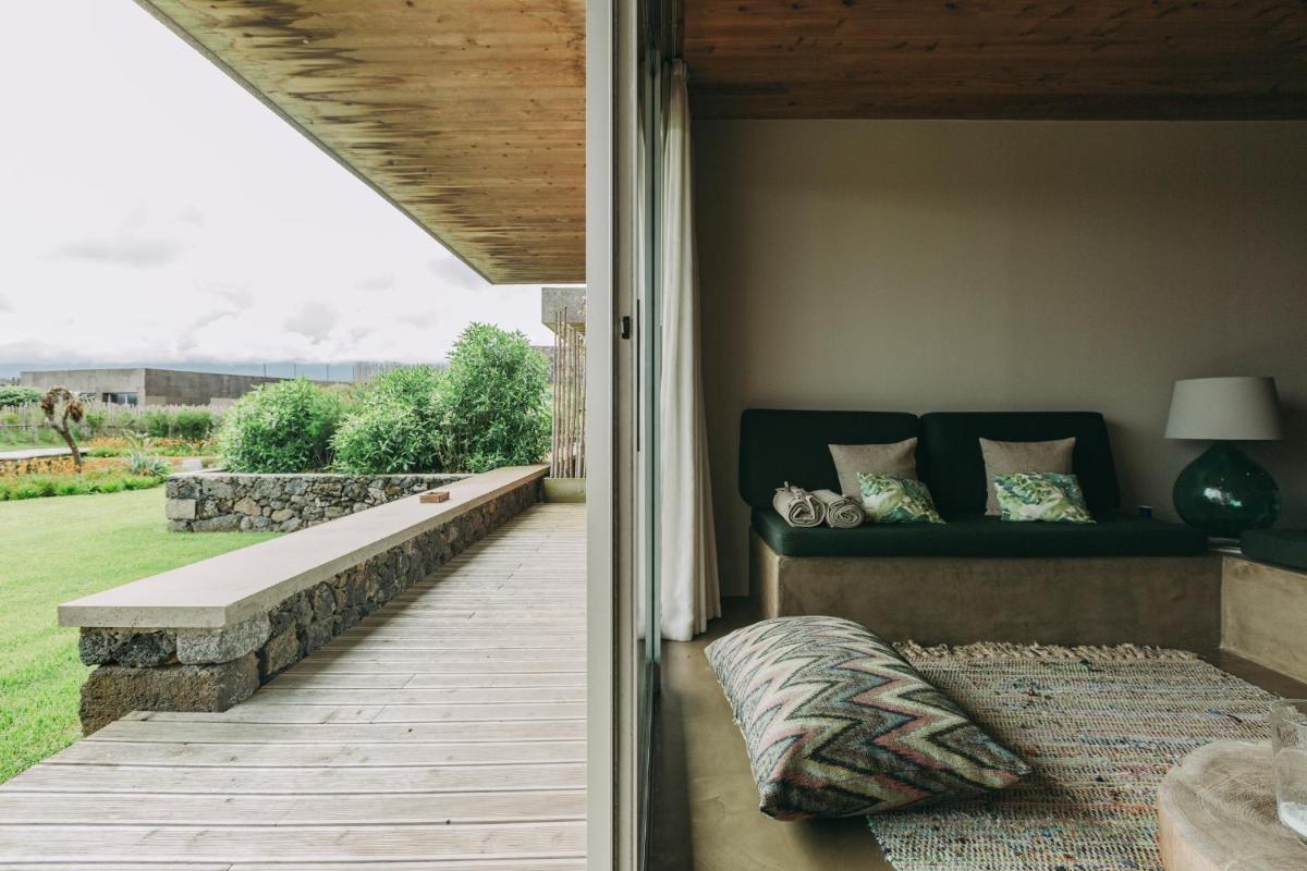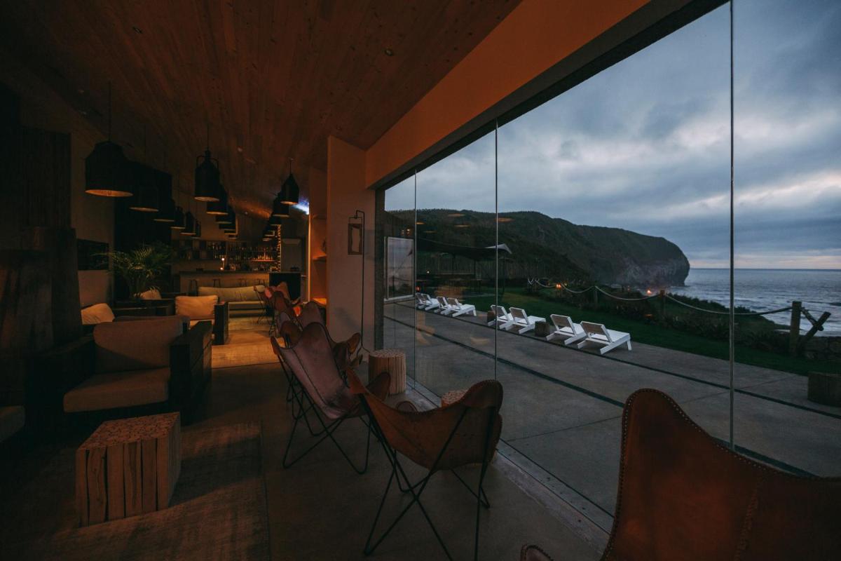 Die Villen sind aus natürlichen Materialien wie Holz und Kork gebaut und so konzipiert, dass sie perfekt mit der vulkanischen Küste verschmelzen. Jede Unterkunft ist ein Beispiel für umweltfreundlichen Luxus mit großen Glasfronten. Ein besonderes Detail ist die private Außendusche in vielen Villen, ideal für eine Erfrischung unter dem Himmel der Azoren nach dem Surfen.