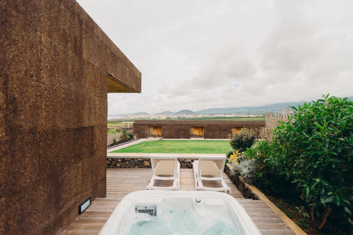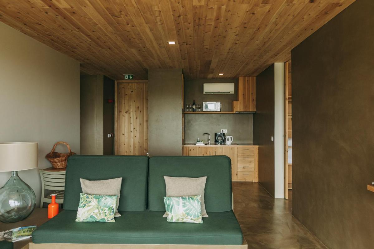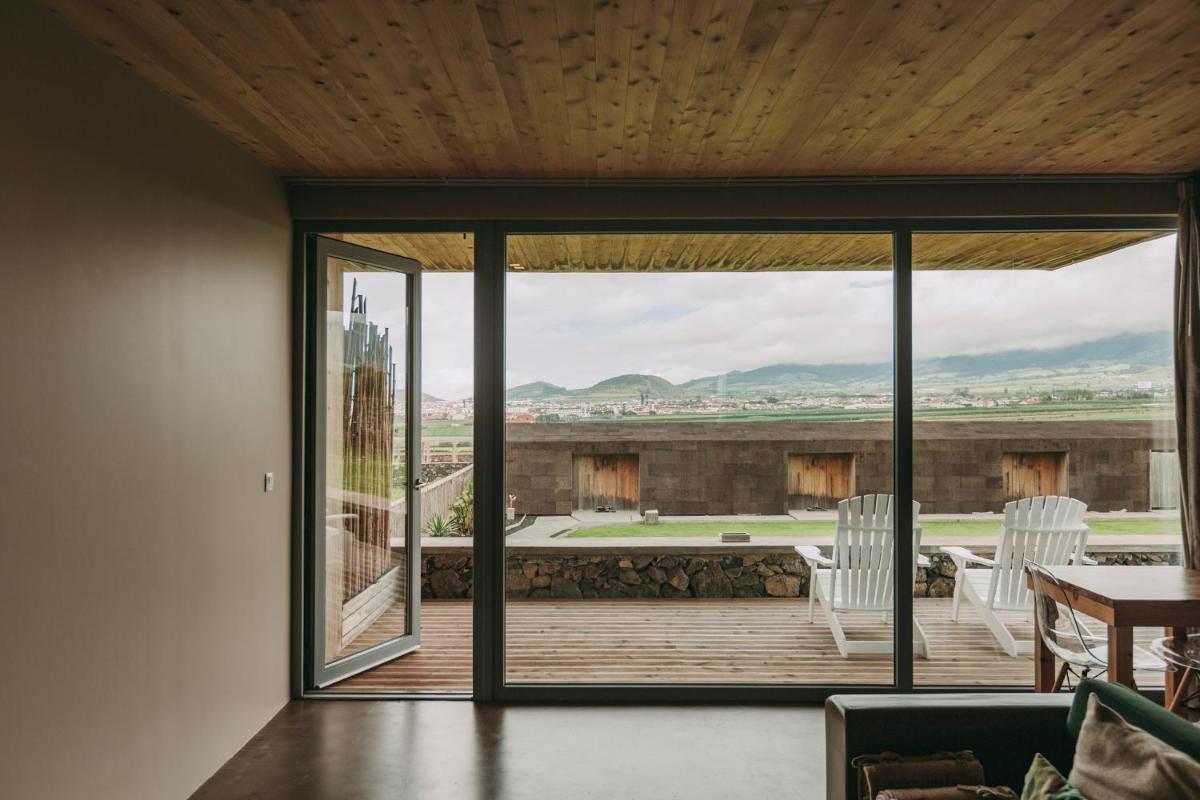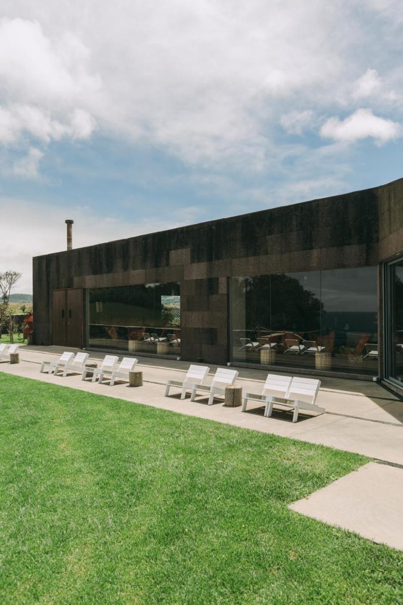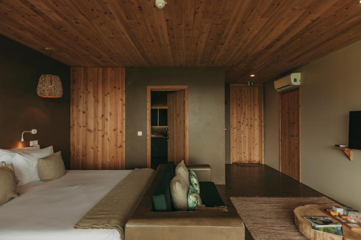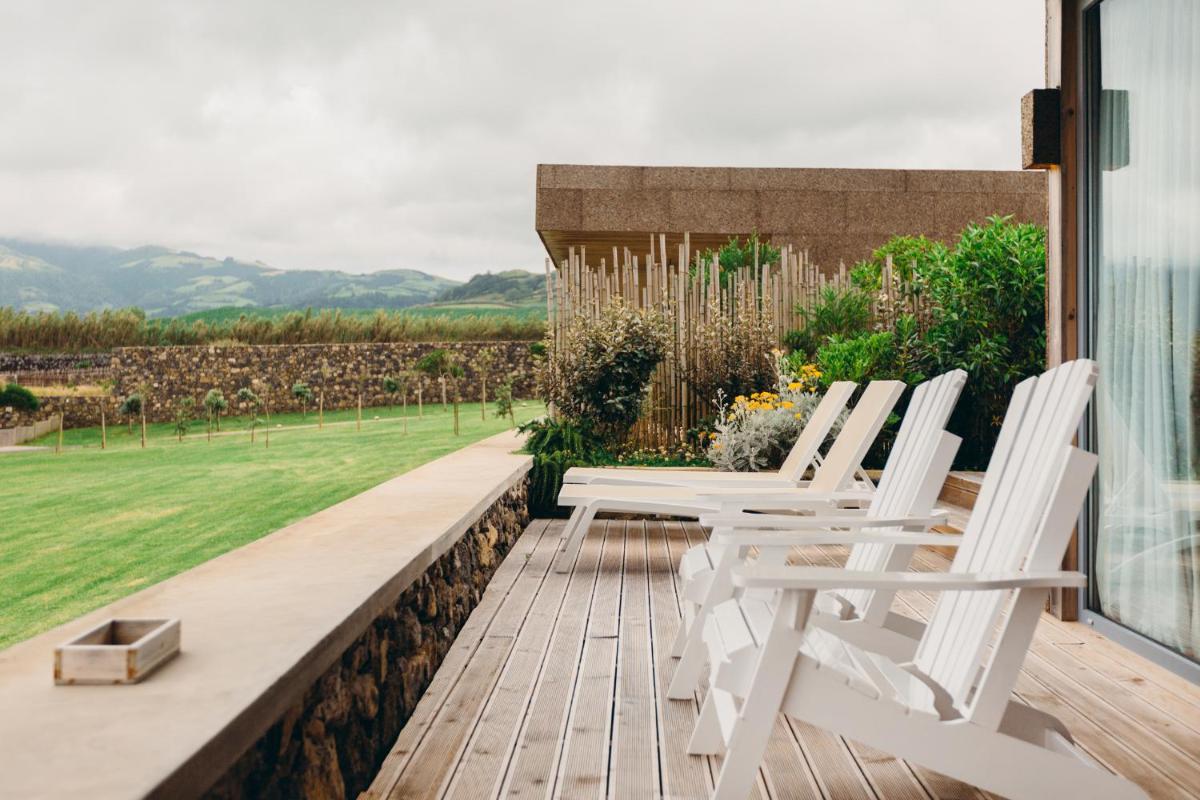 Die Villen sind aus natürlichen Materialien wie Holz und Kork gebaut und so konzipiert, dass sie perfekt mit der vulkanischen Küste verschmelzen. Jede Unterkunft ist ein Beispiel für umweltfreundlichen Luxus mit großen Glasfronten. Ein besonderes Detail ist die private Außendusche in vielen Villen, ideal für eine Erfrischung unter dem Himmel der Azoren nach dem Surfen.