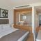 Diese 105 m² große Suite verfügt über 1 Kingsize-Bett in einem separaten Schlafbereich. Ein komfortabler Wohnbereich mit einem Sofa und einem Esstisch mit 4 Stühlen ist ebenfalls enthalten. Über die raumhohen Fenster erreichen Sie einen eigenen Balkon mit einer herrlichen Aussicht auf die Ägäis. Weitere Zimmer können mit dieser Suite verbunden werden. Ein HD-TV und Highspeed-WLAN sind vorhanden. Die Minibar wird täglich aufgefüllt.