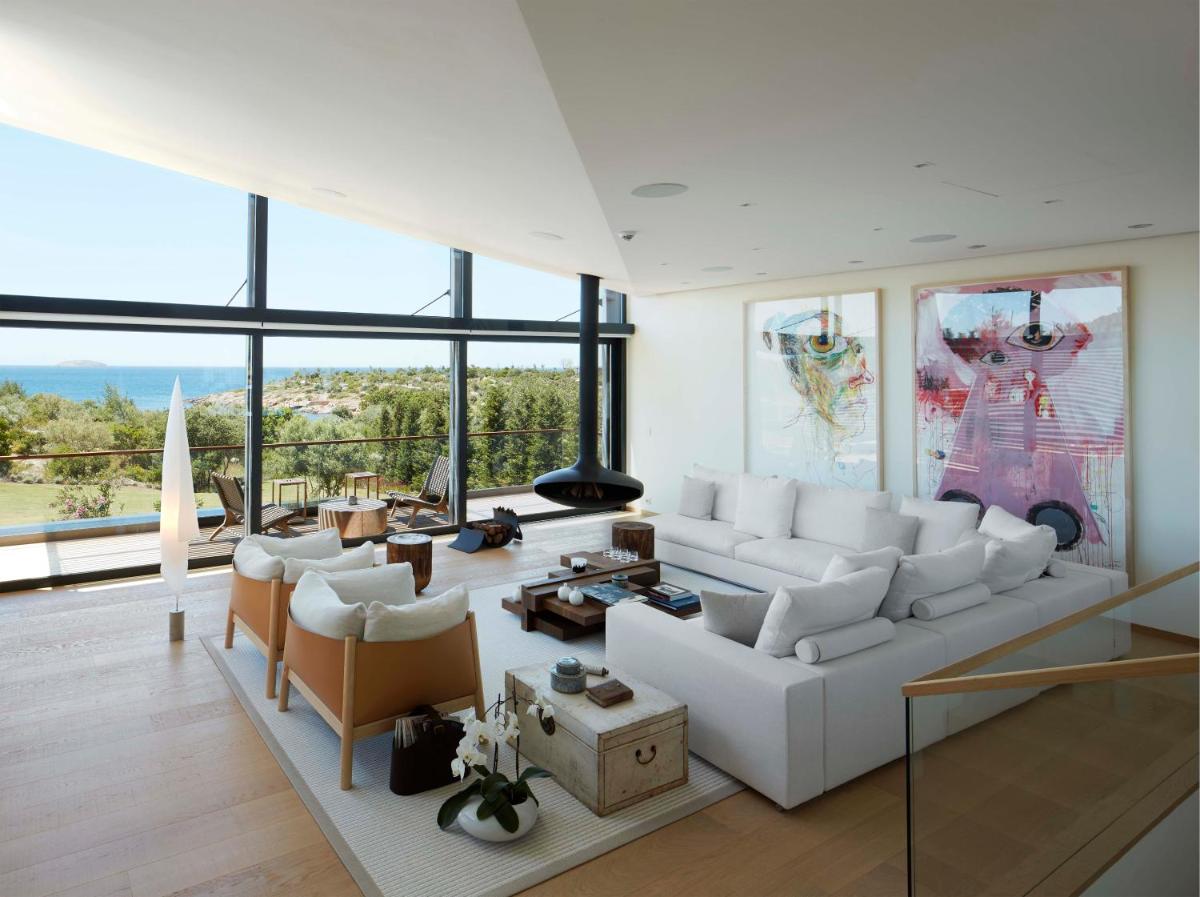 Dieses modern eingerichtete Zimmer verfügt über einen Wohnbereich mit einem Flachbild-TV, einem Sofa und einem Schreibtisch. Ein begehbarer Kleiderschrank und ein Ankleidezimmer sind ebenfalls vorhanden. Durch die deckenhohen Fenster gelangen Sie auf einen eigenen Balkon mit Panoramablick auf die Ägäis. Auf dem Balkon stehen Ihnen ein Tisch und Stühle zur Verfügung. Das eigene Bad ist mit einer Badewanne, einem Haartrockner, kostenfreien Pflegeprodukten, einem Bademantel, einer Zahnbürste und Hausschuhen ausgestattet. Stimmungsbeleuchtung und Temperaturregelung werden durch ein iPad gesteuert.
