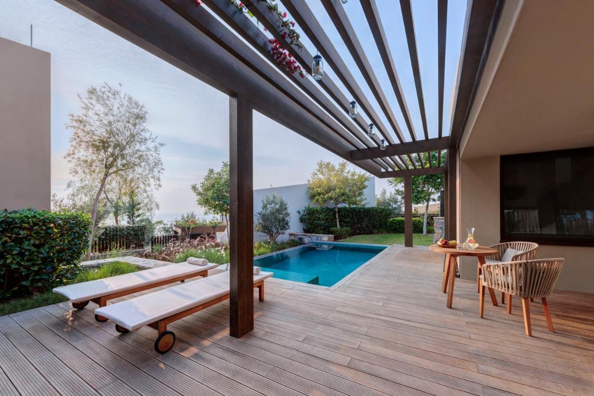 Dieses 41 m2 große Zimmer verfügt über ein Kingsize-Bett, einen Schreibtisch mit einem Stuhl und einen Sitzbereich für 2 Personen. Durch die großen Fenster zu einer eigenen Terrasse genießen Sie eine herrliche Aussicht auf die Ägäis. Ein begehbarer Kleiderschrank und ein Ankleidebereich sind ebenfalls vorhanden. Die Minibar wird einmal täglich mit gesunden Snacks, Wasserflaschen und alkoholfreien Getränken gefüllt. Zu den weiteren Annehmlichkeiten gehören ein Flachbild-TV, Highspeed-WLAN sowie ein geräumiges Marmorbad mit einer ebenerdigen Dusche und einem Doppelwaschtisch.