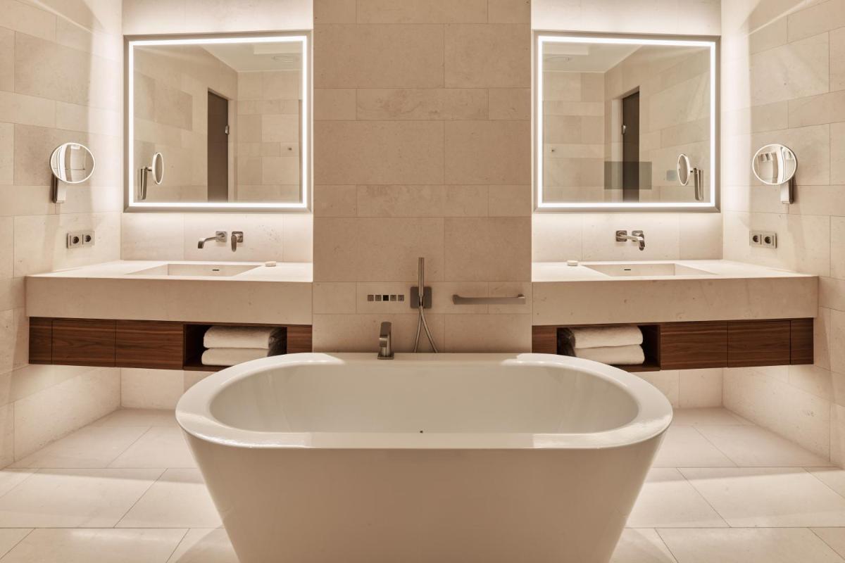 Diese Suite mit einem eigenen, möblierten Balkon verfügt über einen Sitzbereich, einen Esstisch, einen begehbaren Kleiderschrank, Tee- und Kaffeezubereitungsmöglichkeiten sowie ein Badezimmer aus Naturstein mit einer Dusche und einer Badewanne. Freuen Sie sich außerdem auf eine Auswahl an kostenlosen Getränken aus der Minibar.