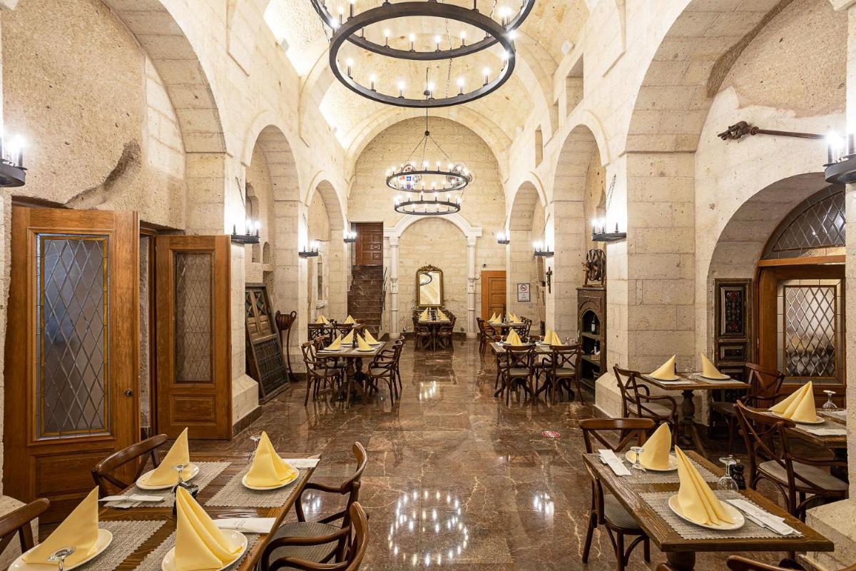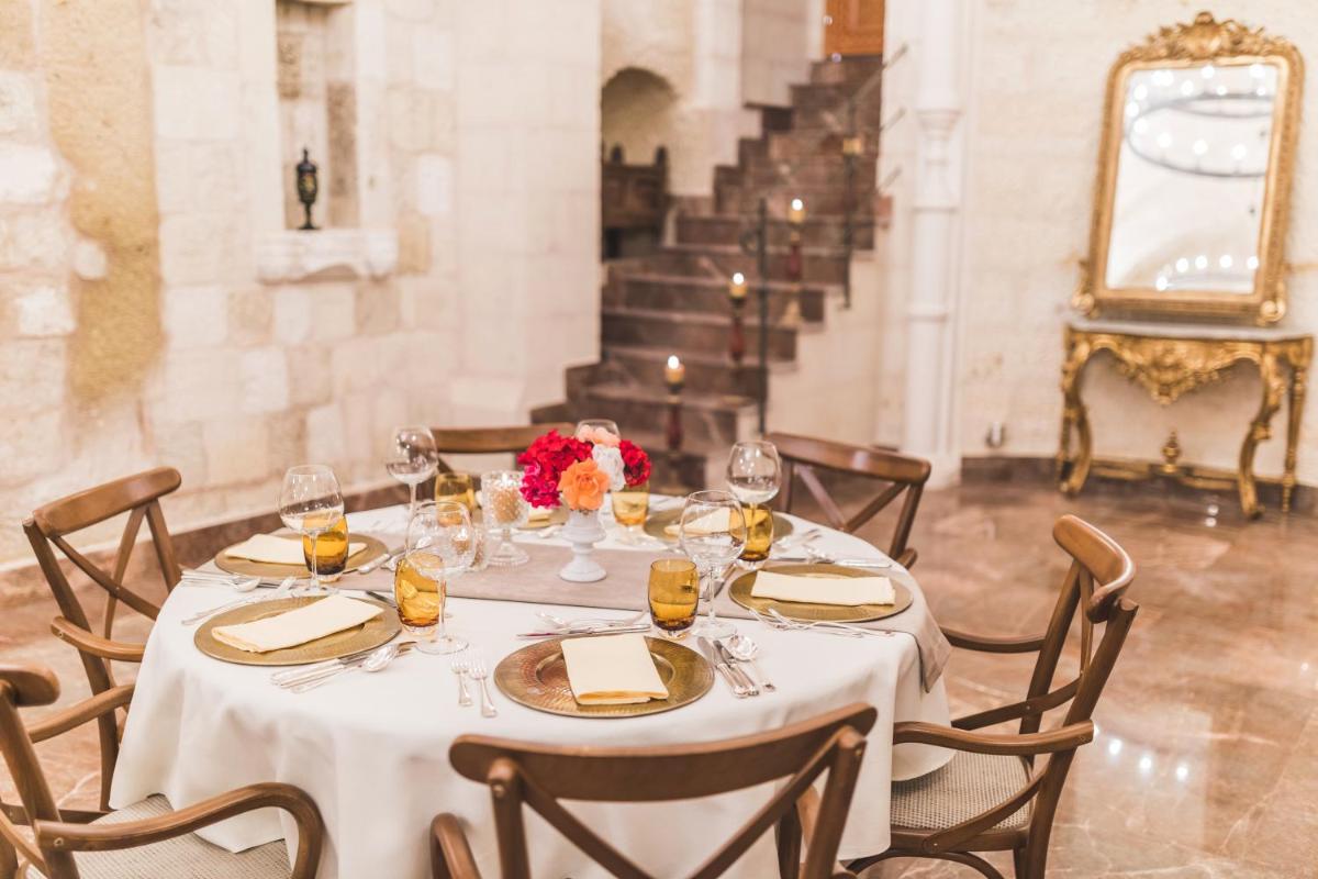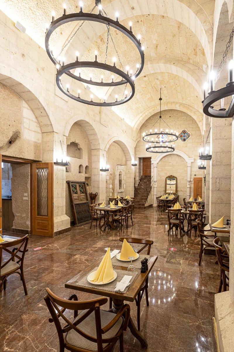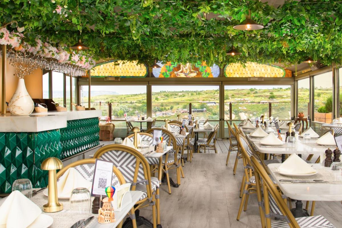 Das Hotel verfügt über mehrere Terrassen, die den perfekten Blick bieten, um den Sonnenaufgang zu bewundern, der oft von den über das Tal schwebenden Heißluftballons unterbrochen wird. Das Restaurant zelebriert die reiche anatolische Kochtradition mit frischen Produkten und regionalen Rezepten, serviert in einer eleganten, historischen Umgebung.