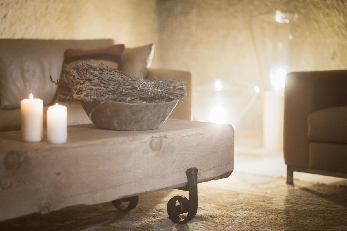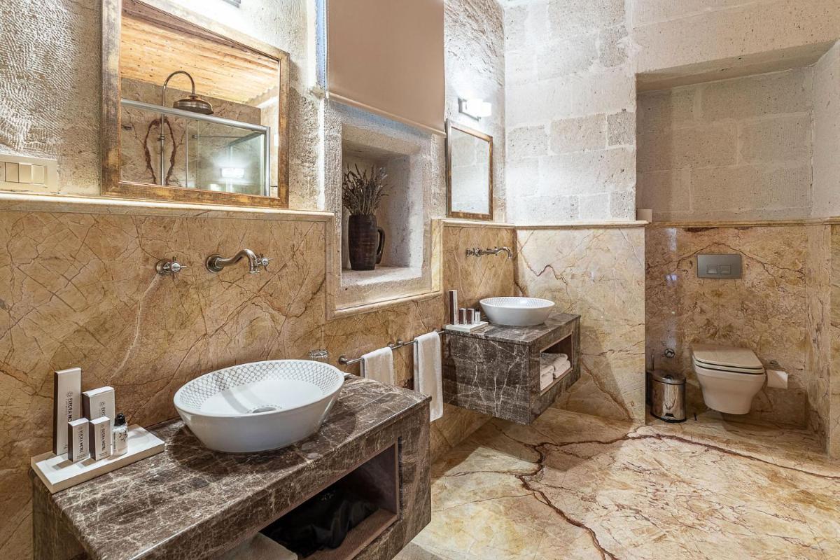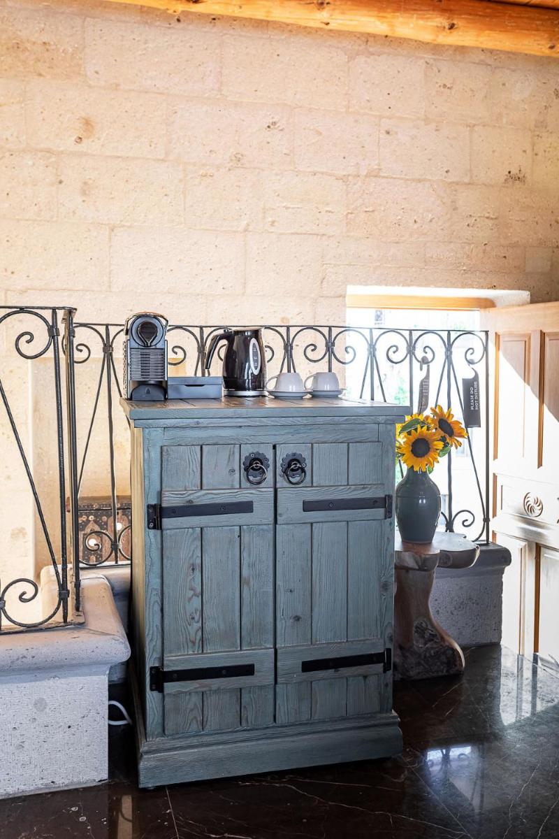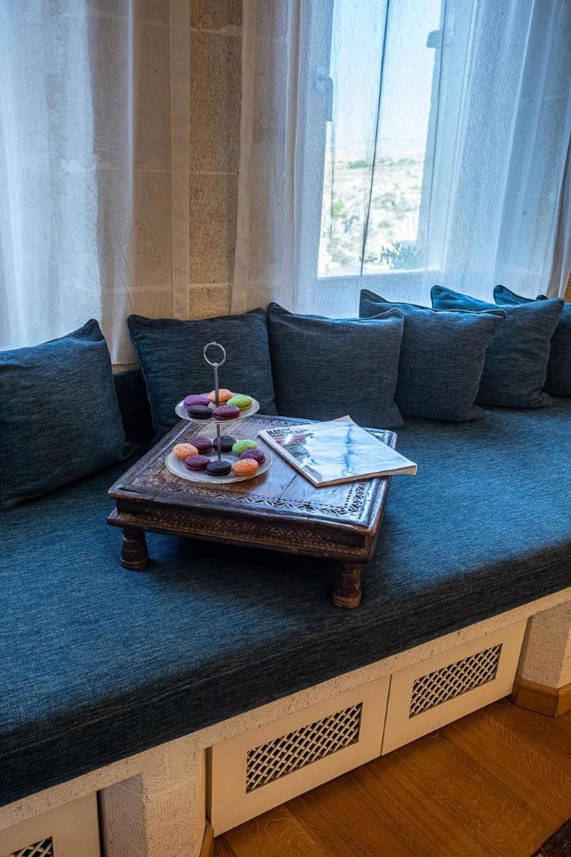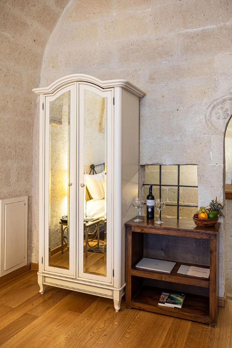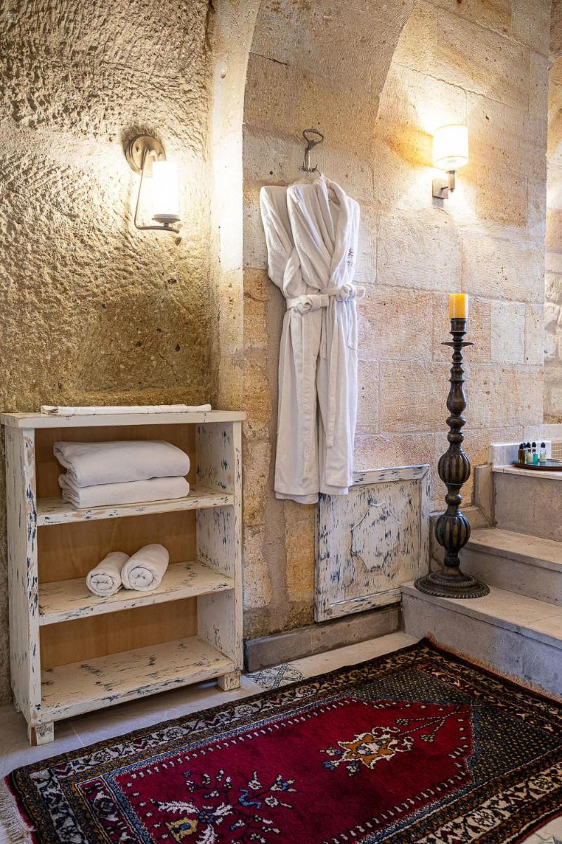 Jedes Zimmer ist einzigartig, entweder in den Tufffelsen gehauen oder mit lokalem Stein gebaut, wobei der rustikale Charme erhalten bleibt und luxuriöse Annehmlichkeiten wie Whirlpools und Fußbodenheizung integriert werden. Das Innendesign kombiniert lokale Handwerkskunst mit einer minimalistischen, eleganten Ästhetik und sorgt für eine Atmosphäre der intimen Ruhe.