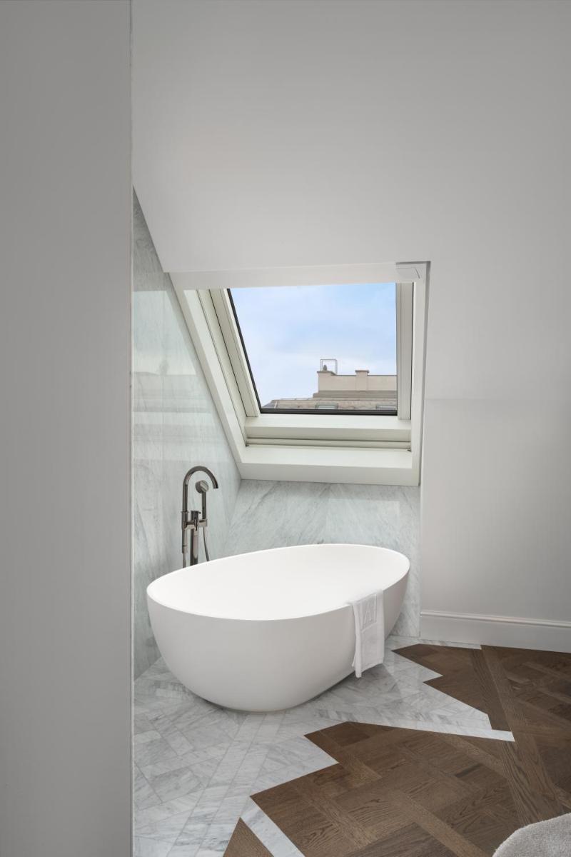 Diese einzigartige, sehr geräumige Suite ist mit dem denkmalgeschützten Aufzug zugänglich. Sie verfügt über einen eigenen Balkon mit Aussicht auf die Wiener Ringstraße, ein luxuriöses Bad mit einer Eckbadewanne, einen begehbaren Kleiderschrank und einen Empfangsraum mit einem Gäste-WC. Weiterhin steht ein großer Esstisch zur Verfügung, der auch als Konferenztisch genutzt werden kann.