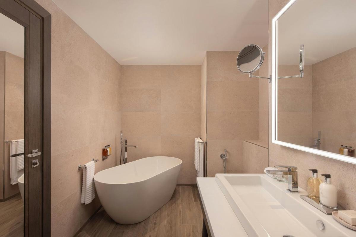 Die Unterkünfte sind äußerst geräumig und so gestaltet, dass sie den Meerblick hervorheben. Alle Zimmer und Suiten verfügen über große Terrassen oder Balkone, die direkt auf das Mittelmeer blicken. Ausgewählte Suiten bieten auch eine Hydromassage-Badewanne oder exklusiven Zugang zur Executive Club Lounge, was einen zusätzlichen Hauch von maßgeschneidertem Luxus bietet.