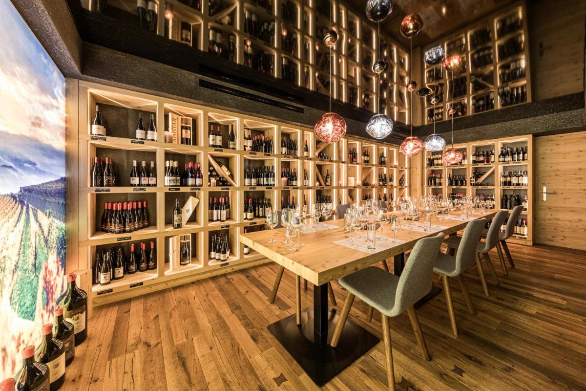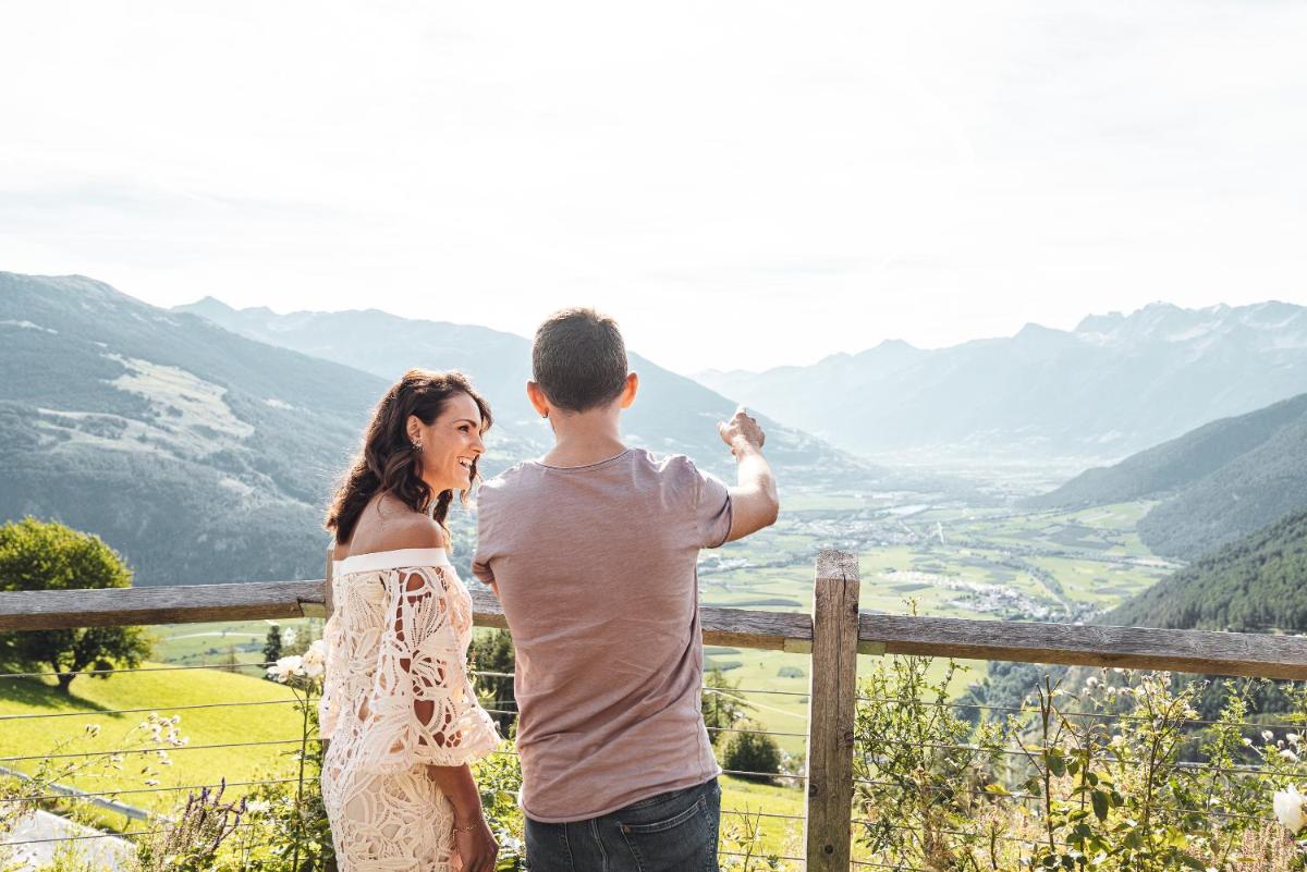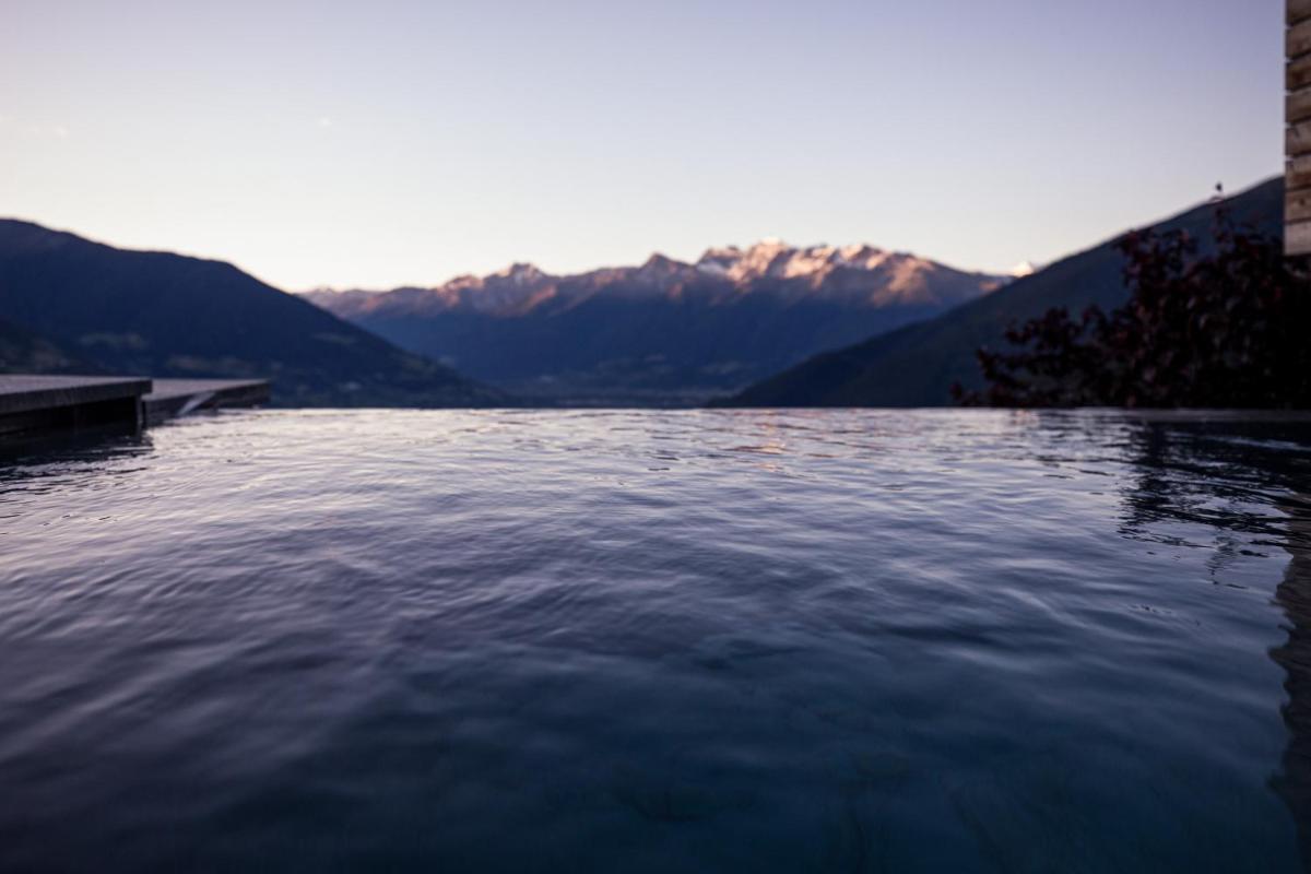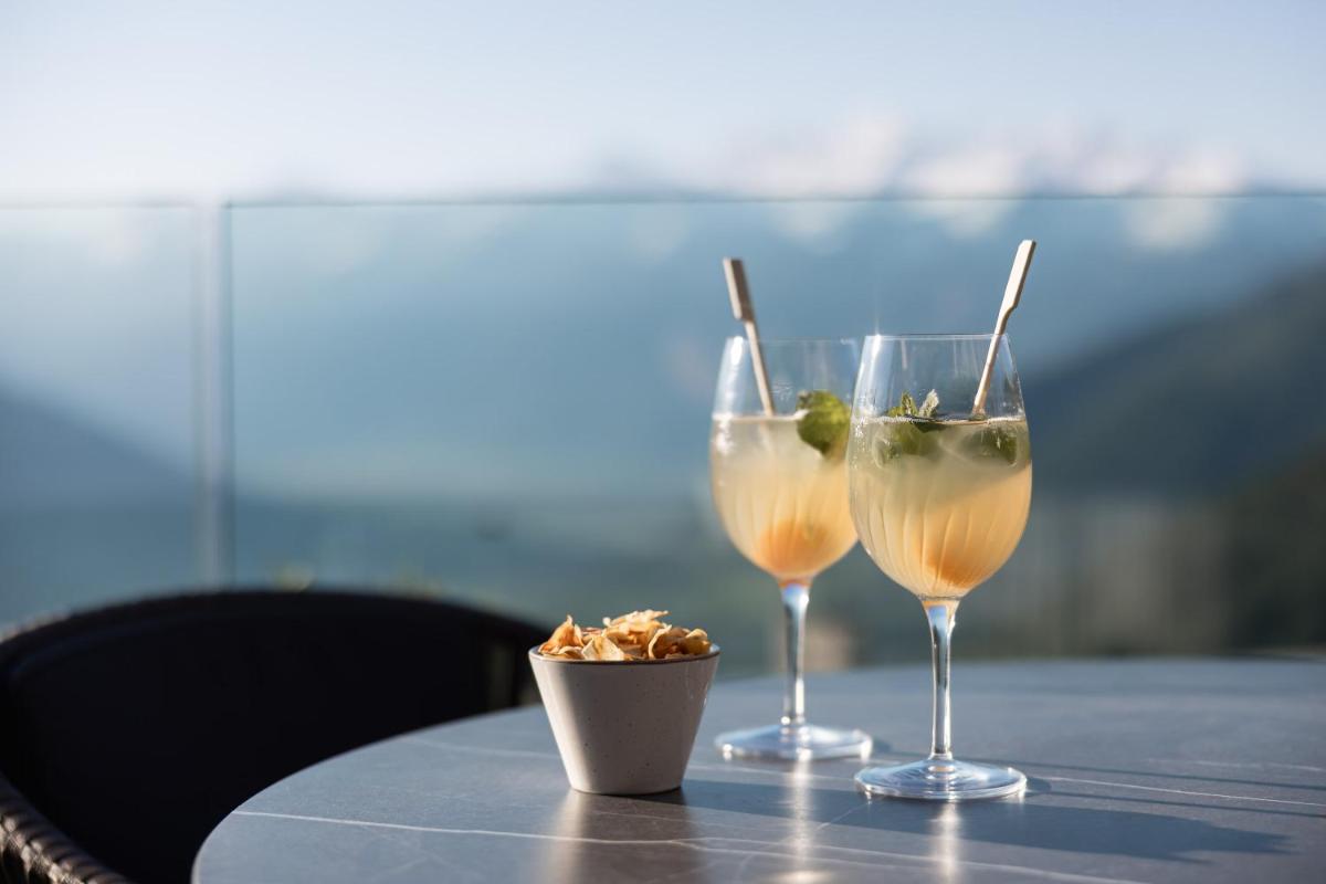 The hotel features 61 Rooms and Suites, many of which are renovated and furnished in a contemporary alpine style with natural materials like pine wood. The accommodations feature a private balcony or terrace with panoramic views of Val Venosta. The most exclusive suites, such as the Sky Suite and the Panoramic Spa Suite, offer a private outdoor hot tub. The luxurious Pool Suite even boasts a private pool on the terrace. All rooms include free WiFi, satellite TV, a minibar, Nespresso coffee machine, and a wellness bag with a bathrobe and slippers.
