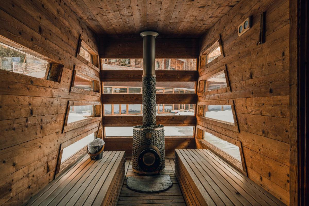 The rooms and suites (around 30) offer superior comfort with elegant design, natural materials, and plenty of space. Many accommodations, such as the duplex suites or those with terraces, boast panoramic mountain views. In-room amenities include flat-screen TV, minibar, bathrobes, and heated floors, ensuring a restorative stay after a day outdoors.