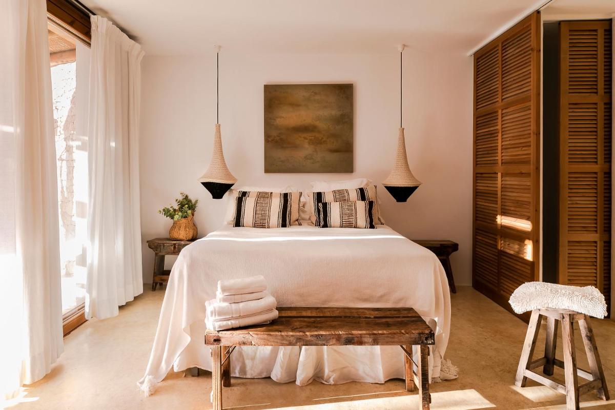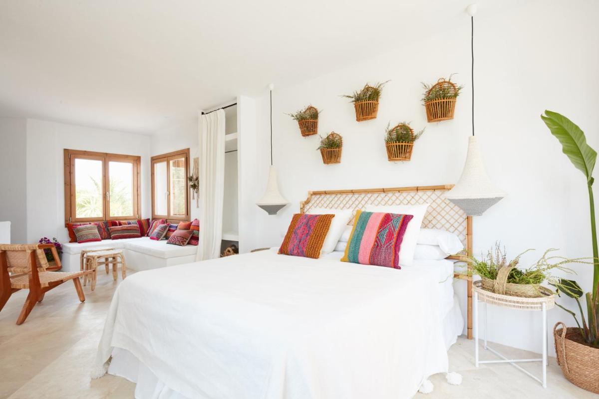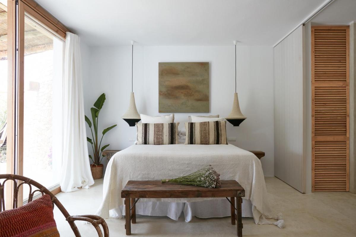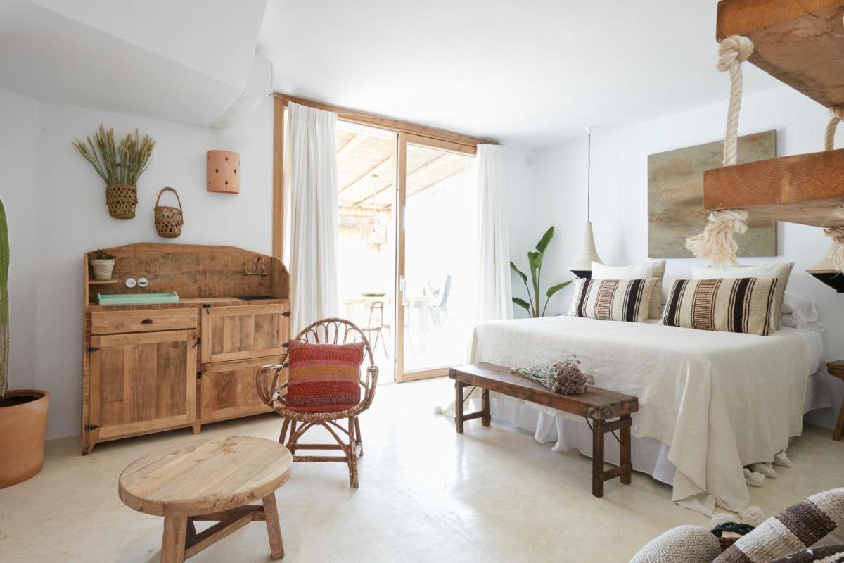 The structure is a traditional Formentera finca, restored with extreme care to maintain its rustic charm (white walls, dark wood) integrated with a modern, minimalist, and luxurious interior design. The few rooms and suites offer absolute privacy, private terraces, and an atmosphere that invites deep relaxation, often without the distraction of a TV.