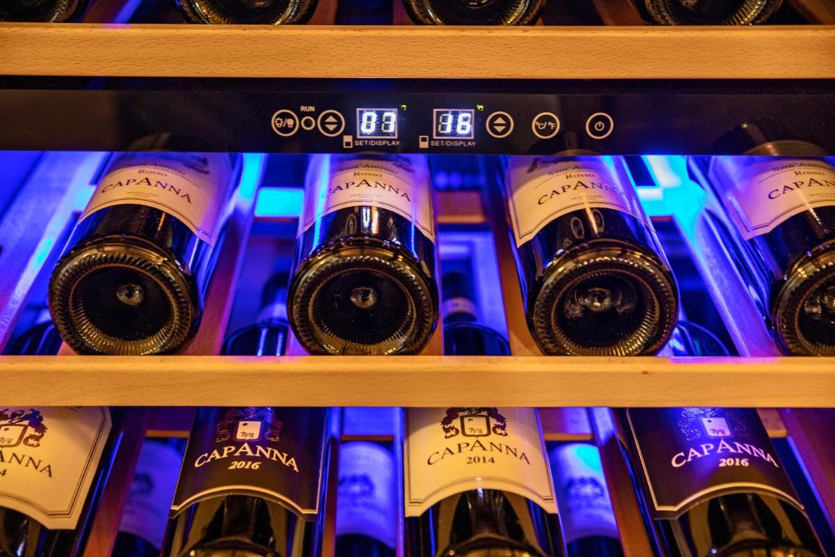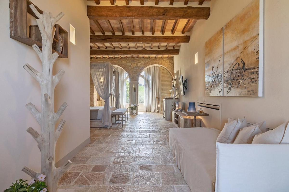 The Junior Suites and Suites, all with private entrances, combine authentic rustic Tuscan architecture with modern comfort and refined materials. The accommodations feature a private patio or garden, Free Wi-Fi, air conditioning, and a luxurious bathroom with a spacious shower. A distinctive detail is the Private Wine Fridge in every suite, offering a selection of wines from the Capanna estate (for a fee).