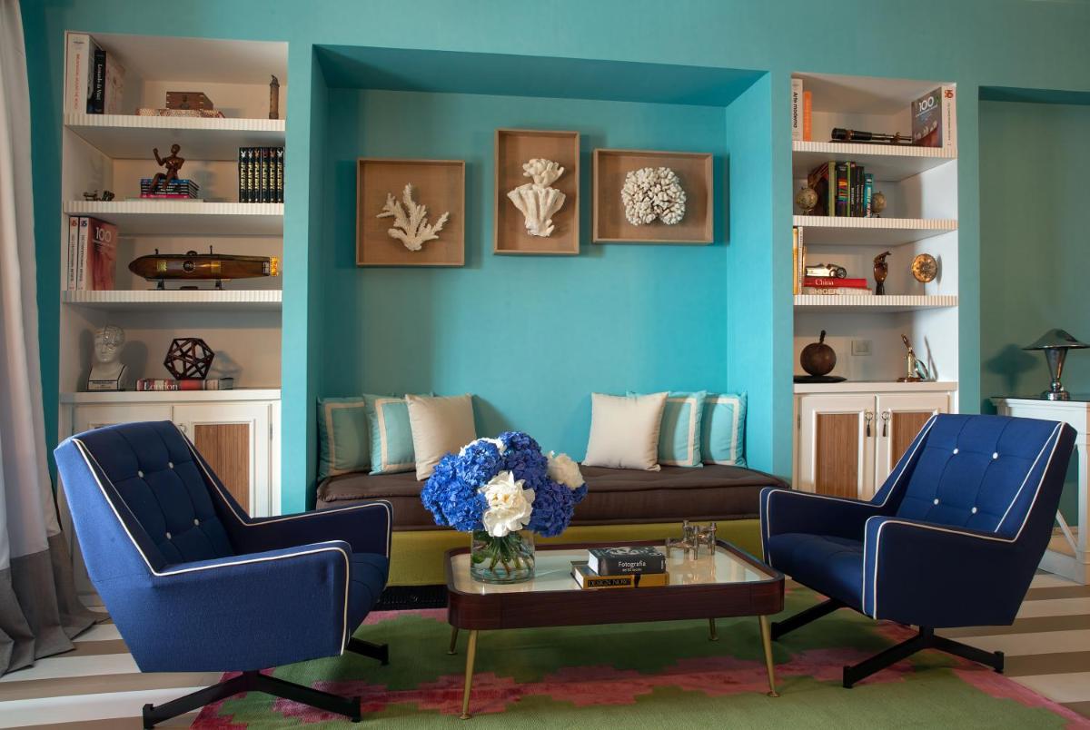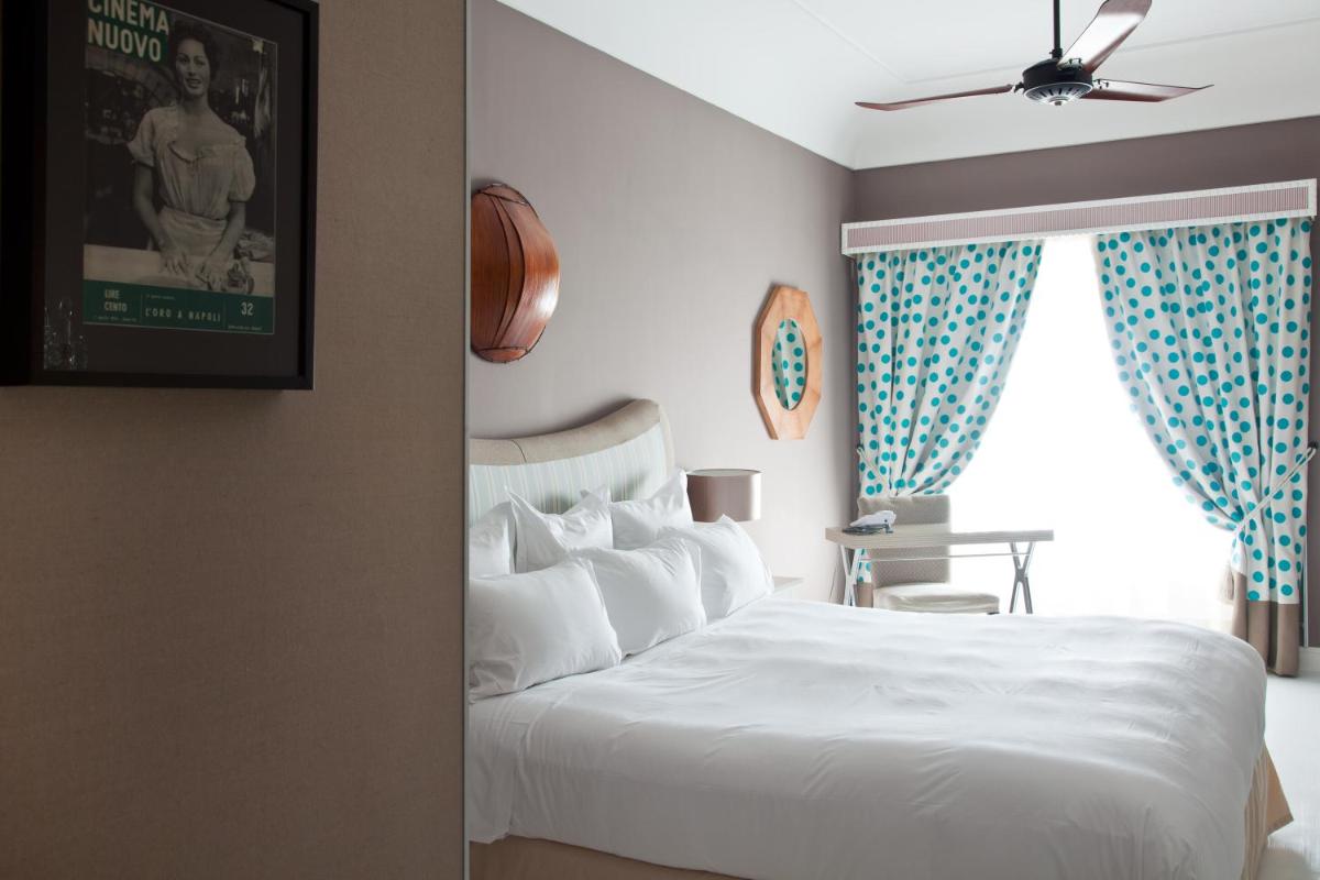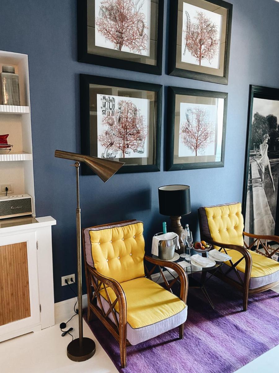 The 45 rooms and suites, all different from each other, are an homage to the island's color and light. The design is meticulously detailed, featuring painted tile floors, custom-made furnishings, and shades ranging from dusty blue to saffron yellow. Almost all accommodations feature balconies or tiled terraces that offer expansive views of the Mediterranean Sea and the white roofs of Capri. Among the most exclusive suites are the Dolce Vita Suite and the luxurious Capri Suite.