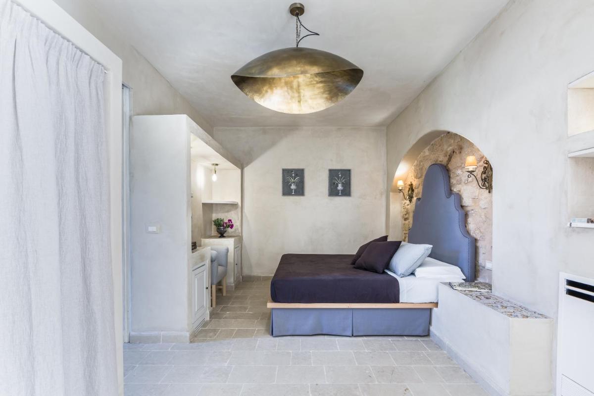 The hotel houses 13 individually styled rooms and suites featuring exposed stone walls, warm color palettes, artisanal furnishings, and modern comforts like A/C, Wi‑Fi, and minibars. The Grand Suite boasts a private terrace with panoramic views over the courtyard, gardens, and distant sea.