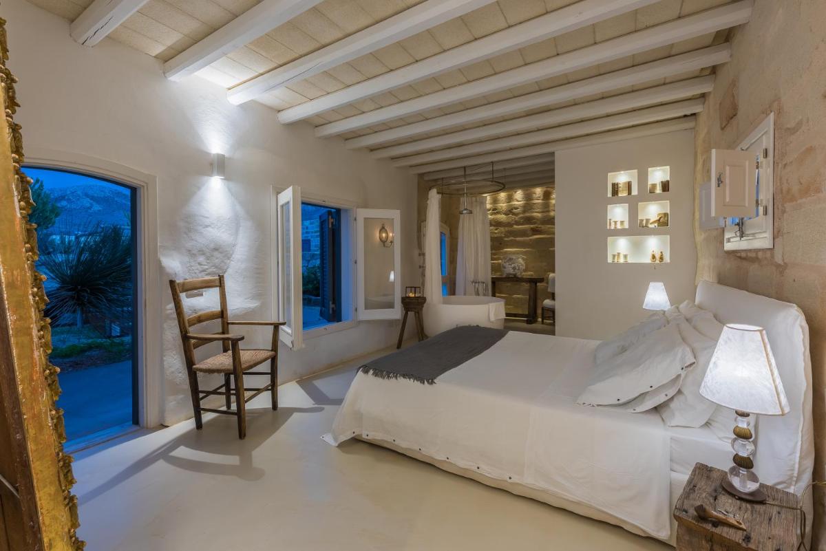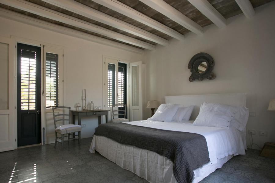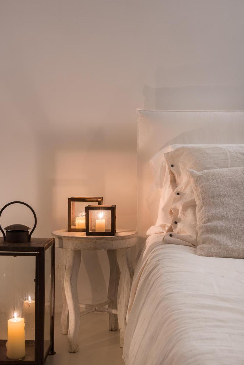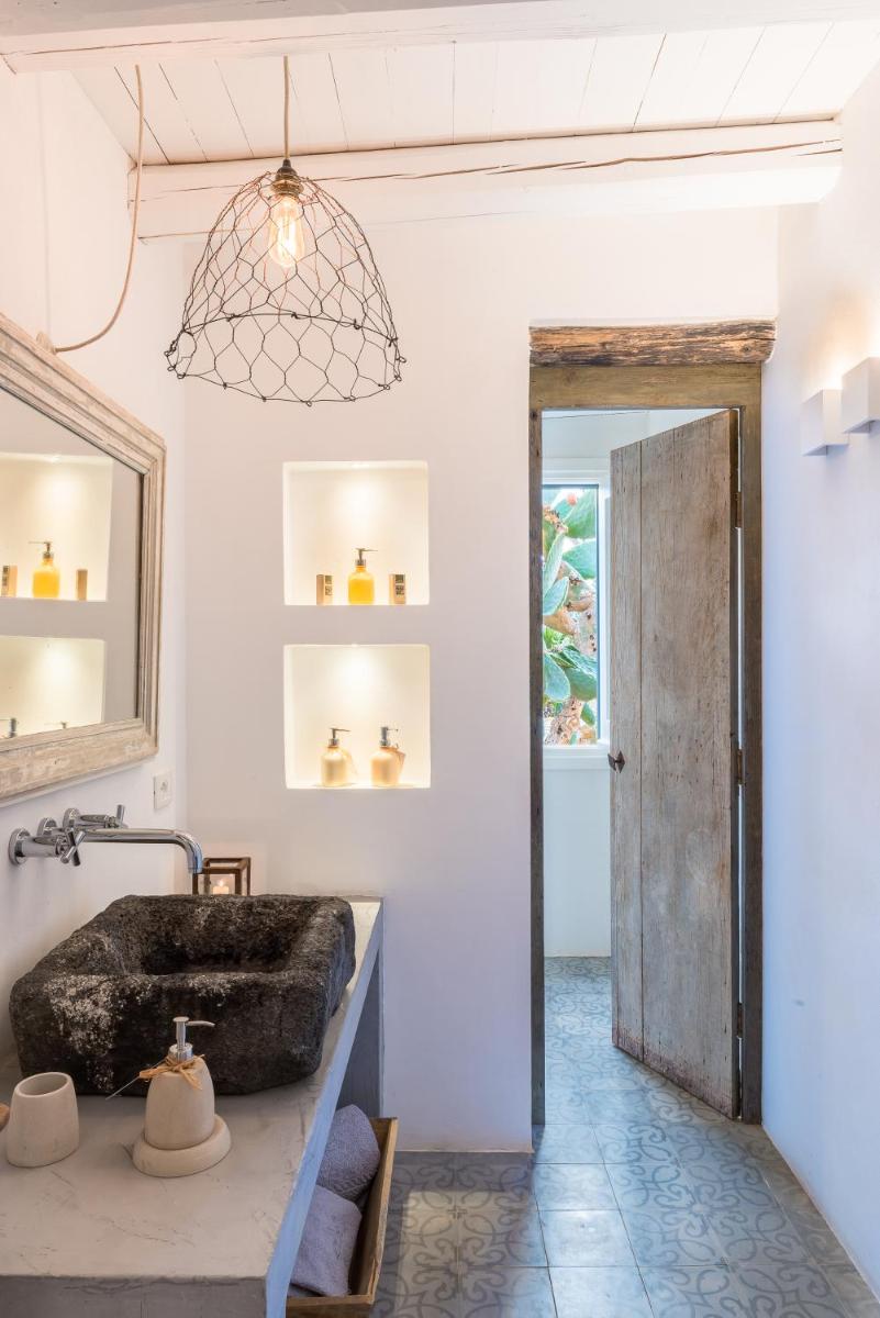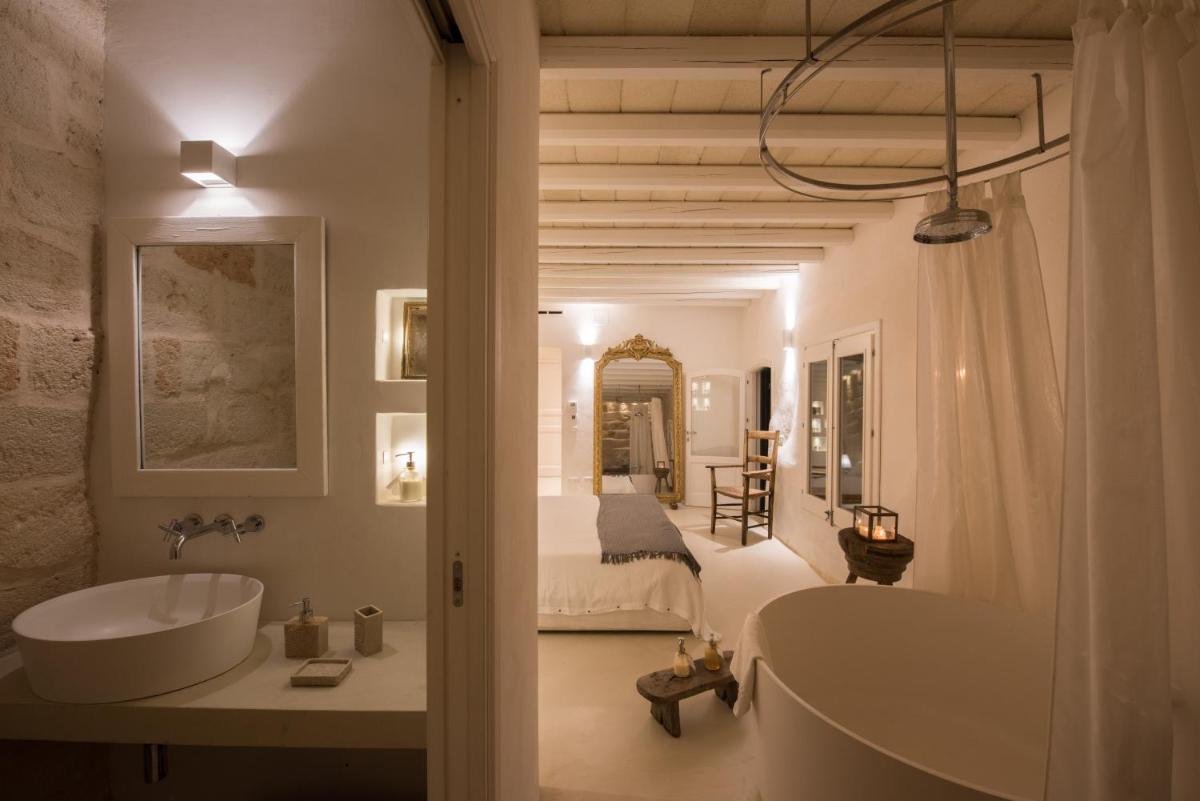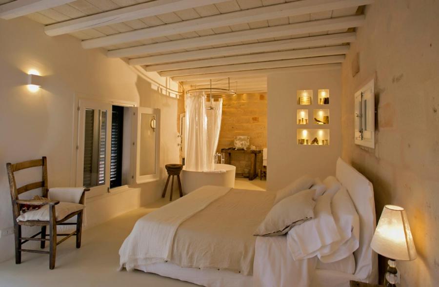 The property features eight romantic suites, each individually styled with stone walls, wooden beams, and private outdoor spaces. Suites like Ibiscus, Erica and Euforbia include bathtubs, outdoor showers, and terraces overlooking the sea or lush Mediterranean gardens.