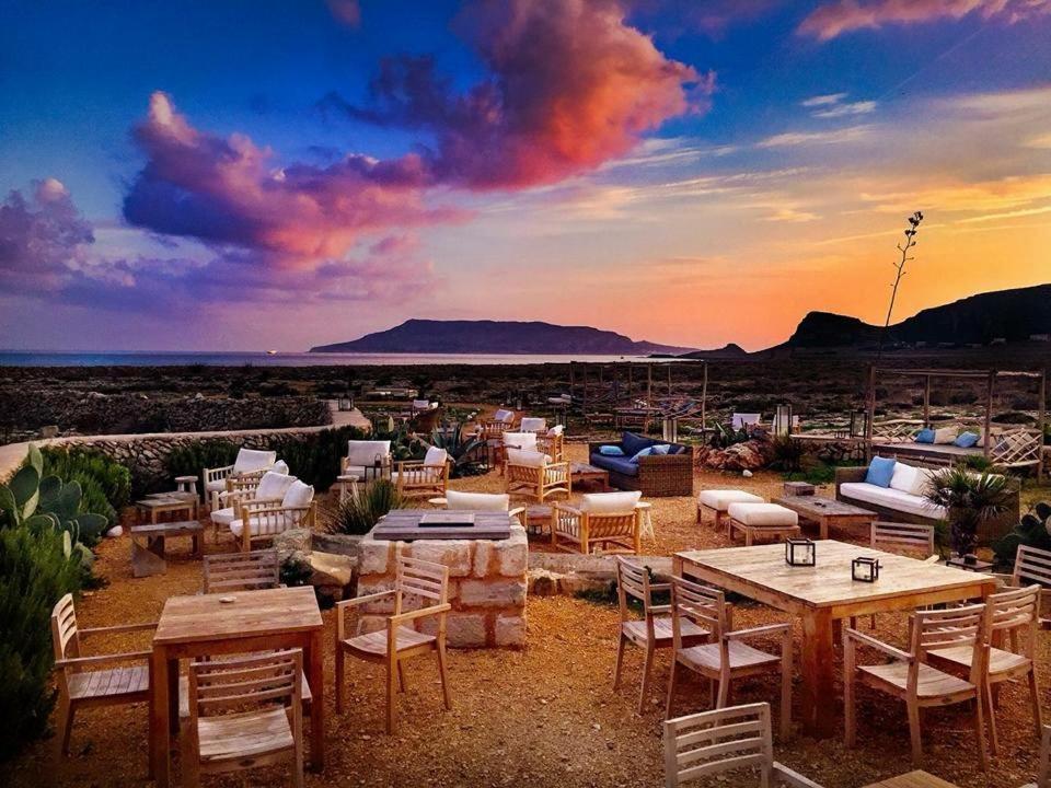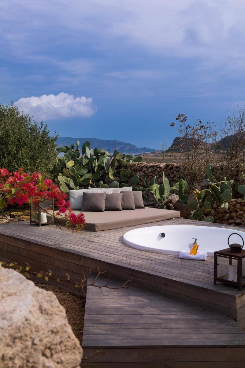 Common outdoor spaces offer cozy seating and alfresco dining overlooking the Egadi Islands. The west-facing terraces provide spectacular sunset views over Levanzo and Marettimo.