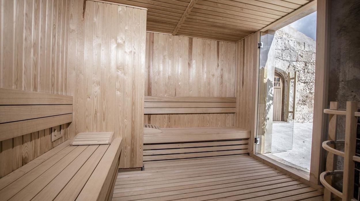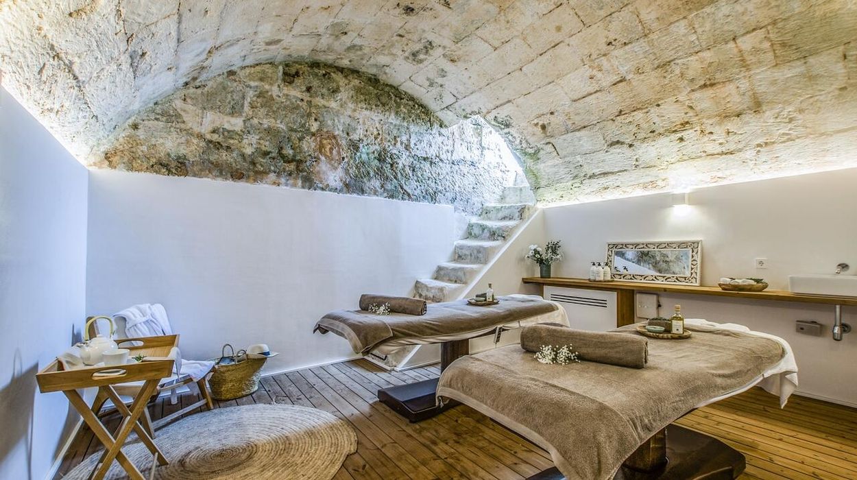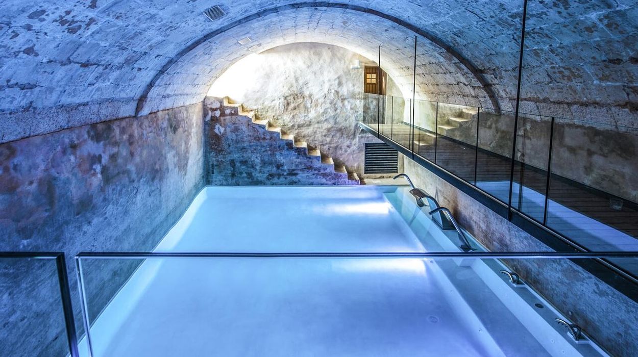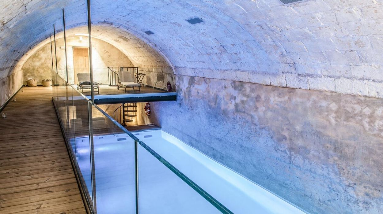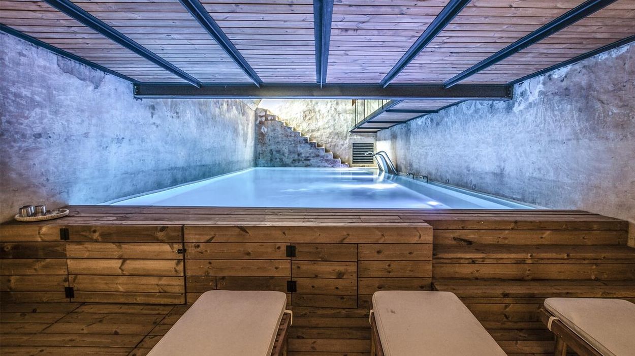 Santa Ponsa features both an outdoor pool and an indoor pool housed in an atmospheric 18th-century cistern. The spa includes a hammam, sauna, fitness area, and Susanne Kaufmann treatments, creating a holistic wellness retreat.