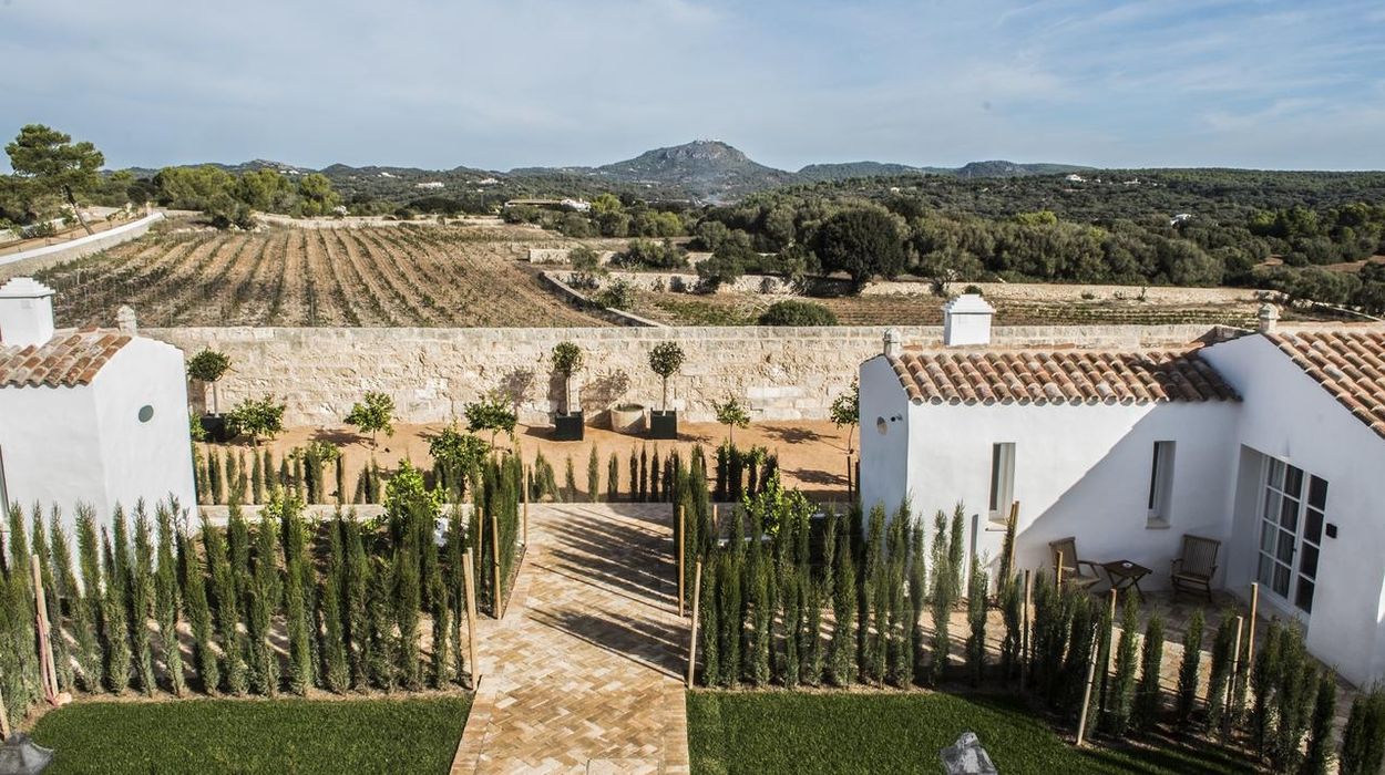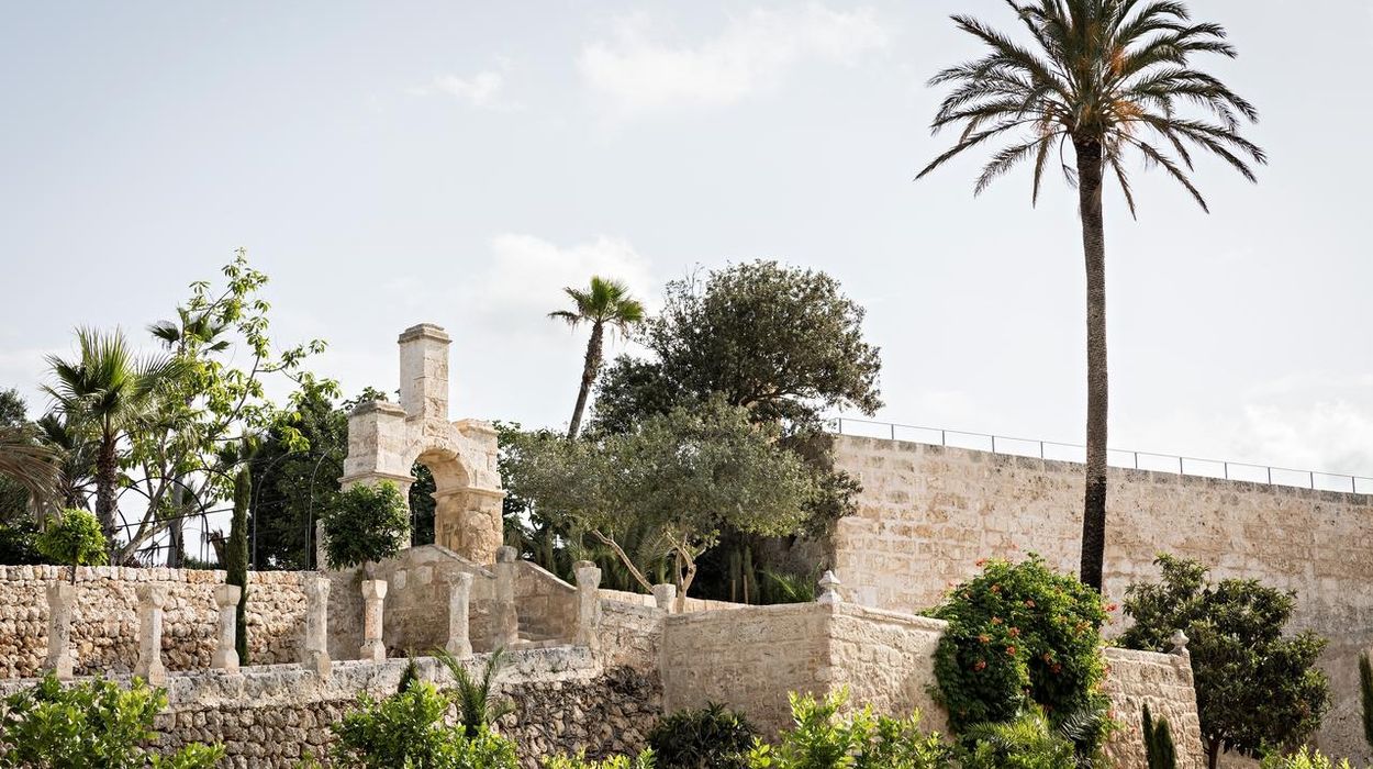 Santa Ponsa Fontenille Menorca is a beautifully restored 17th-century palace set within a historic 100-hectare finca, featuring lush terraced gardens dotted with palm trees, orange and fig groves, and Moorish-inspired architecture.