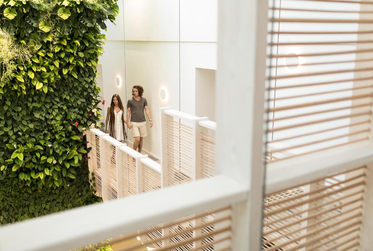 The highlight of Gatzara is its panoramic rooftop pool, an exclusive place to relax and admire the surrounding Ibizan countryside, including the view of Santa Gertrudis church. The adjacent solarium is furnished with comfortable sunbeds, offering an unexpected relaxation space in an urban context, perfect for enjoying the Ibizan sunsets.
