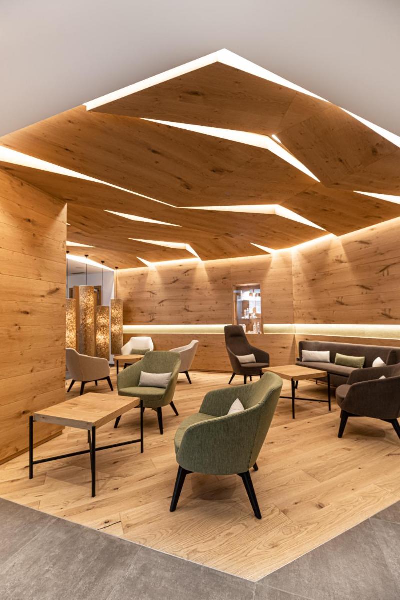 The Grand Hotel's cuisine emphasizes the flavors of Trentino-Alto Adige, favoring the use of zero-km products. The Main Restaurant offers a refined menu with healthy options. Every morning, a rich buffet breakfast with homemade sweets and organic products is served. The hotel also features a bar and a tea room.