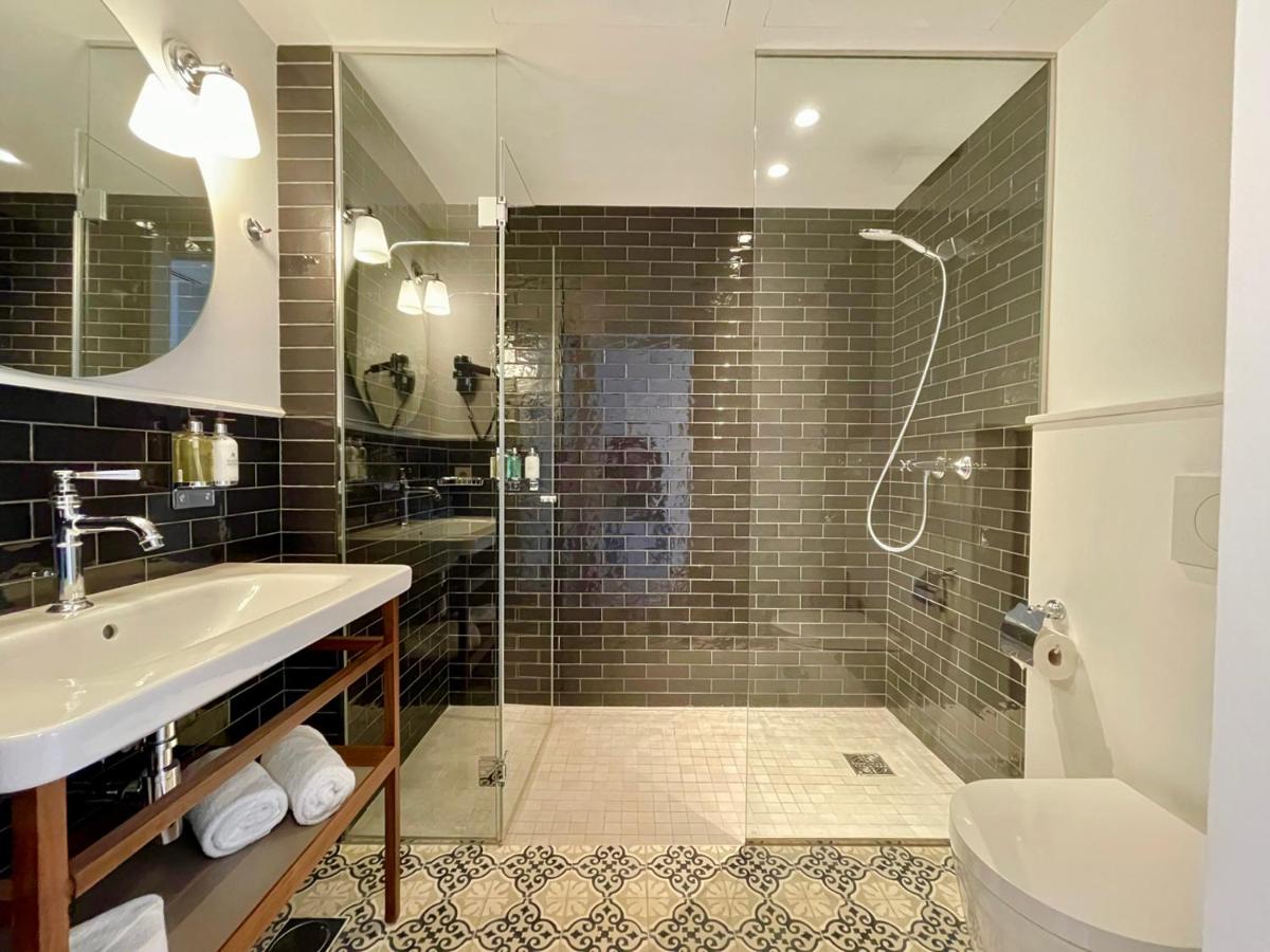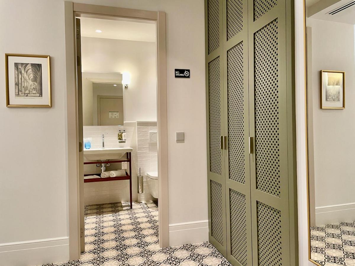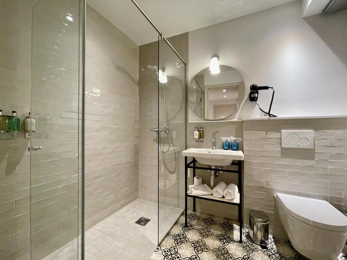 The stone building features classic architecture, but the interiors have been transformed with a contemporary, clean, and bright design. The use of natural materials, simple lines, and a neutral color palette creates an atmosphere of discreet luxury and quietude, a welcome contrast to the city's animation outside.