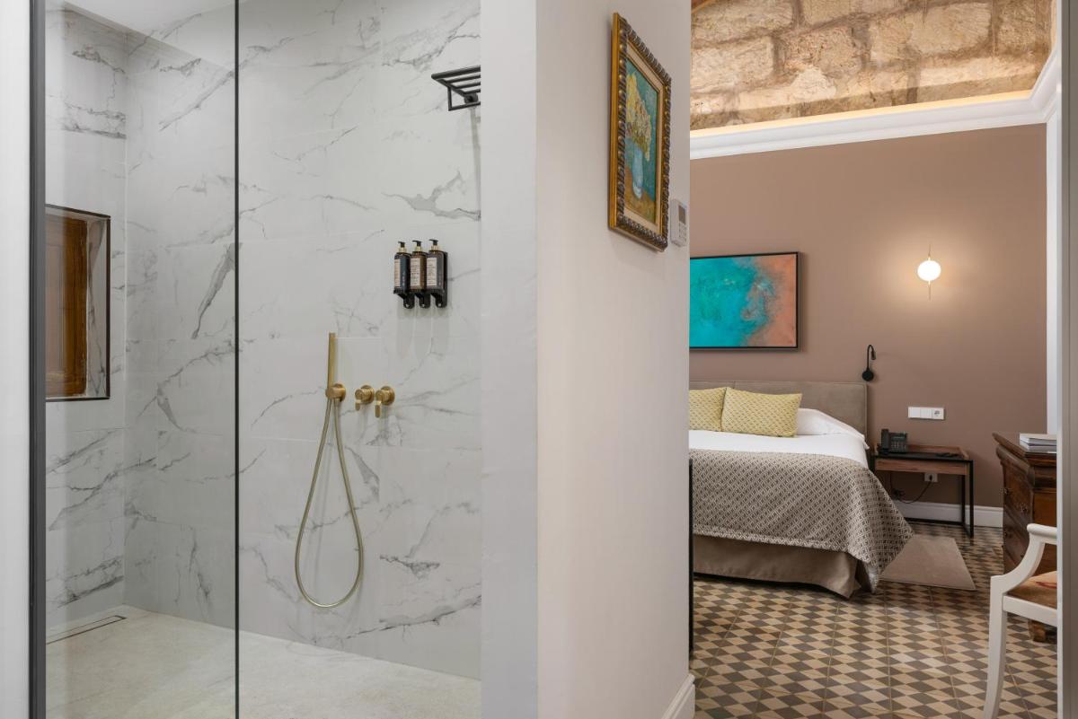 The interior design celebrates the building's roots through the skillful use of exposed stone, traditional arches, and noble materials like wood and wrought iron. A hidden gem is the preservation of original architectural elements in every suite, making each room a unique piece that tells the story of island nobility while maintaining a modern aesthetic.