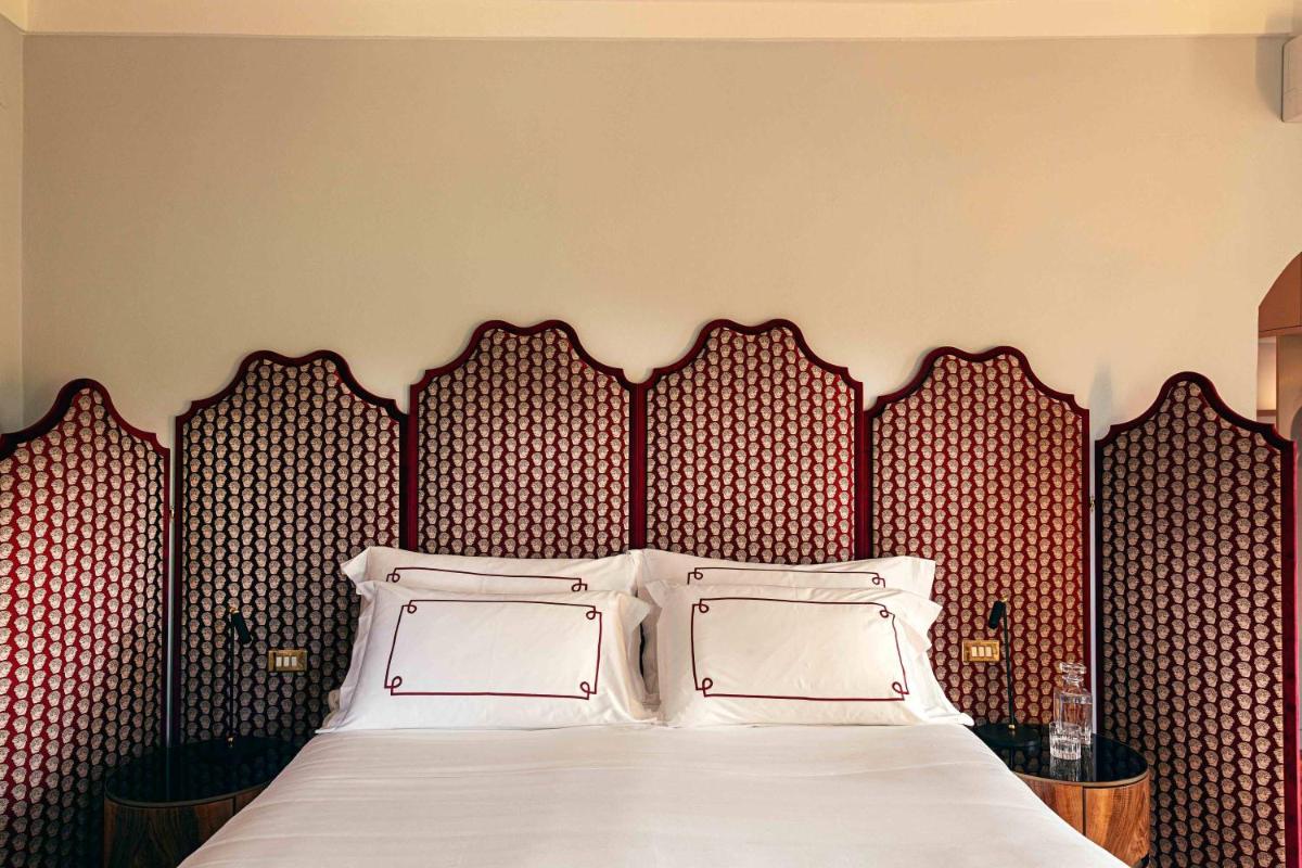 The 22 accommodations, which include Deluxe Rooms, Prestige Rooms, and Suites, are all individually decorated. Each room reflects Mongiardino’s flair with unique furnishings, bold wallpapers, and modern comforts, including free Wi-Fi, Smart TV, and Nespresso coffee machines. Particular attention is paid to detail: from the Select Comfort mattresses to the Frette linens. The luxury suites, some with balconies and views of the courtyard or garden, offer ample space and maximum tranquility.