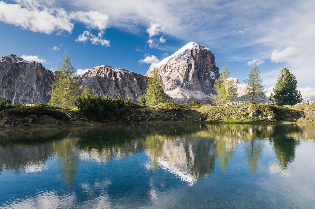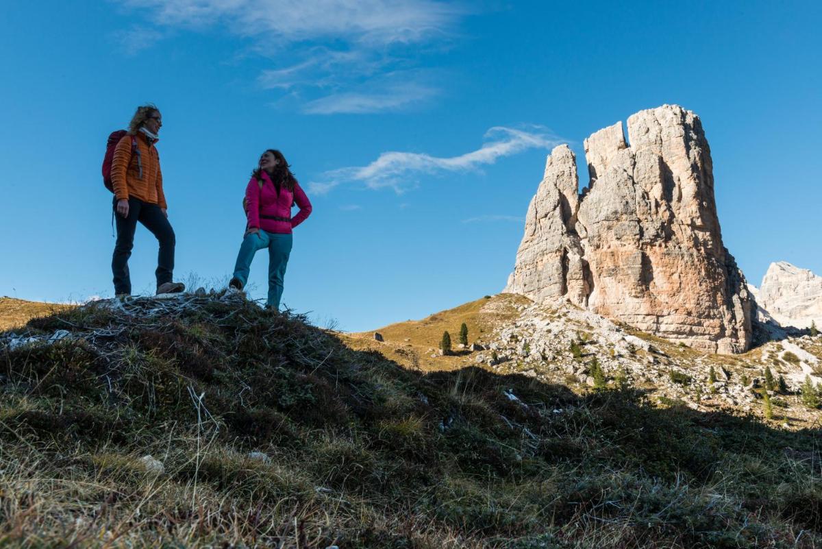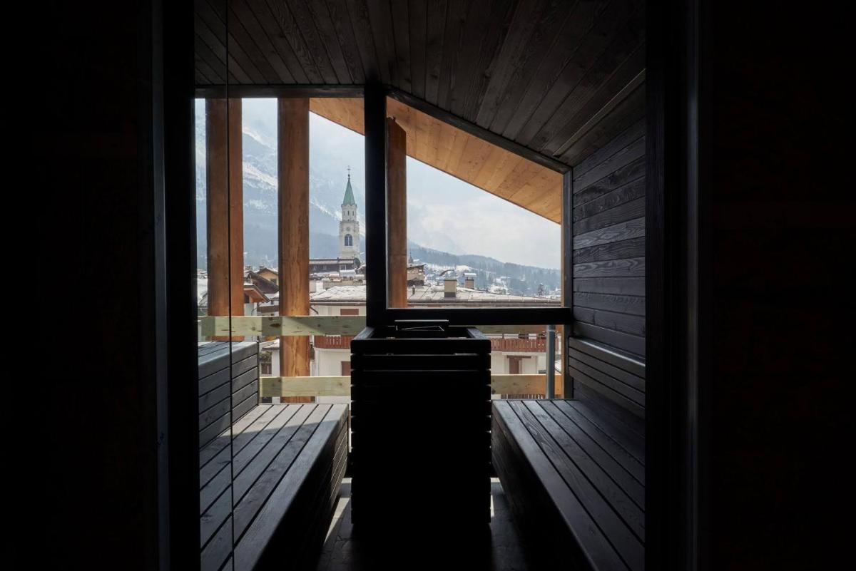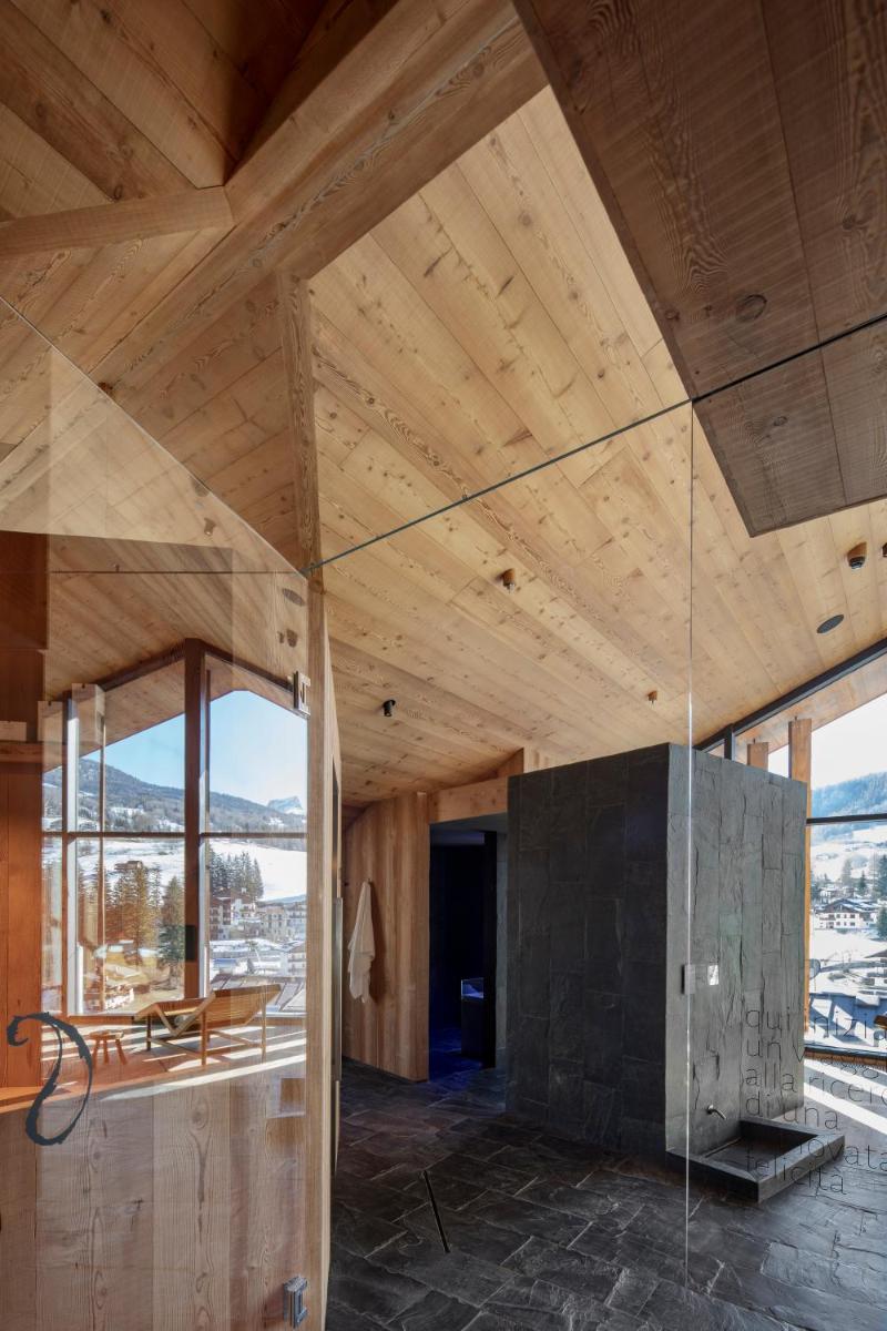 On the top floor of the hotel, an exceptional wellness area overlooks the entire valley. The panoramic spa offers a multisensory path culminating in an outdoor whirlpool, where the contrast between the crisp mountain air and the warm water provides moments of absolute peace, framed by the majestic Tofane and Cristallo peaks.
