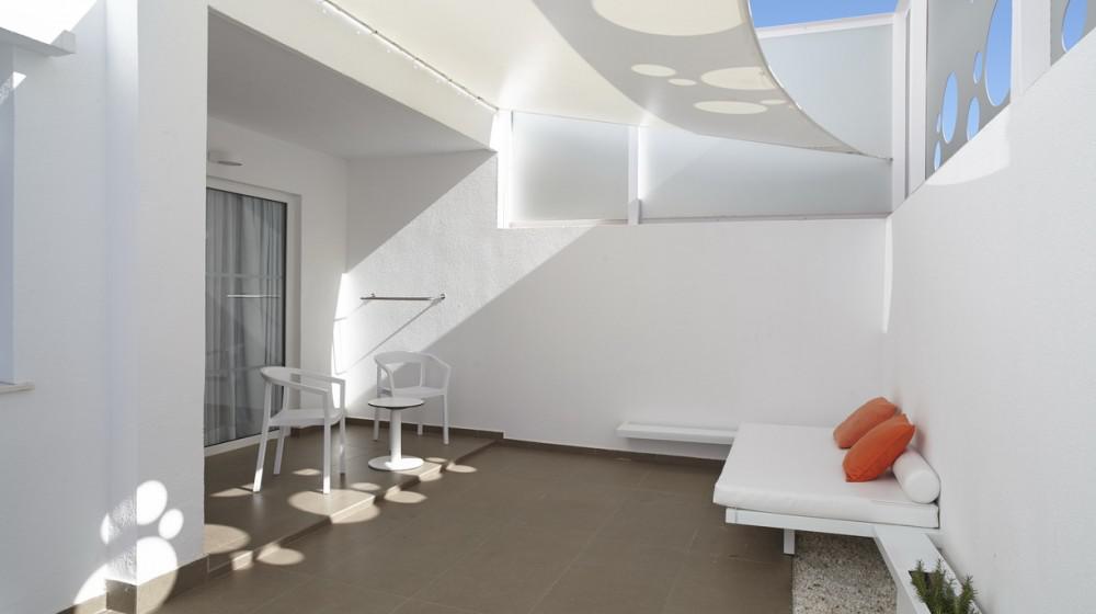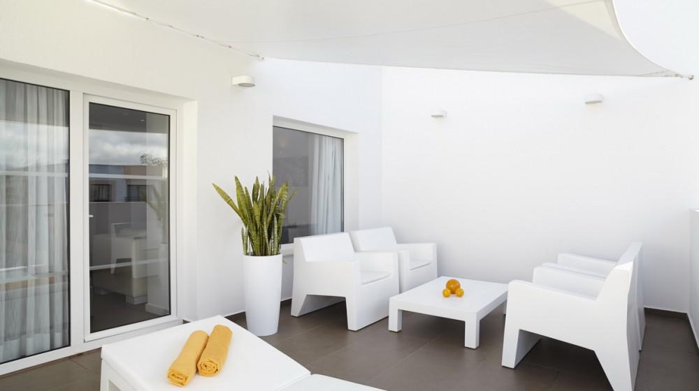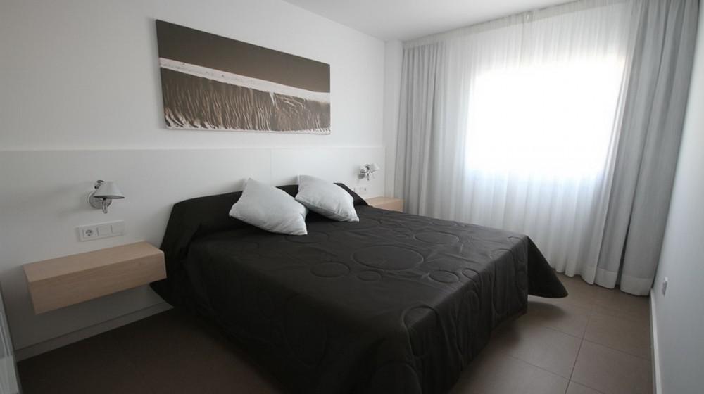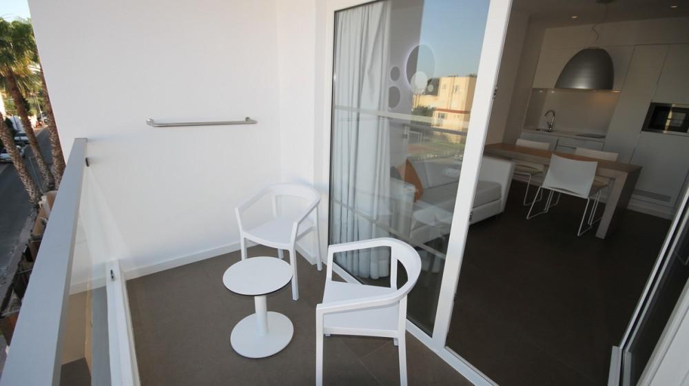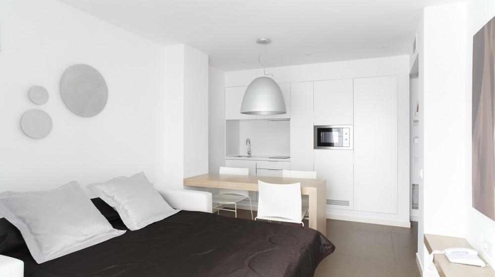 The apartments and studios are furnished with a fresh, bright, and minimalist style, typical of Ibiza. They are equipped with all modern conveniences, including fully equipped kitchenettes, private balconies, and well-defined spaces that offer exceptional comfort. The design, centered on white color and natural light, reflects the vibrant yet relaxed atmosphere of the island.