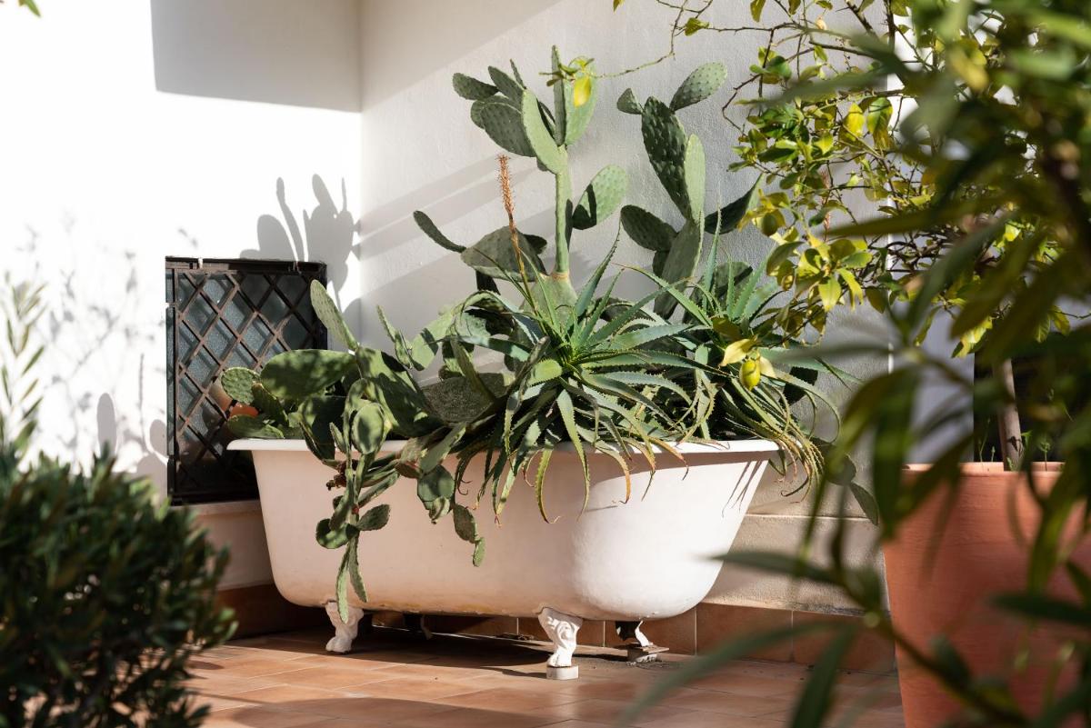 The tree‑shaded courtyard is an open‑air living room: breakfast among citrus and jasmine, reading in the shade and calm returns after a day in the city.