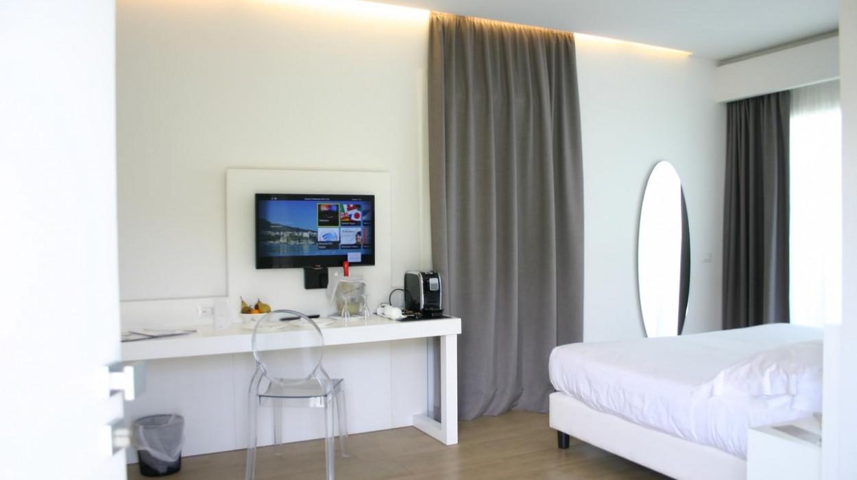 His Opinion: Abbiamo concluso il periodo di vacanza e ripreso il "lavoro" con una certa nostalgia dei luoghi, della struttura e della qualità del personale dell'Infinity Resort Tropea, ben diretto da una attenta e giovane direzione. Una struttura moderna, ariosa, pulita e molto particolare per la sua forma a "prua di nave"con terrazzamenti a verde coltivato e vasche d'acqua. Una bellissima scalinata apre l'accesso alla terrazza panoramica dove, accolti dall'elegantissimo direttore/amica Valentina, comodamente seduti e serviti, abbiamo gustato la cucina dello chef (stellato) e ammirato il panorama degradante fino al mare. All'orizzonte il vulcano Stromboli delle Eolie a rendere ancora più suggestiva l'immagine. Potrebbe sembrare una scena da romanzo ma è la realtà che si presenta agli occhi dei clienti. La nostra camera Deluxe vista mare, era molto comoda perché situata subito sopra il ristorante che si affaccia alla piscina. Pulita, spaziosa, con aria condizionata, cassetta di sicurezza, frigo bar, bagno con grande doccia munita di cromoterapia, set di cortesia di buona qualità, accappatoi, Phon, ciabattine. La portafinestra ampia e luminosa dava l'accesso a una piccola terrazza sul giardino pensile arredato con sedie e tavolino dove, volendo, si poteva consumare la prima colazione o godere in pieno relax del panorama. ( qui sarebbe utile un piccolo stendino