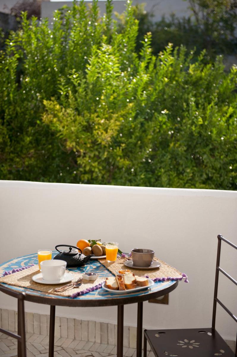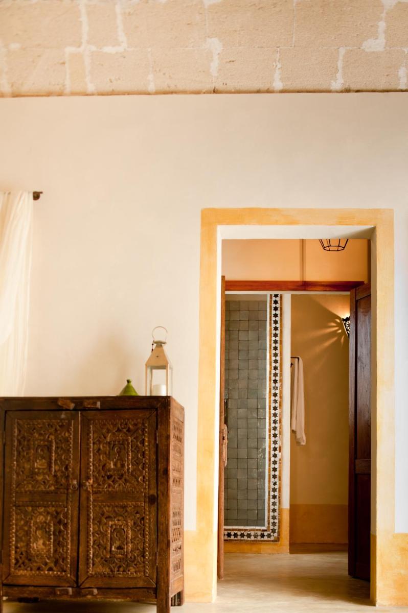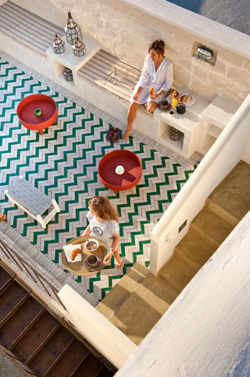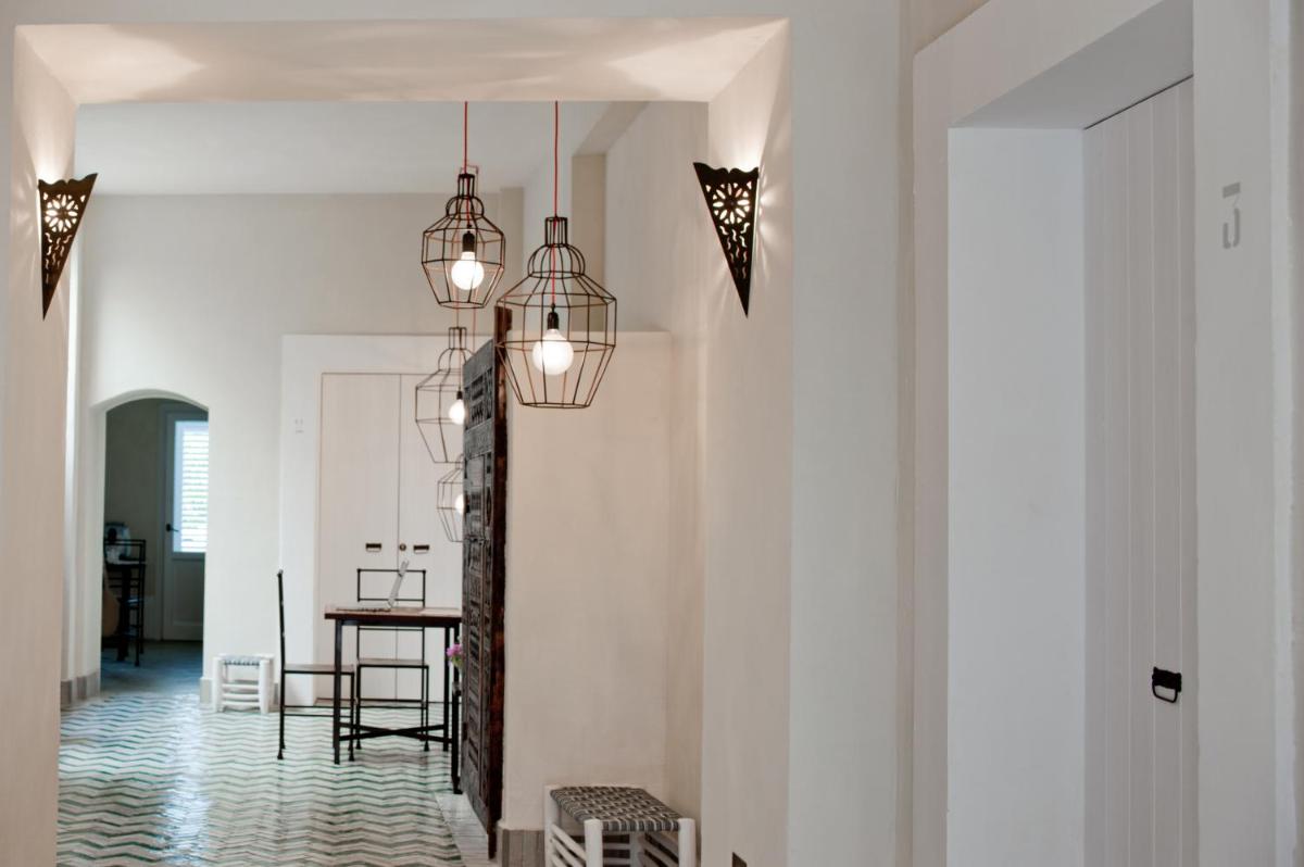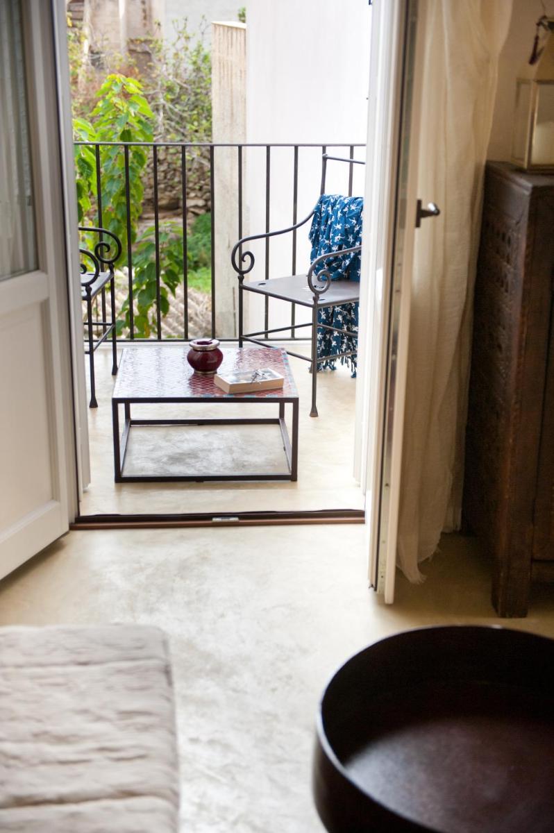 Simple, sunlit interiors with light tones, natural woods and hand‑made tiles. Some rooms feature balconies or small patios onto the courtyard.