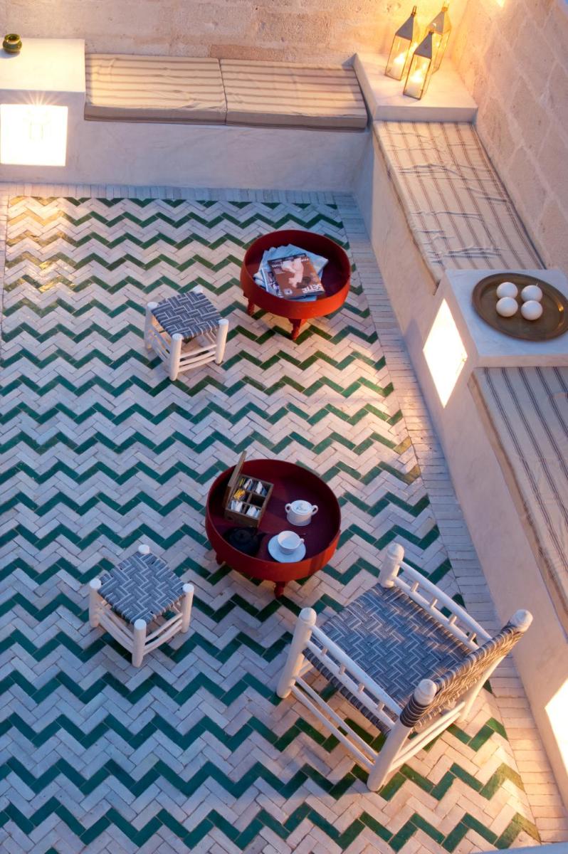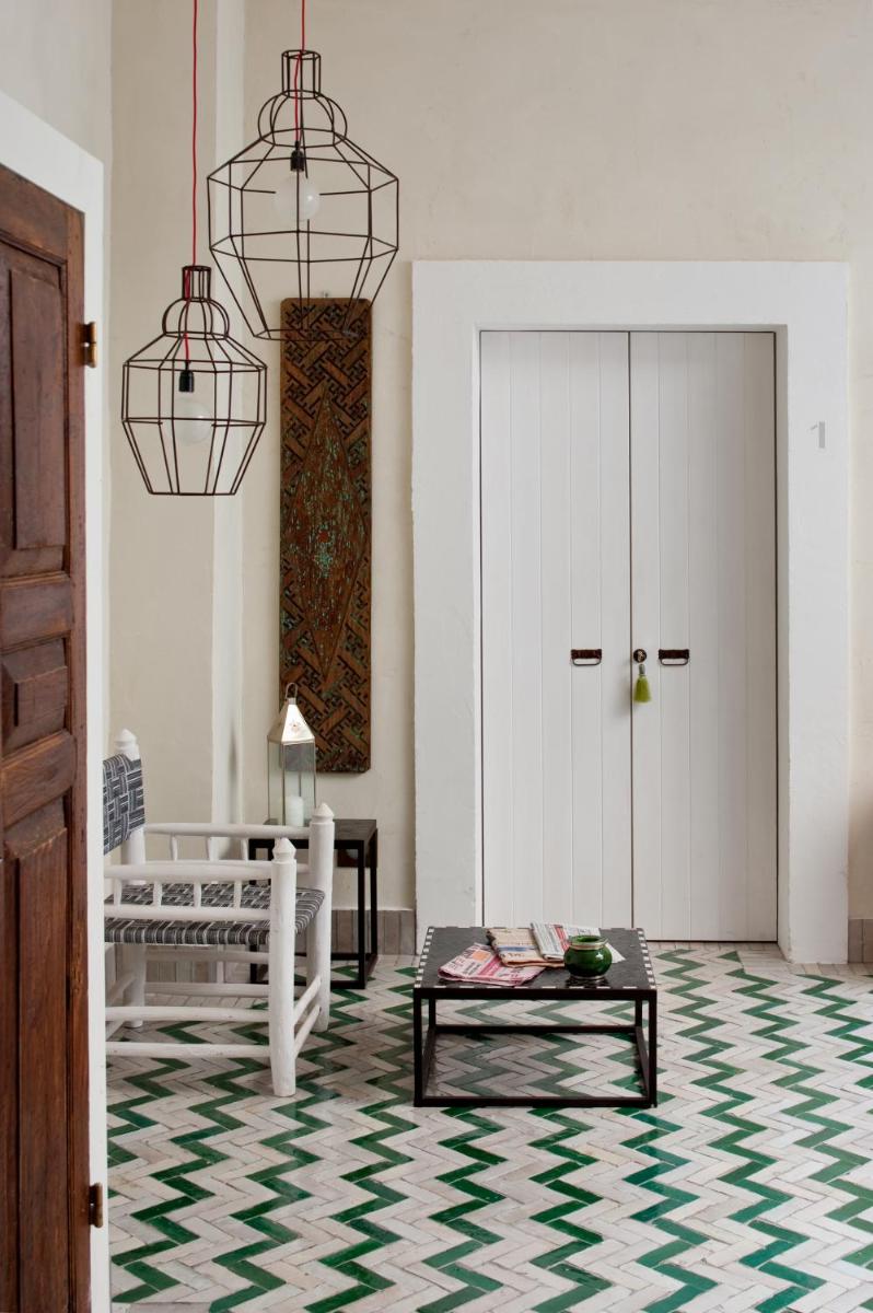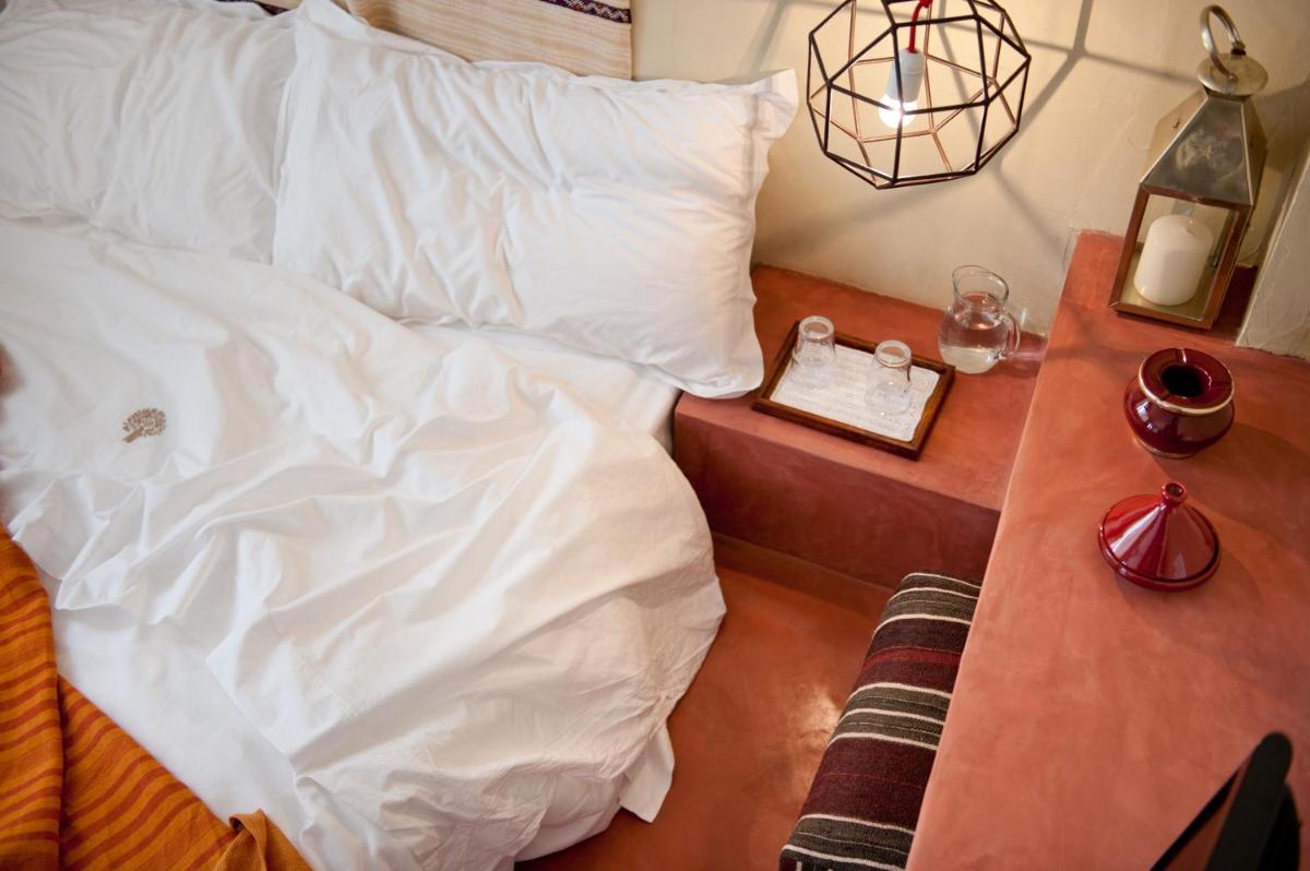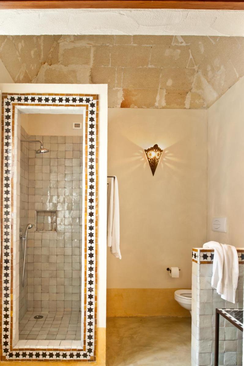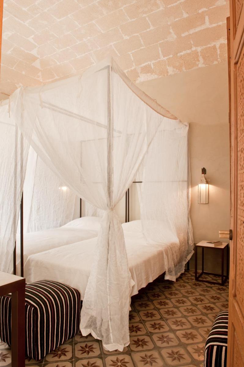 Simple, sunlit interiors with light tones, natural woods and hand‑made tiles. Some rooms feature balconies or small patios onto the courtyard.