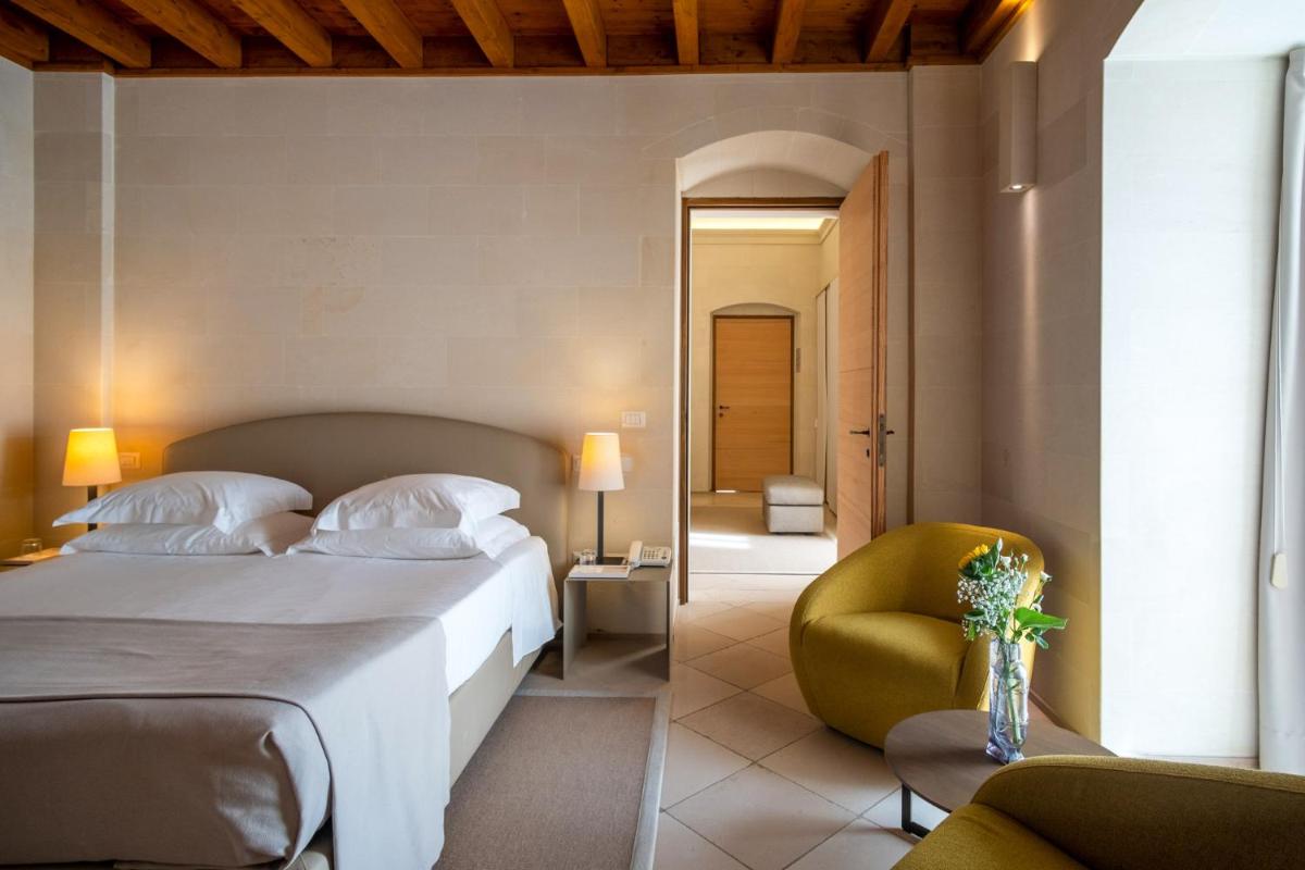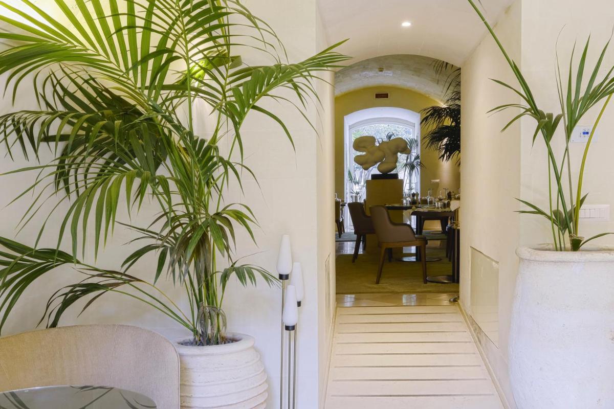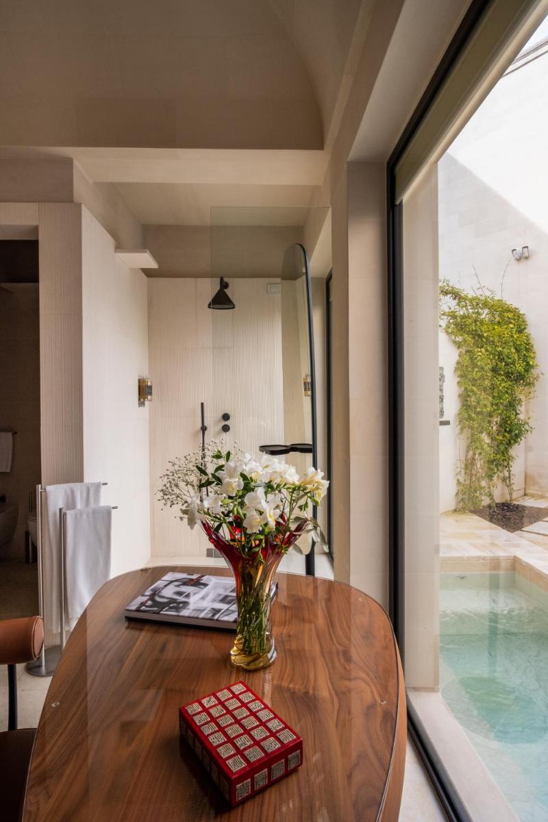 The 16 rooms and suites are veritable art galleries, designed by architect Antonio Citterio. They are characterized by natural materials like Lecce stone, chianche floors, and fine fabrics. Each accommodation is an example of sober elegance and offers the highest level of comfort, including fast Wi-Fi, a minibar, satellite TV, and spacious bathrooms. Many overlook the internal courtyards or the garden.