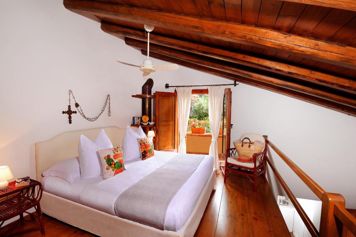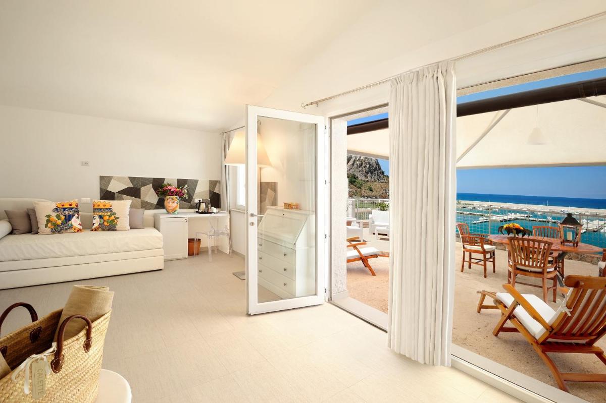 Bright interiors in natural hues; many rooms open to terraces and balconies over gardens or the sea. Comfort invites a slow cadence—generous beds, airy bathrooms, reading corners.