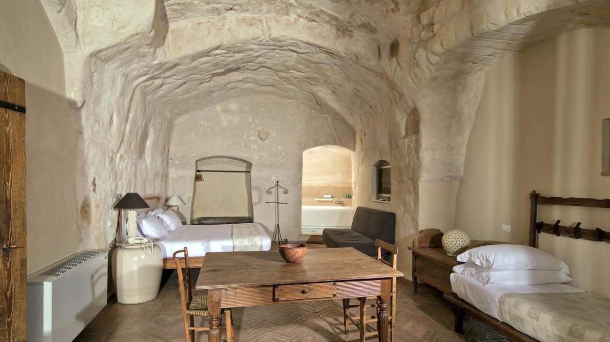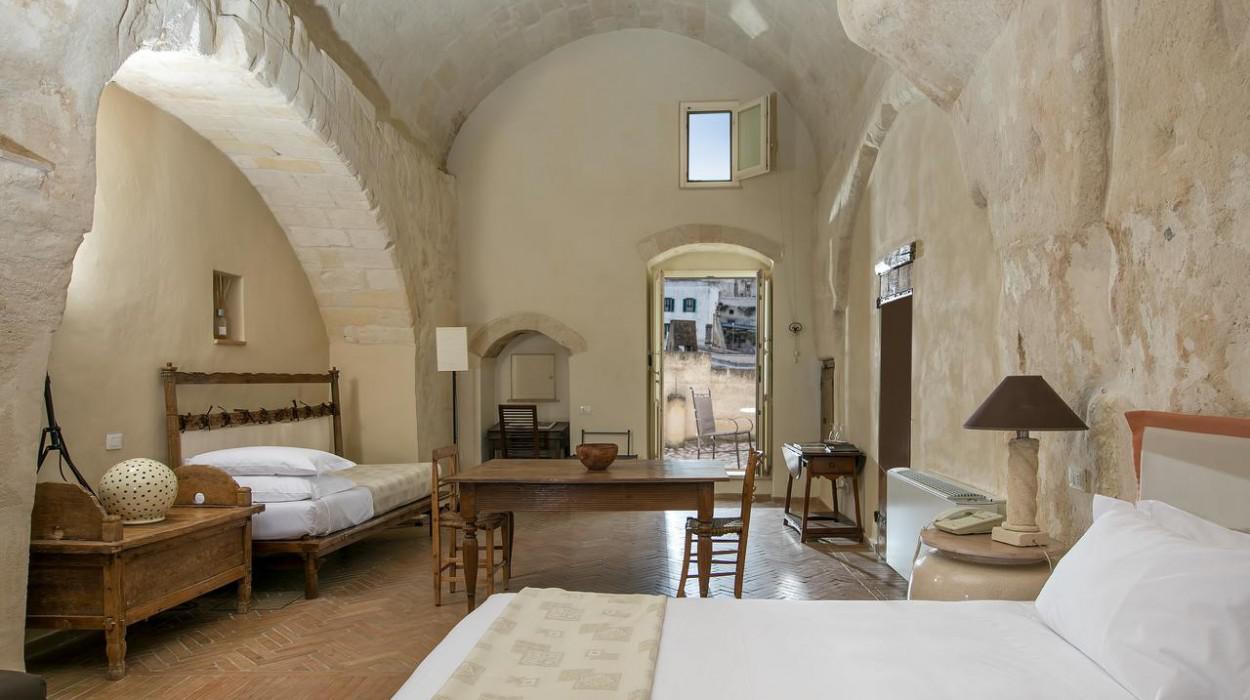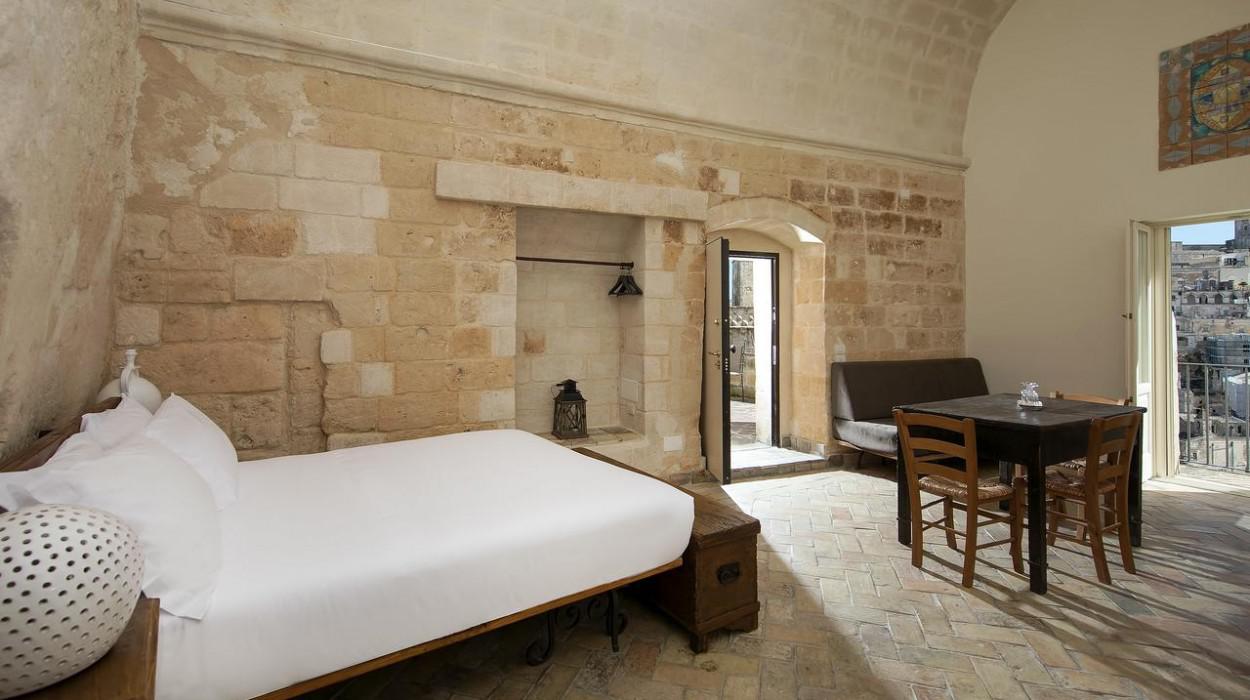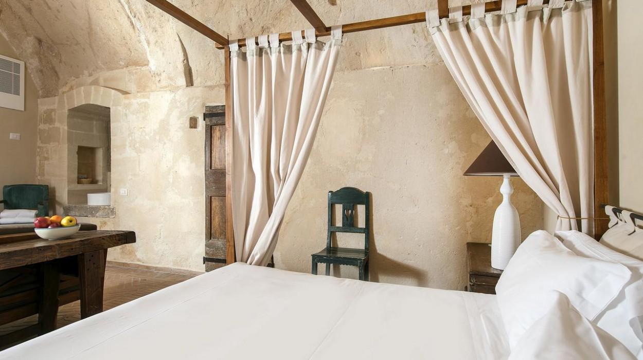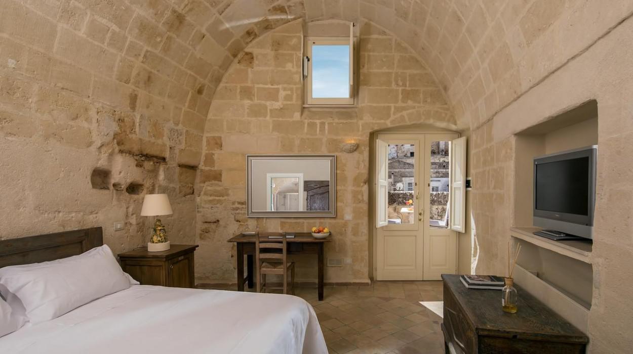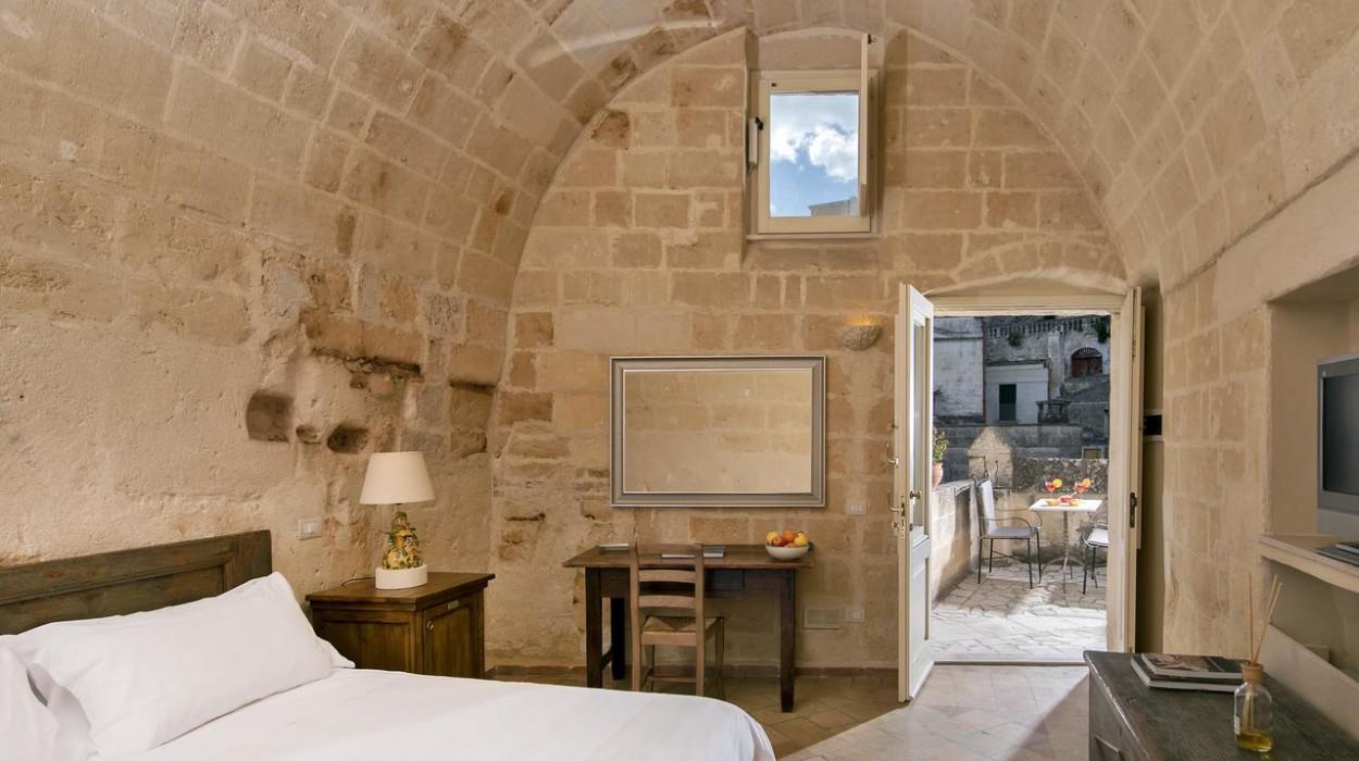 The rooms and suites are partly carved into the tuff rock, maintaining the original architecture but enriching it with elegant and modern furnishings. Many rooms offer a spectacular view of the Sassi panorama. Every accommodation is equipped with air conditioning, satellite TV, minibar, safe, and complimentary Wi-Fi. The evocative lighting enhances the unique texture of the stone walls.