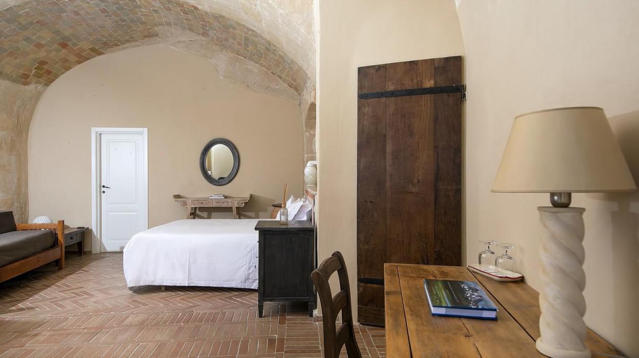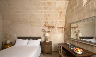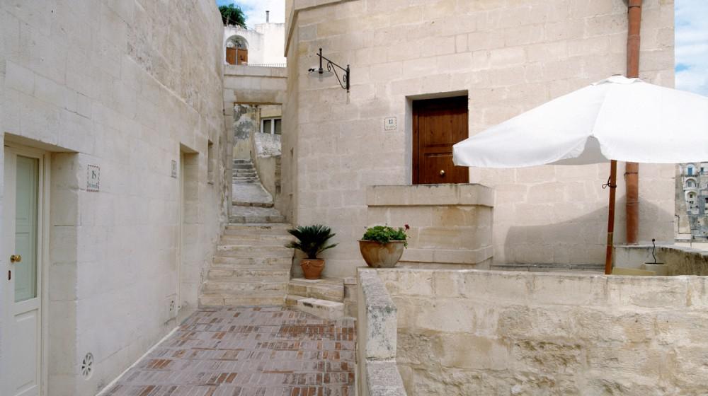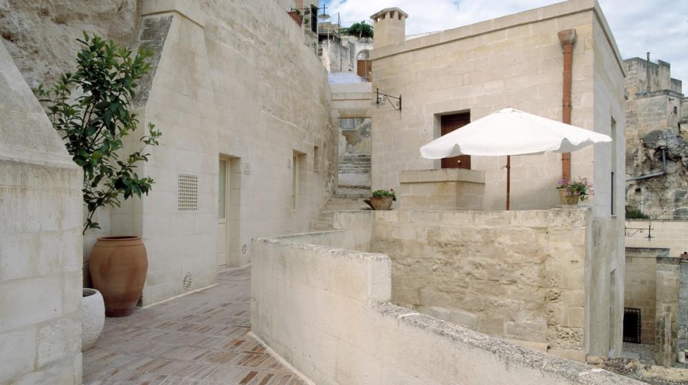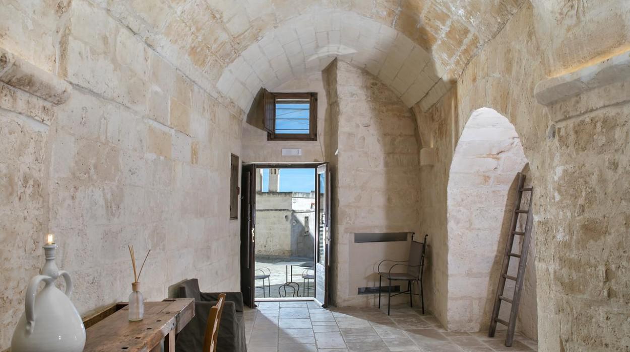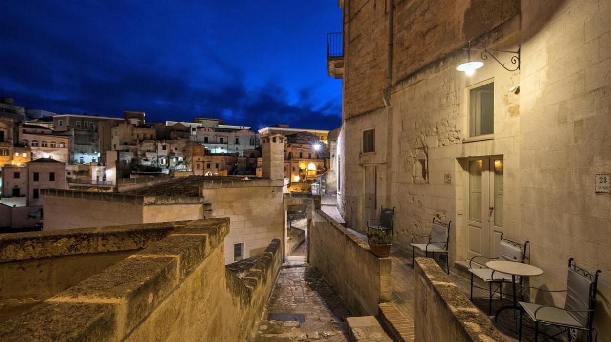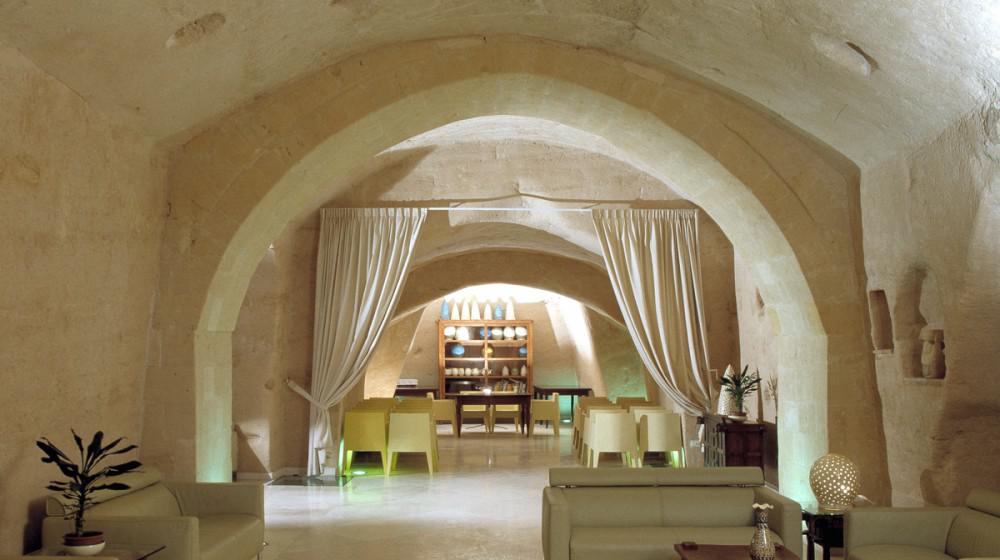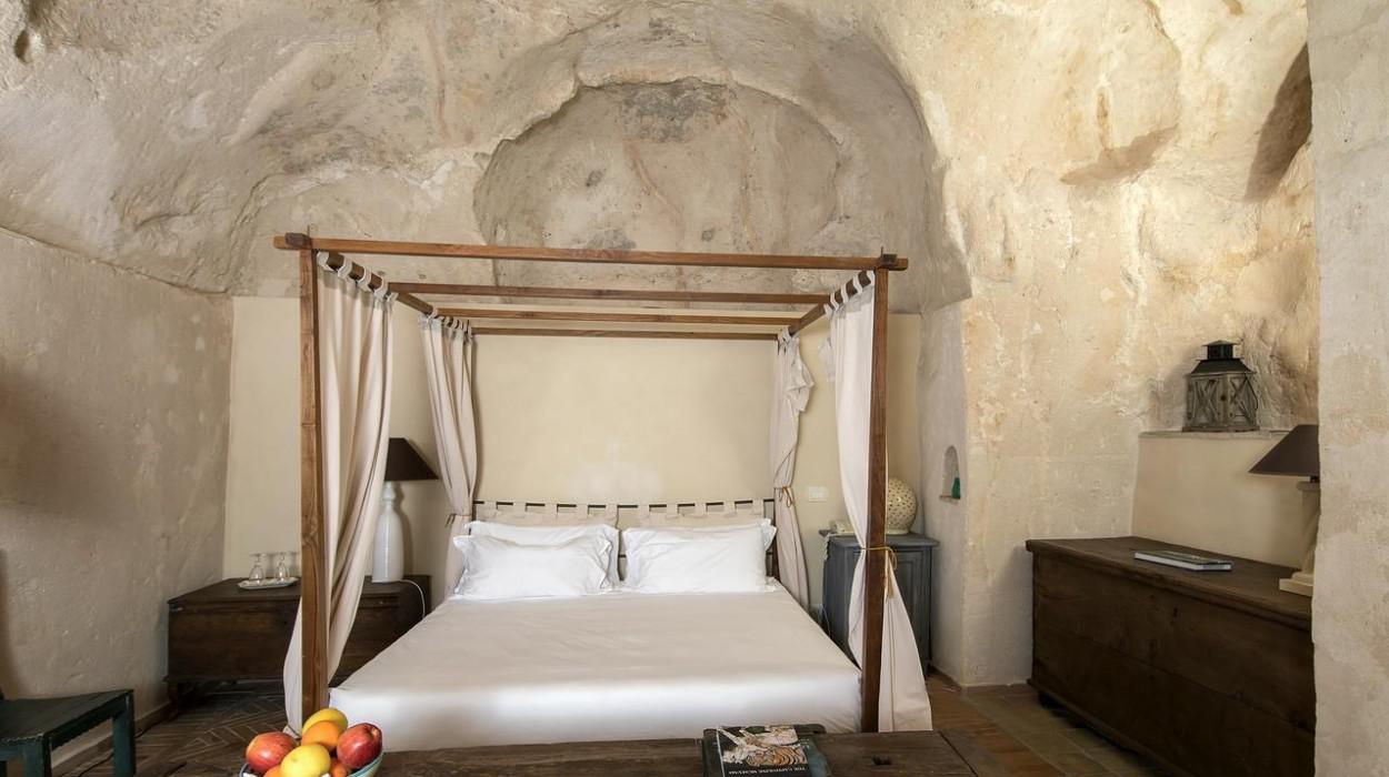 The rooms and suites are partly carved into the tuff rock, maintaining the original architecture but enriching it with elegant and modern furnishings. Many rooms offer a spectacular view of the Sassi panorama. Every accommodation is equipped with air conditioning, satellite TV, minibar, safe, and complimentary Wi-Fi. The evocative lighting enhances the unique texture of the stone walls.