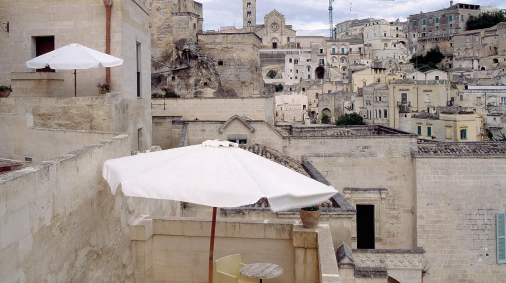 The hotel's highlight is the exclusive Thermae Romanae, a spectacular SPA set in an underground environment that evokes ancient Roman baths, complete with wellness pathways, sauna, and Turkish bath. During the summer months, guests can enjoy the outdoor panoramic pool, located on a terrace with an unparalleled view of the Cathedral and the Sasso Barisano.
