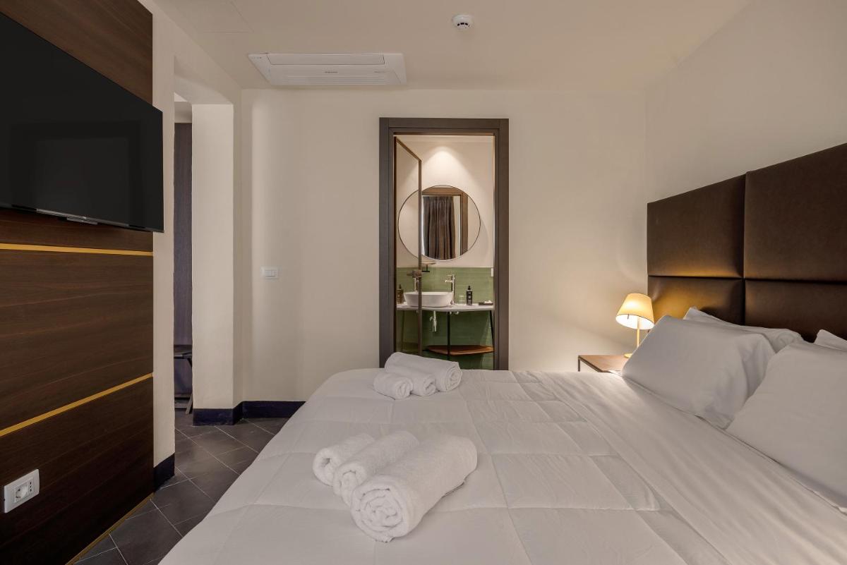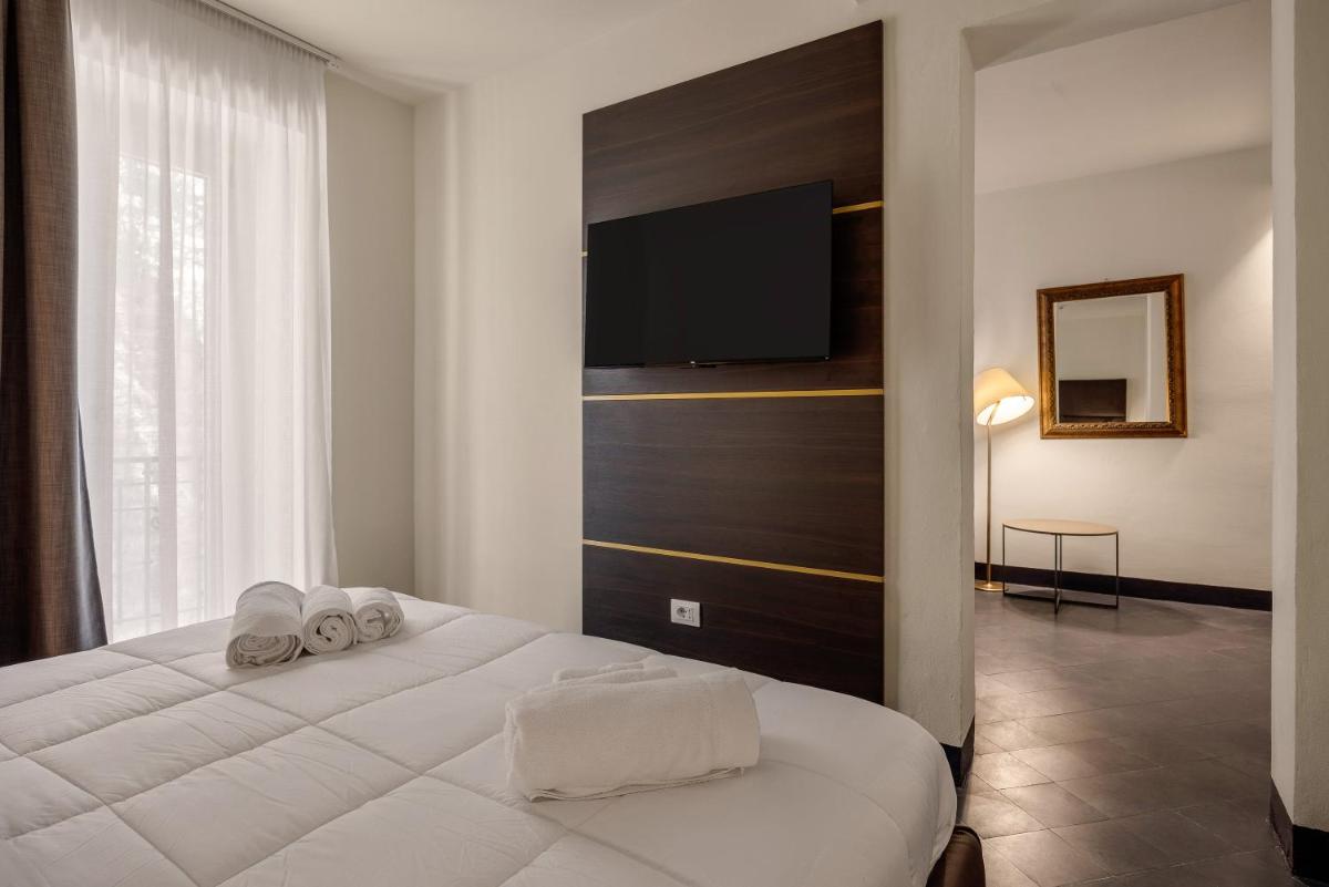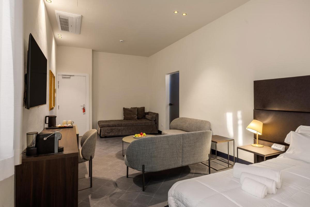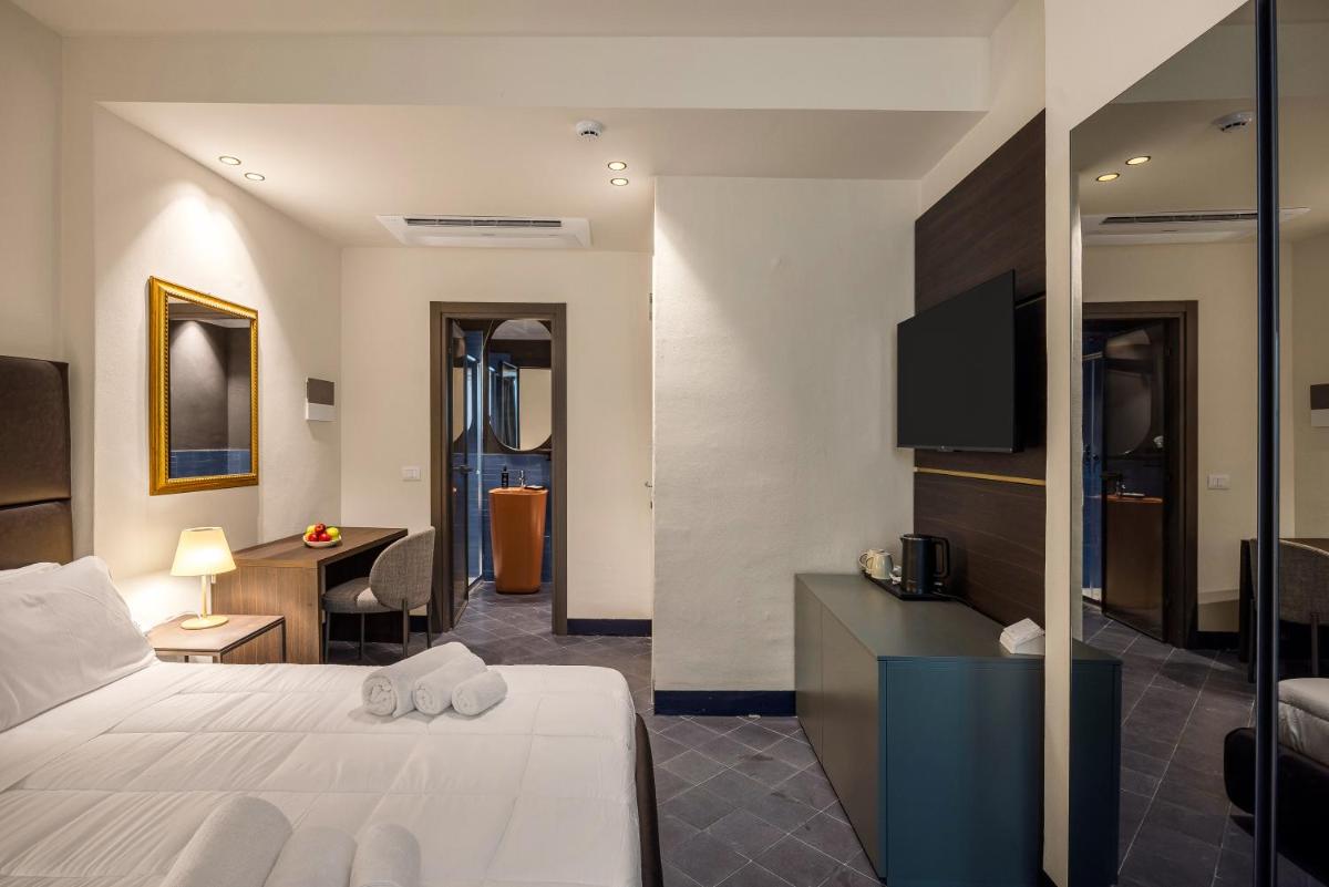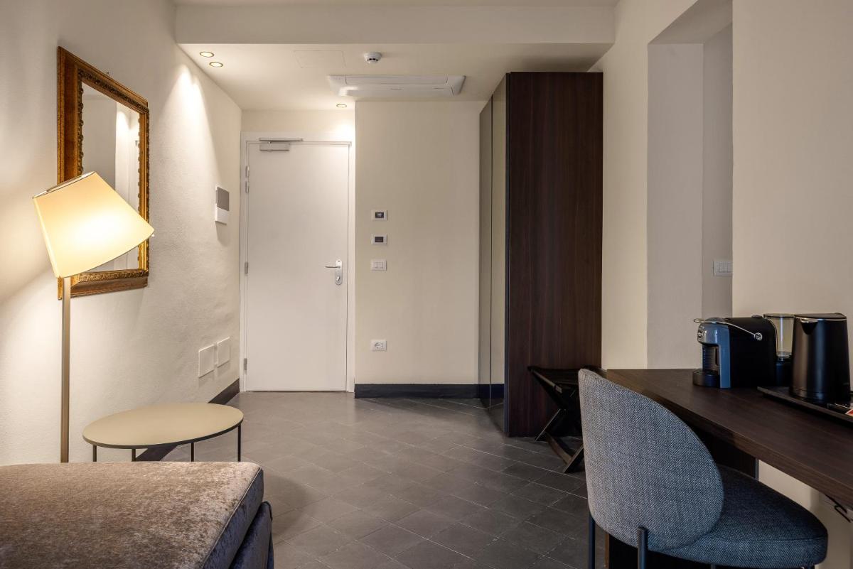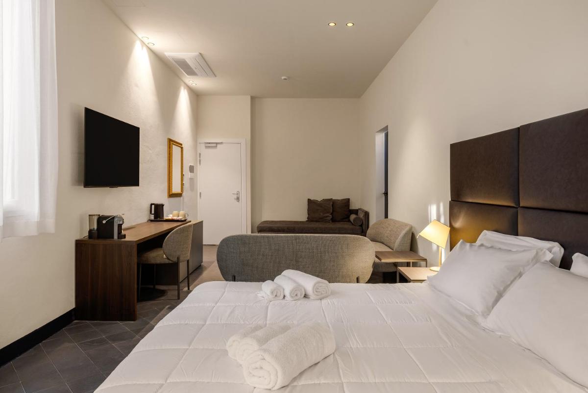 The hotel offers 19 individually styled rooms and suites combining original architectural features—such as frescoed ceilings and wooden beams—with modern comforts including air conditioning, flat‑screen TV, minibar, Wi‑Fi and a private bathroom. Select rooms offer courtyard or city views.