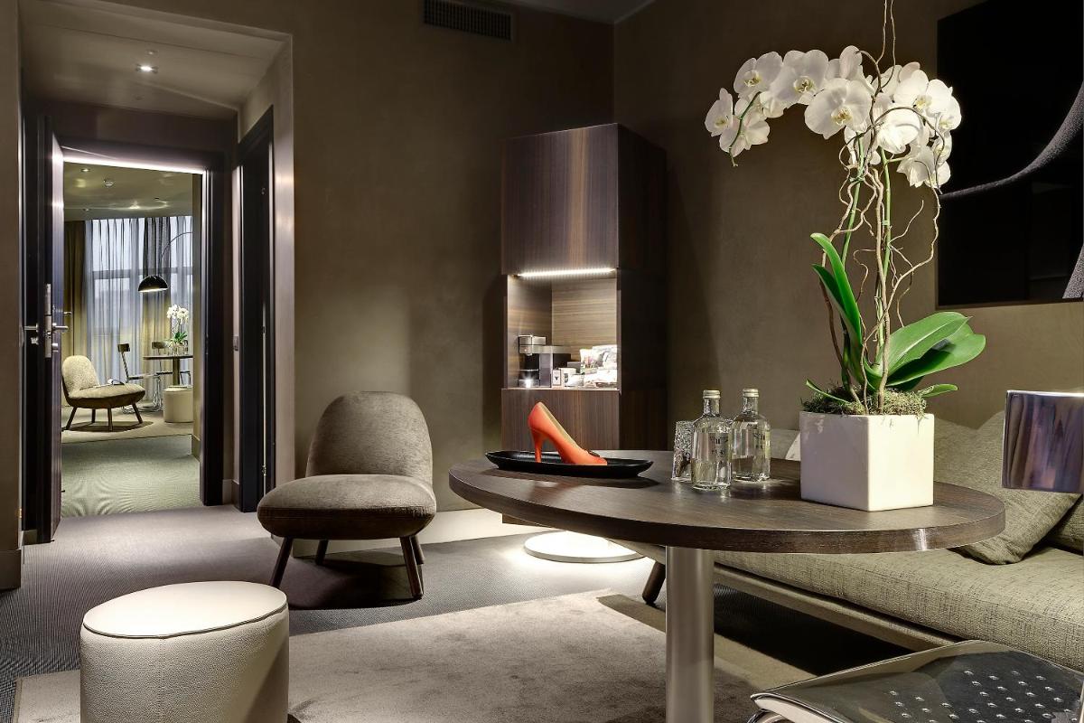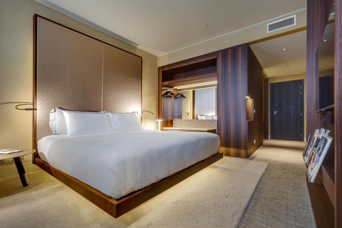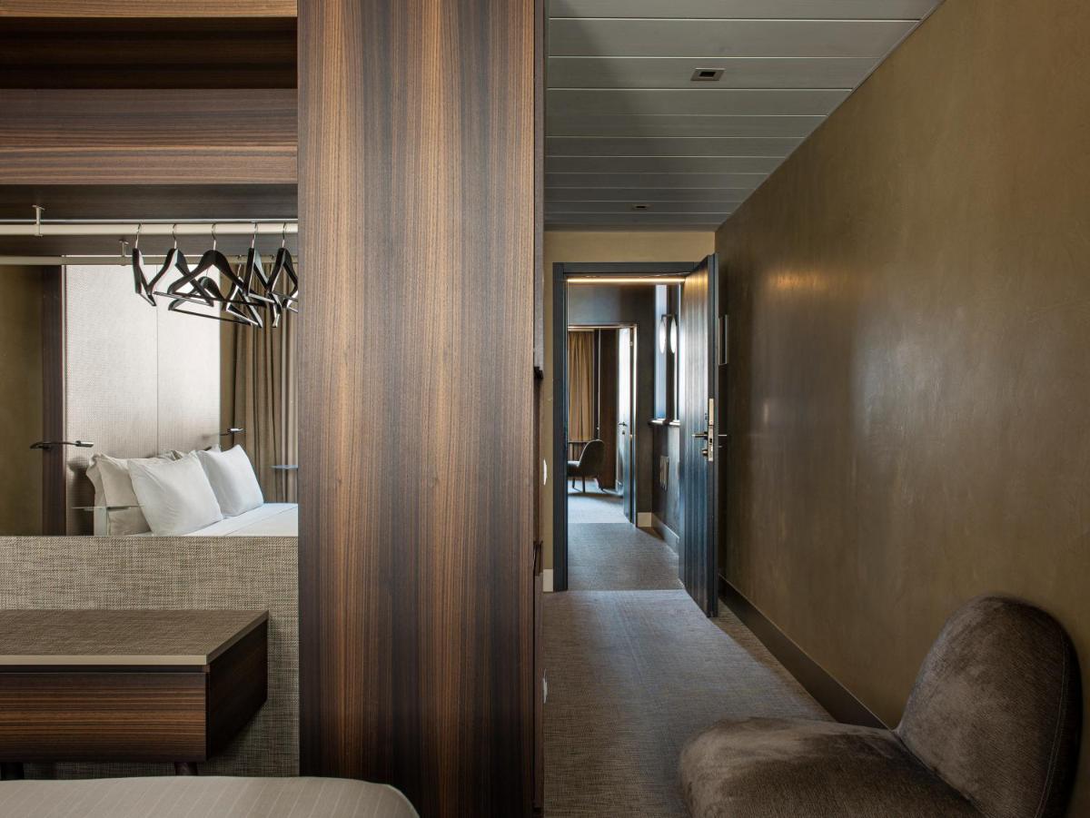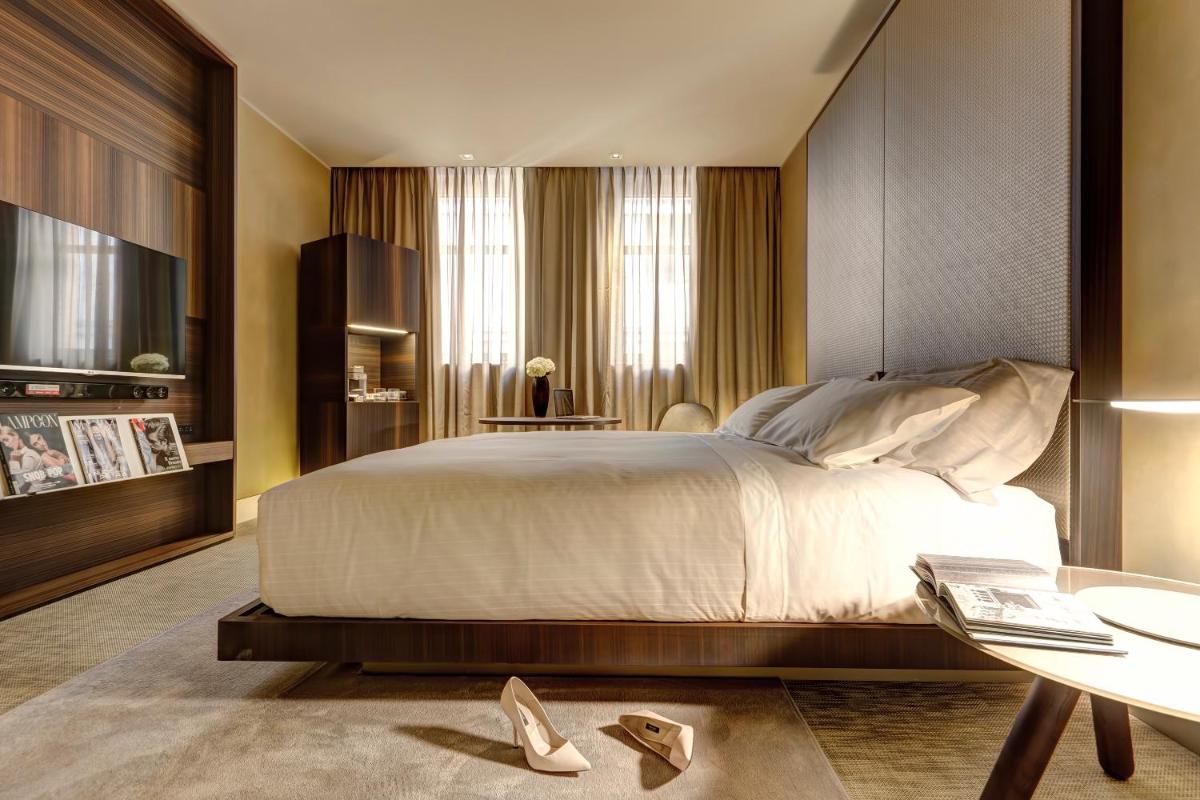 The 132 rooms and suites are designed with a clean, contemporary style, featuring neutral tones, eucalyptus wood furnishings, and designer lamps (such as Oluce and Flaminia). They are equipped with all the comforts of a 5-star hotel: Egyptian cotton linens, minibar, Smart LED TV, and free WiFi. The most luxurious suites offer a dedicated butler service (Aura Manager), marble bathrooms, and large private terraces with spectacular views of the city and the Alps on clear days.