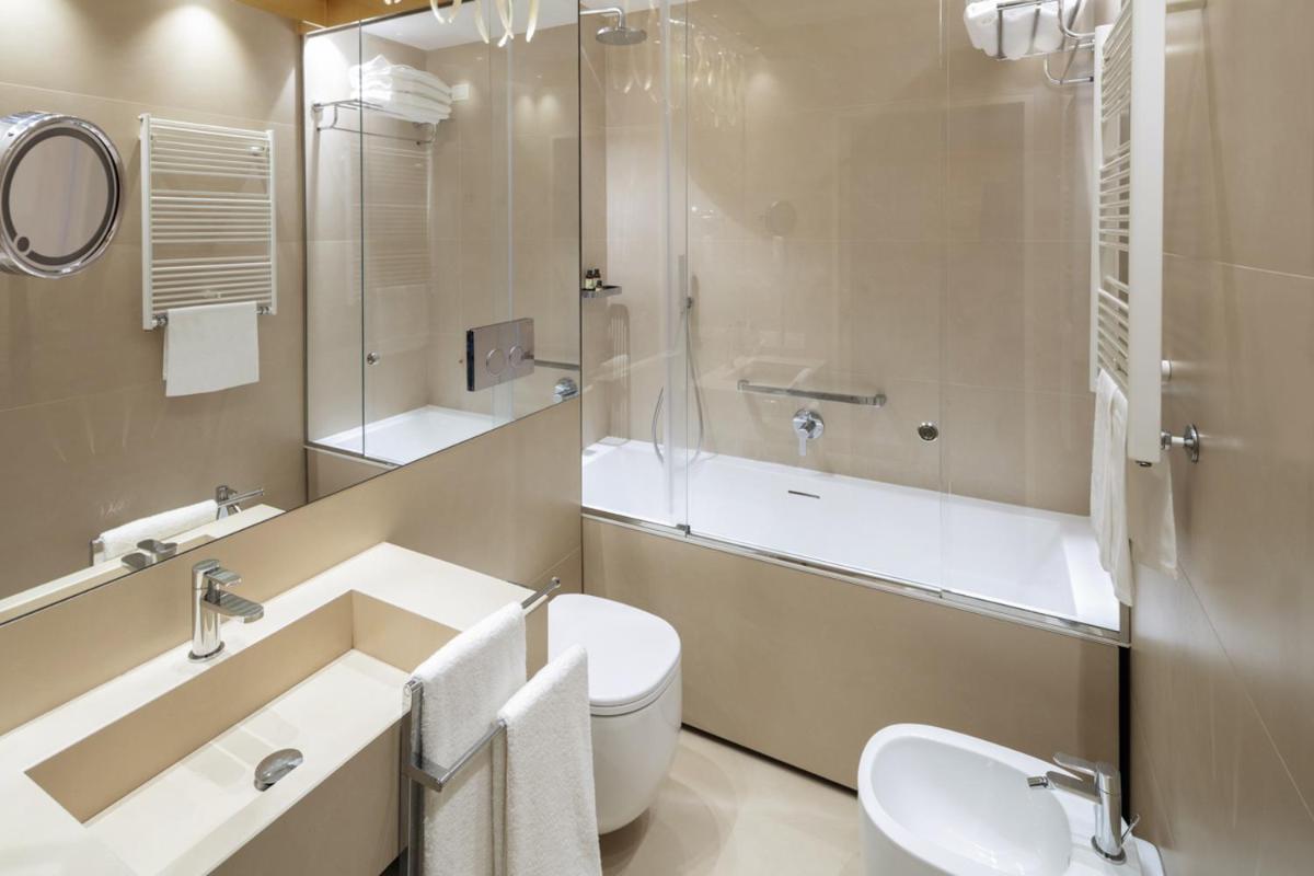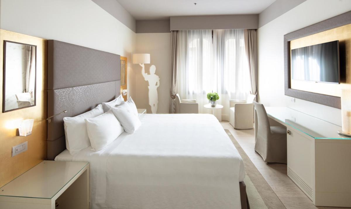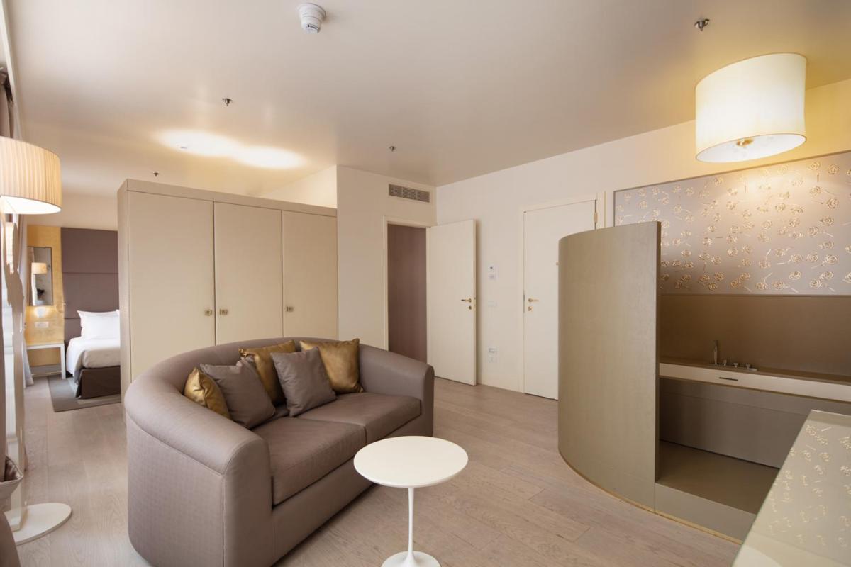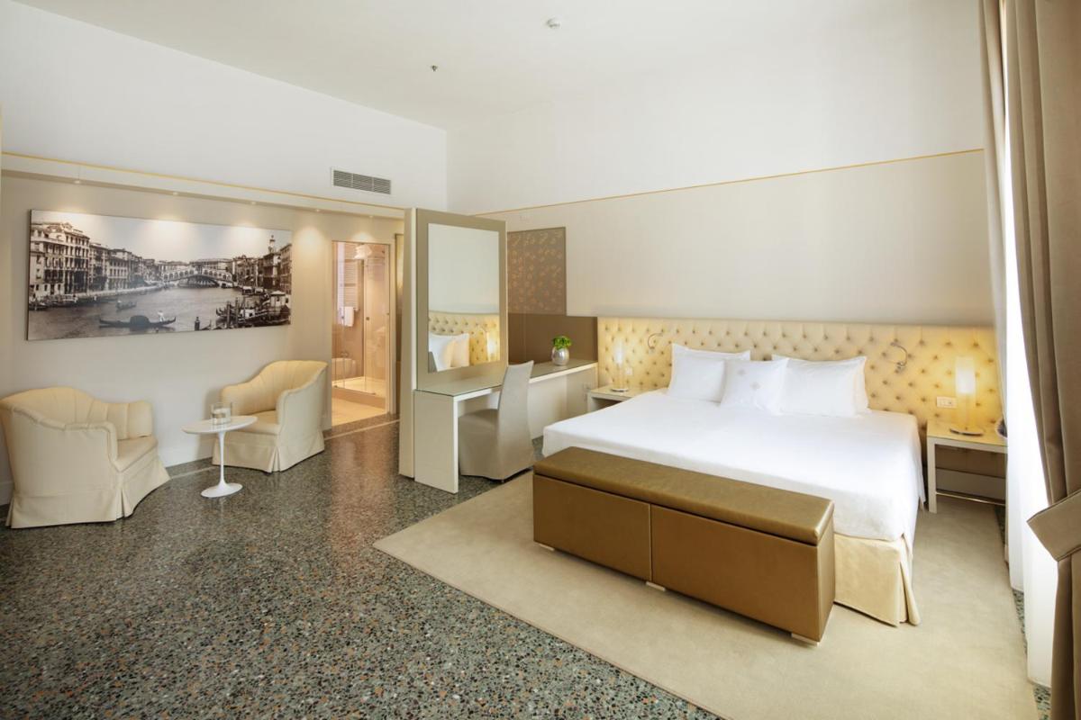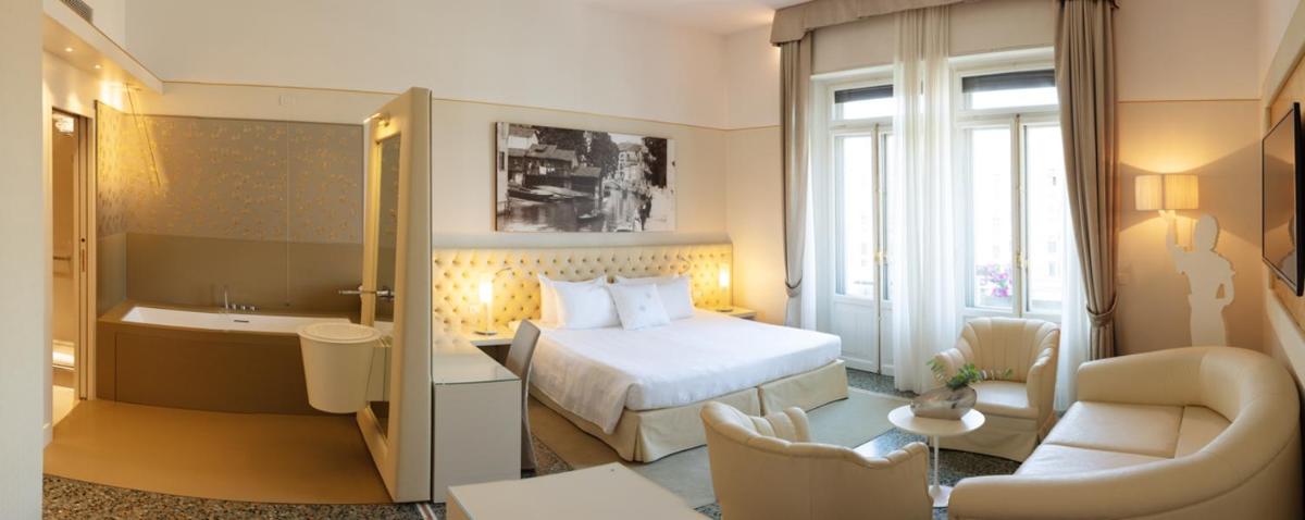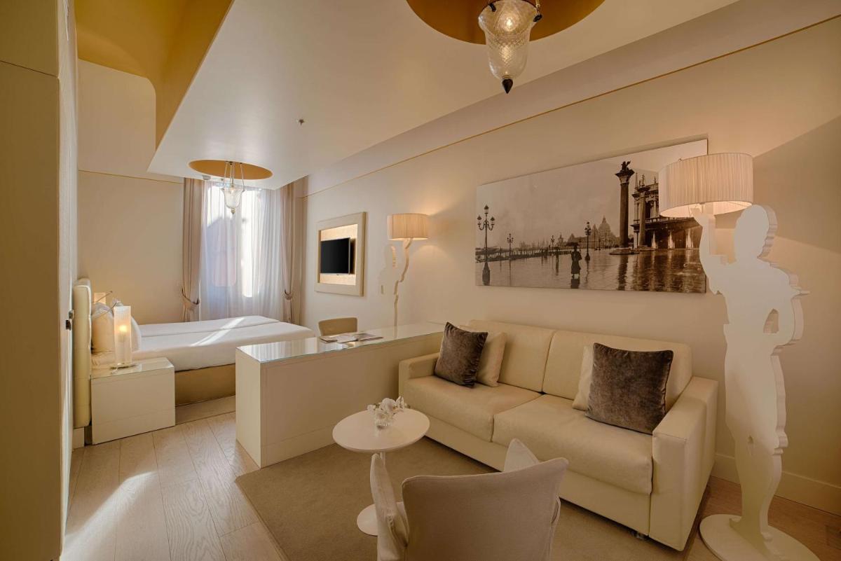 Spacious, air-conditioned junior suite decorated with white and gold color schemes. Combining Venetian-style details with modern touches, it comes with a living area with armchairs and sofa, a mini-bar, and both bathrobes and slippers. High-speed WiFi is free. Also includes a kettle and coffee machine.