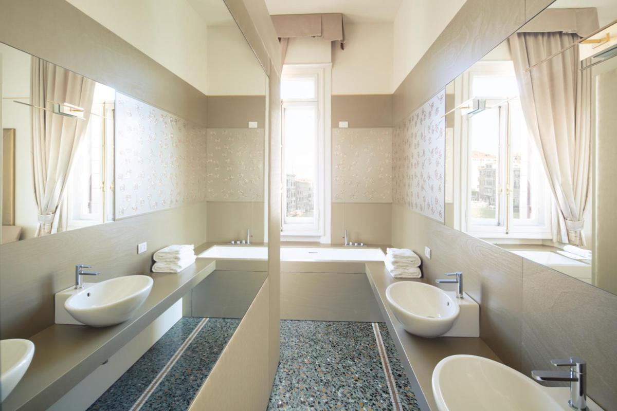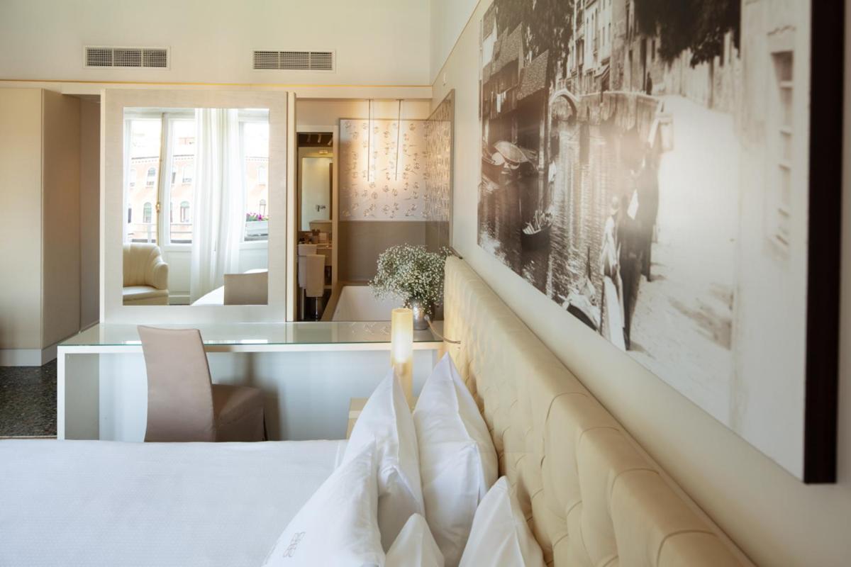 Spacious, air-conditioned junior suite with stunning views of the Grand Canal and decorated with white and gold color schemes. Combining Venetian-style details with modern touches, it comes with a living area with armchairs and sofa, a mini-bar, and both bathrobes and slippers. High-speed WiFi is free. Also includes a kettle and coffee machine.