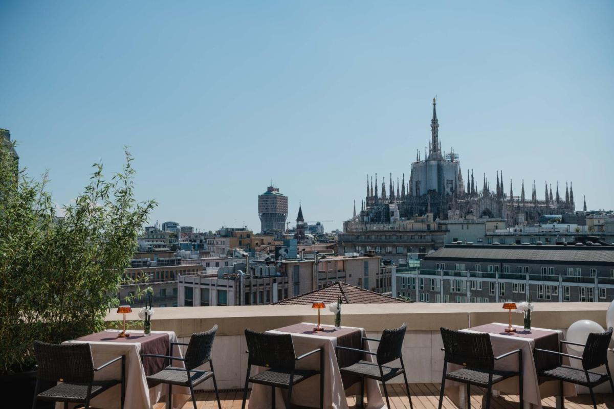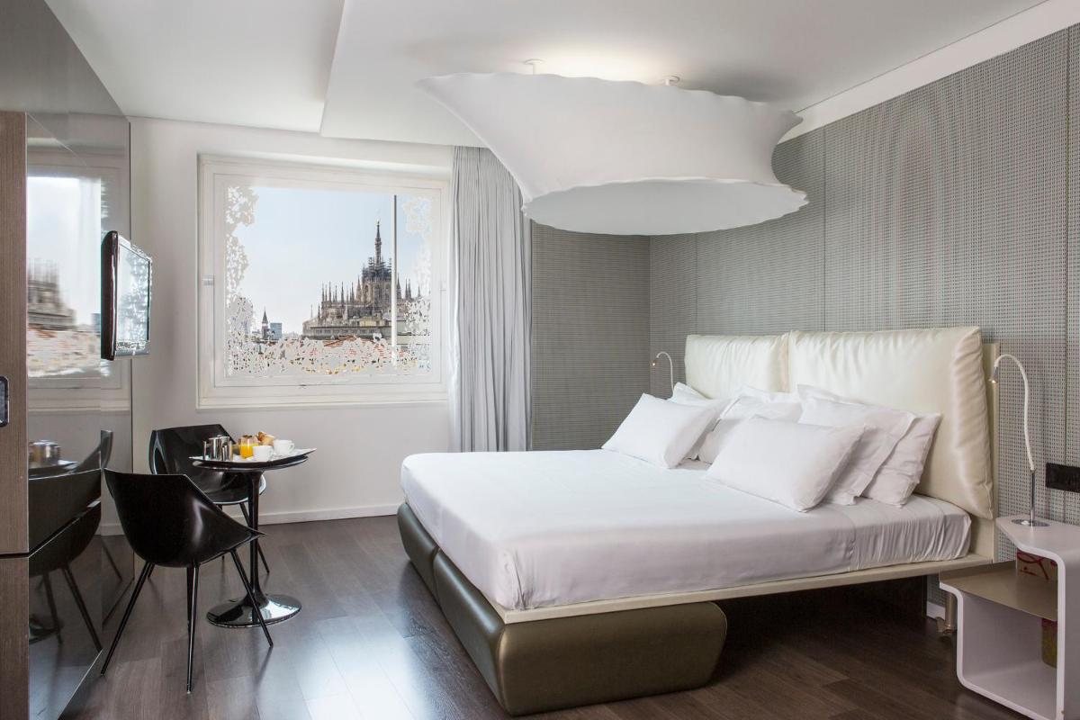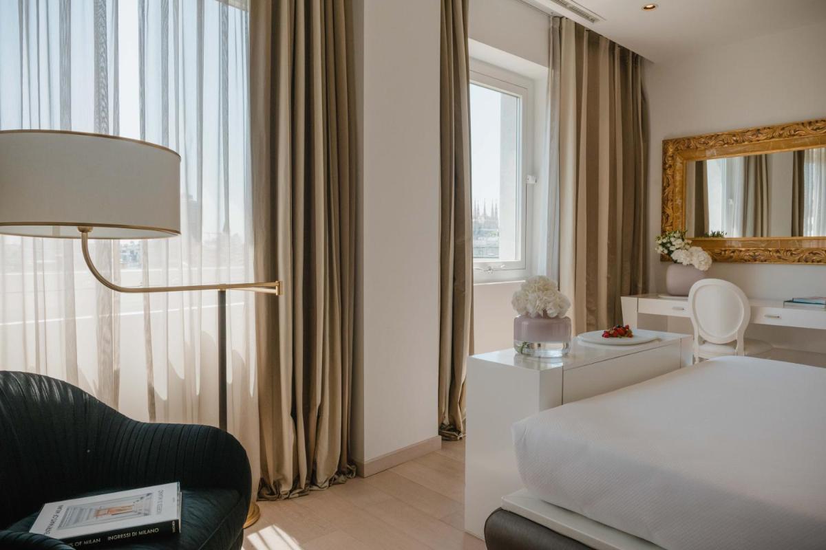 The hotel features 154 soundproofed rooms and suites, each furnished with modern design, elegant furniture, and artistic details. The accommodations are designed to ensure maximum comfort and a sense of exclusivity. Types range from luxurious rooms to exclusive suites that, in some cases, offer a view of the Duomo or private balconies. All accommodations are equipped with: Luxury amenity kit (e.g., Acqua di Parma), minibar, tea/coffee making facilities, desk, satellite TV, and Free Wi-Fi.