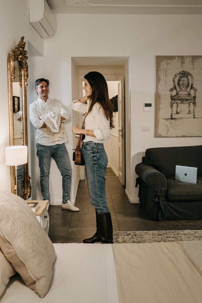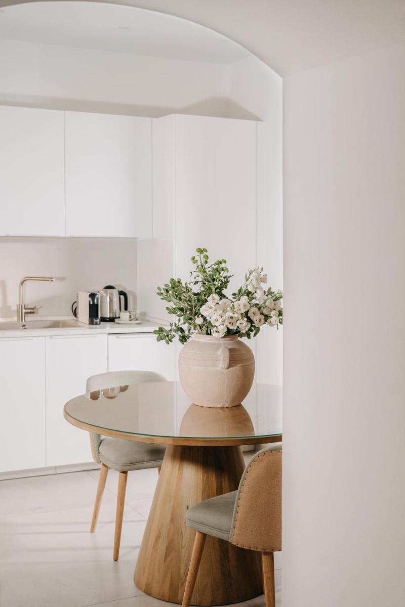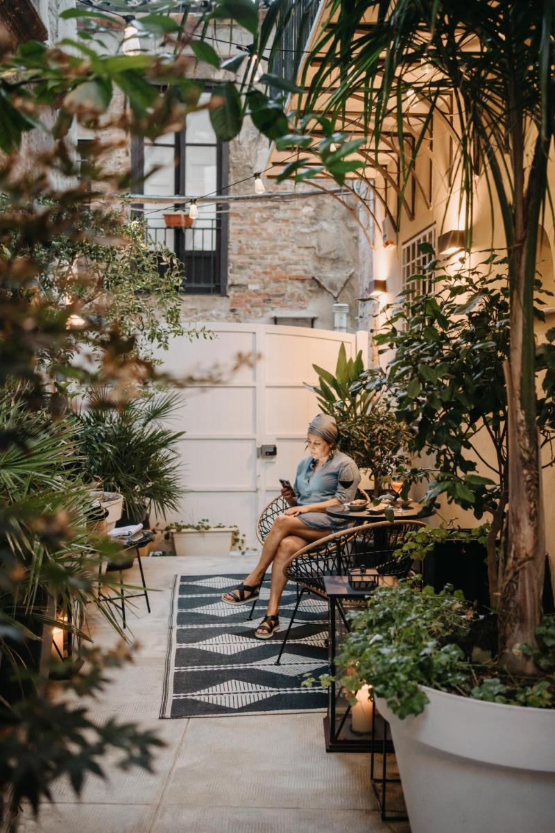 Natural materials, light woodwork and contemporary furnishings set bright interiors; some rooms open to balconies over the old town lanes.