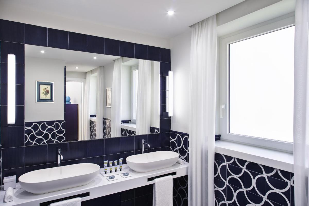 The garden hosts a scenic pool shaded by a large magnolia tree, with sun loungers and lounge areas. The “P Garden Lounge Bar” offers relaxed drinks, while the “Campanella by Quattro Passi” restaurant serves refined Mediterranean cuisine by Michelin-starred chef Fabrizio Mellino.