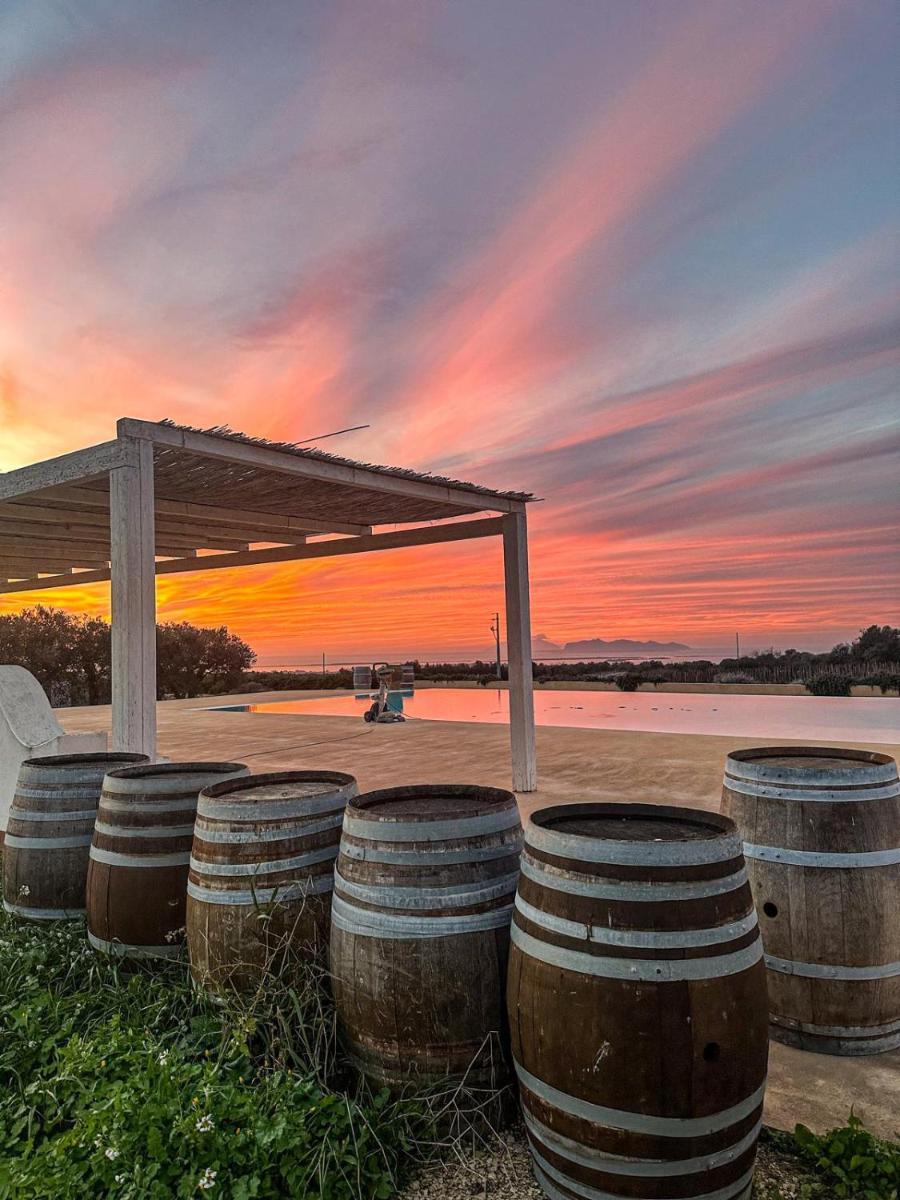 Outdoor pool among the vines with sun deck, loungers and towels. Lounge corners for reading, sipping a glass and enjoying the Egadi sunset palette.