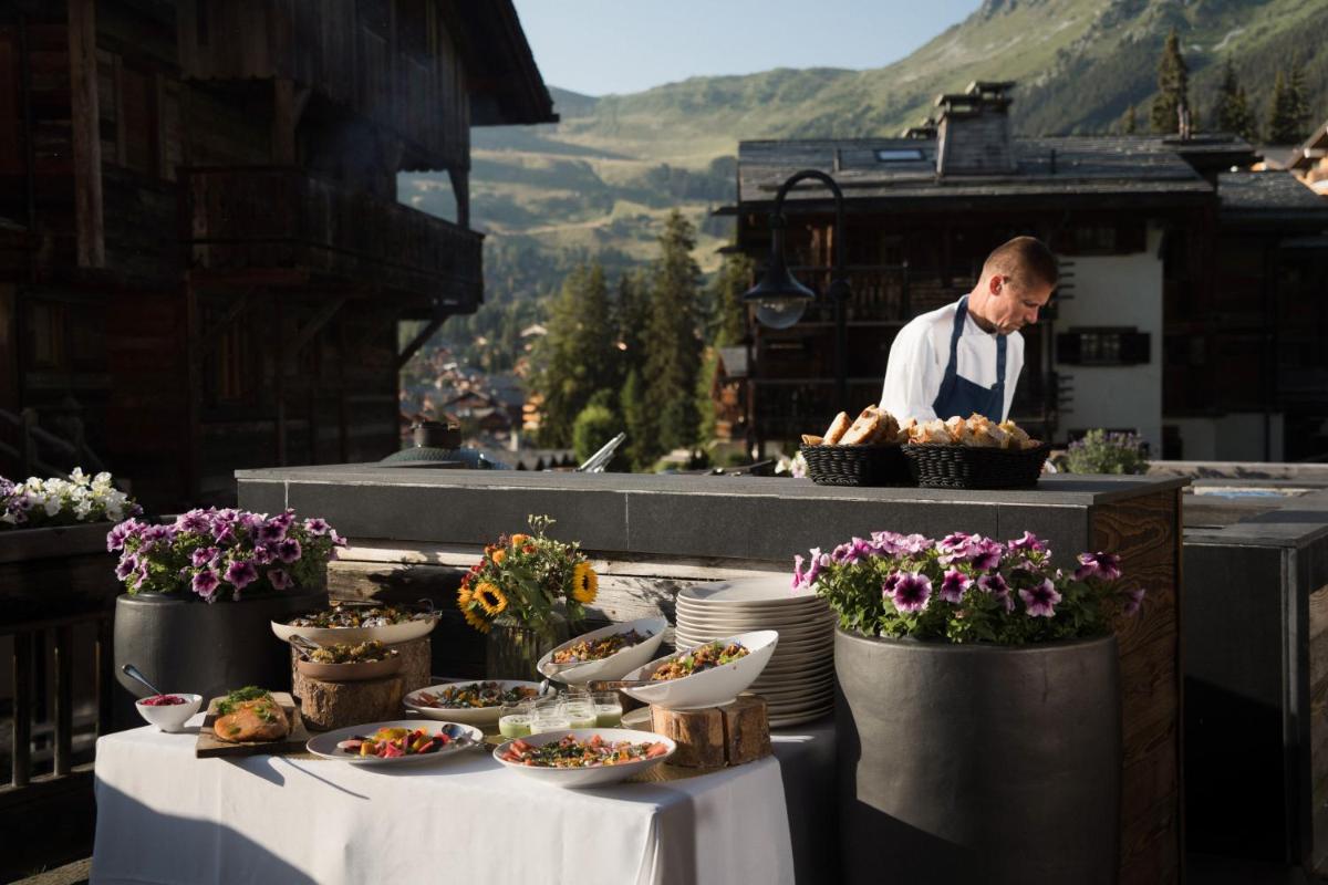 The stay includes a full-service dining experience, with dedicated chefs creating personalized menus, celebrating Swiss and international cuisine using fresh, local ingredients. For relaxation, guests can enjoy the indoor pool, two hot tubs (one indoor and one outdoor), a steam room, and a full spa, transforming the stay into a pure wellness retreat.
