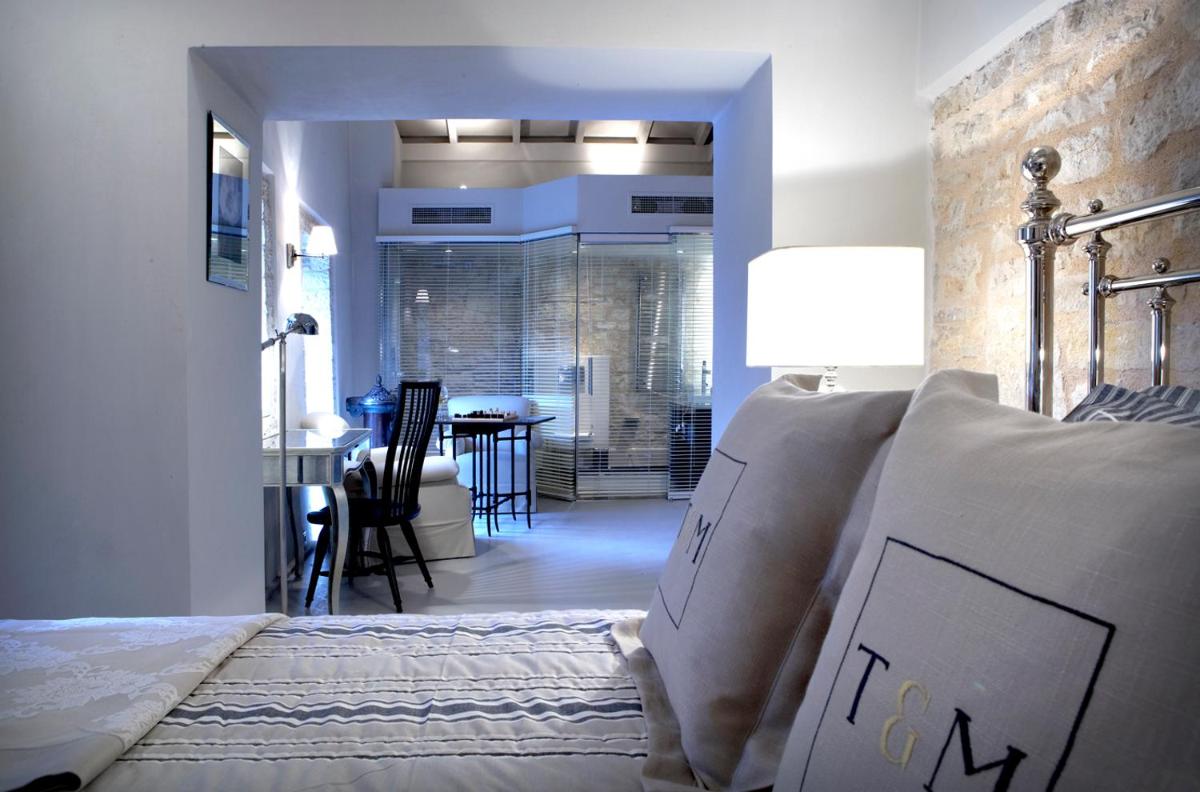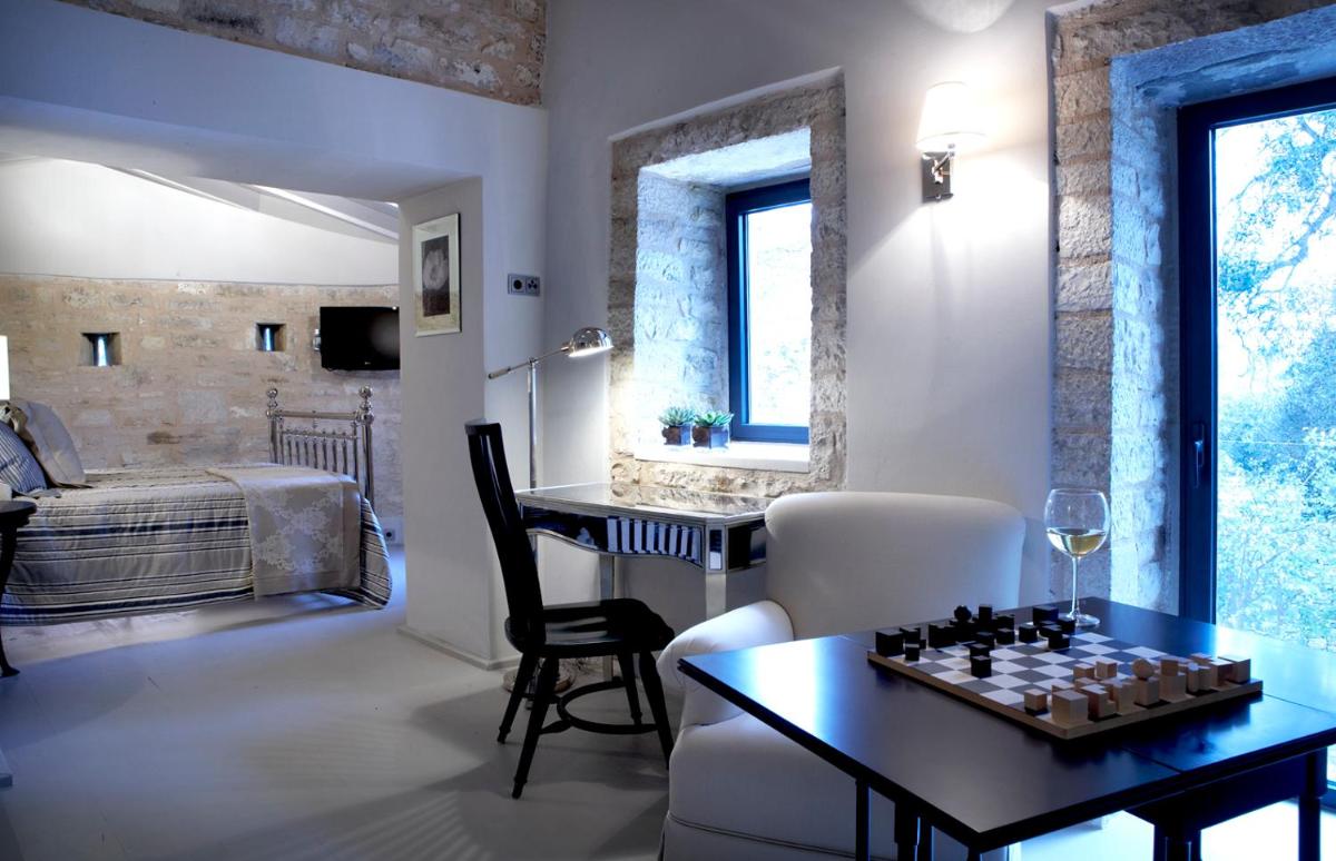 The interiors are a tribute to raw materials: the original exposed stone coexists with light wood furnishings and natural fabrics. An architectural gem is the integration of the tower's ancient defensive elements with large windows that frame the greenery of ancient olive trees, allowing Mediterranean light to dance with the textures of historical walls.