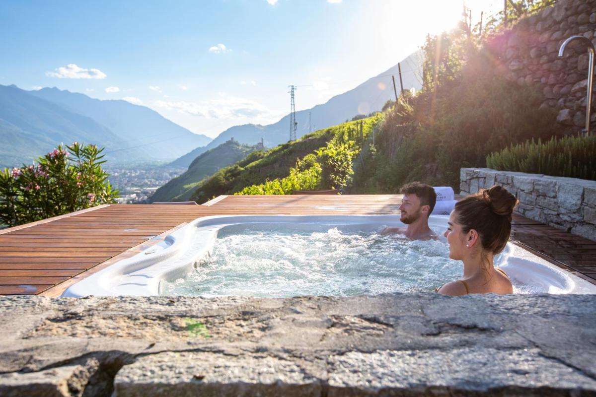 The Wine Hotel Retici Balzi is an elegant 4-star hotel located in Poggiridenti (Sondrio), in the heart of the famous terraced vineyards of Valtellina, recognized as a UNESCO World Heritage site. Its mid-hill position offers a breathtaking panoramic view of the valley and the Rhaetian Alps, making it the ideal destination for wine tourism enthusiasts and those seeking tranquility. The structure combines modern and refined design with traditional Alpine architecture, creating an intimate and welcoming atmosphere.
